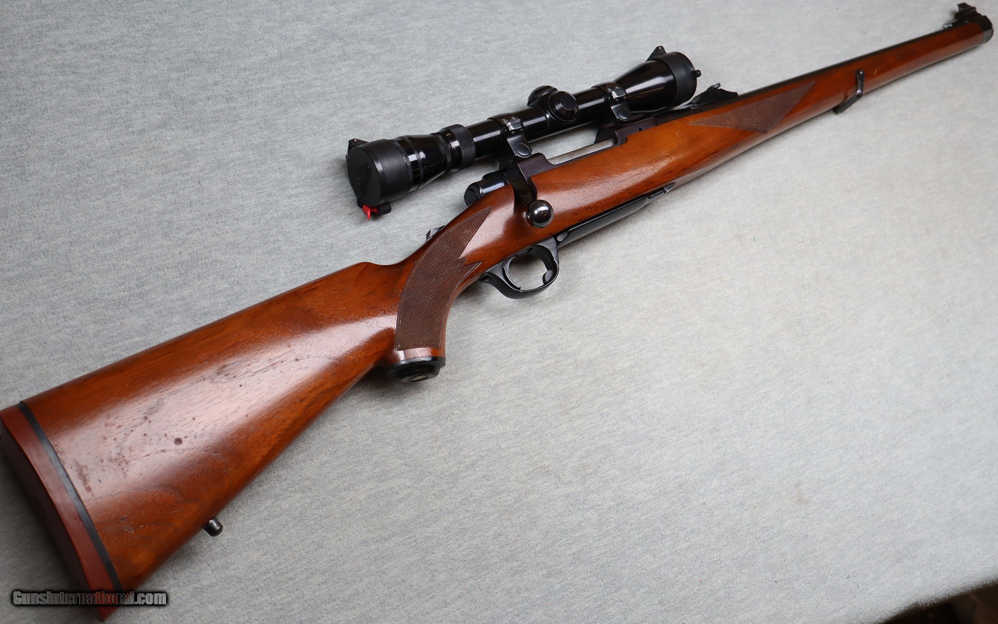 Description: Ruger M77 RSI bolt action rifle with a 18.5 inch barrel and chambered in .250 Savage. Rifle is topped with a Redfield scope. Finish is good with rifle showing normal wear. .250 Savage Metal Condition: very good Wood Condition: good Bore Condition: bright Barrels: 18.5" barrel Stock Dimensions: 13.75 Fore End: checkered wood Butt Pad: rubber Weight: 7 lb - 6 oz. Sights: "factory sights, Redfield 2x-7x scope Item Location: La Vista, NE Price: $1,999.99 Contact Seller |