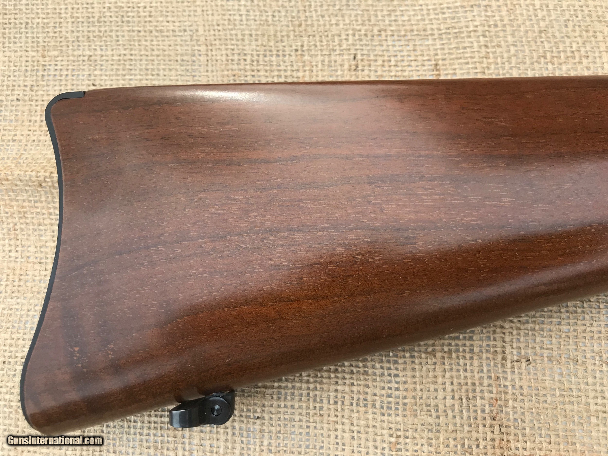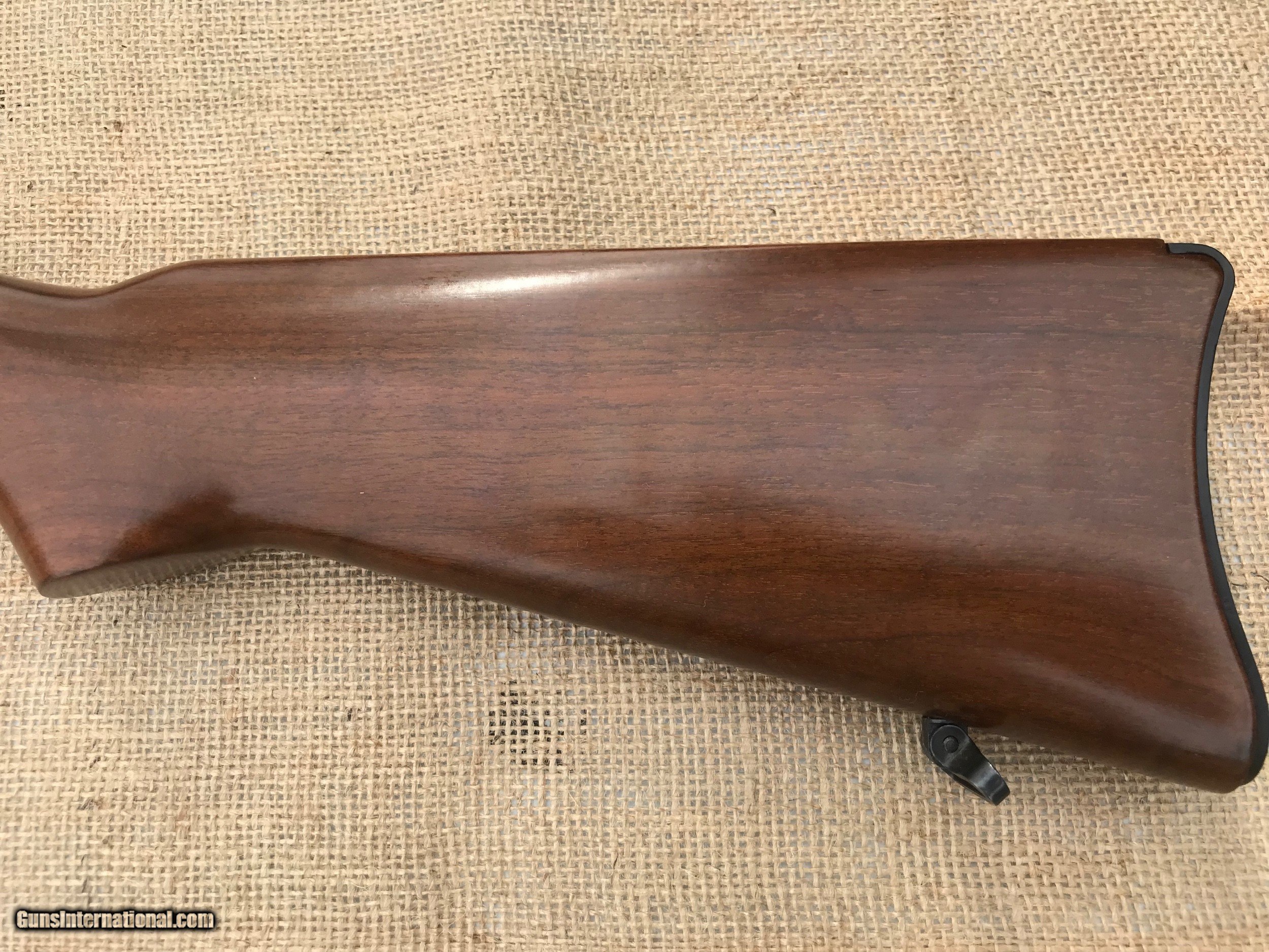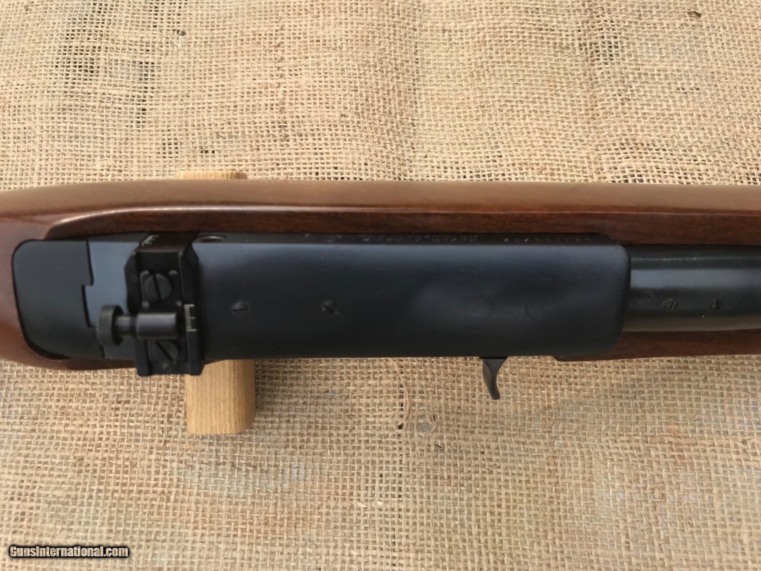 Description: (Sold) Excellent early production Ruger 44 carbine. Serial number 102–11328 made in 1975. Standard 18.5 inch barrel with shiny bore. Excellent stock showing little signs of wear. Original high polish blue is excellent showing little wear or marks. Built in Peepsight with original box and manual. No Calif. buyers. Please add 40.00 freight and ins. SOLD |