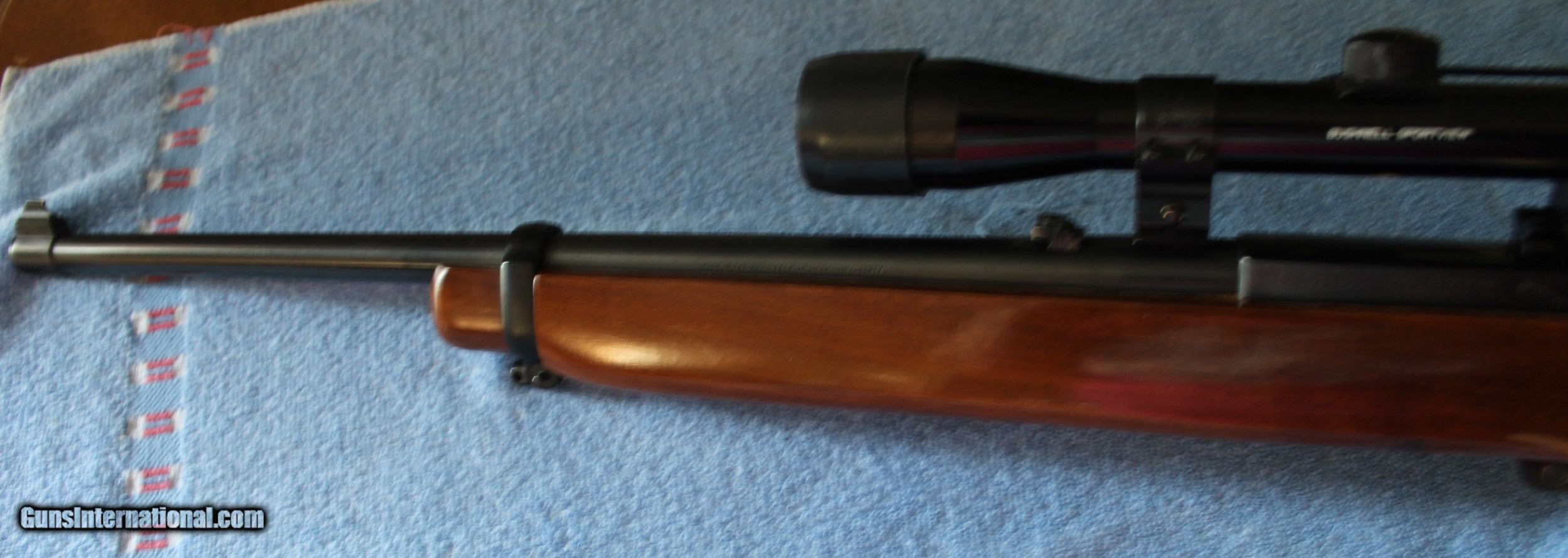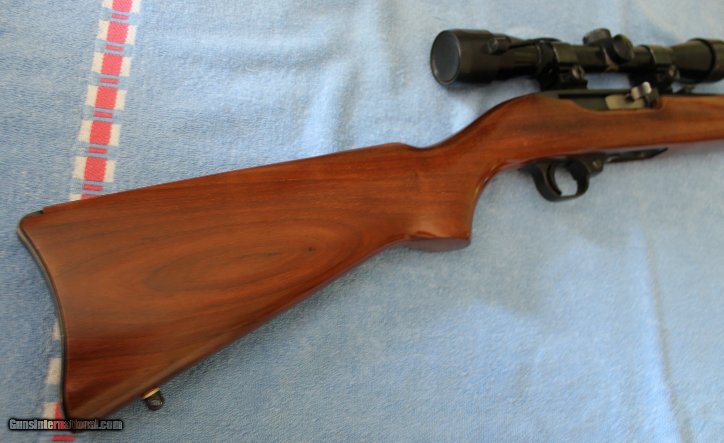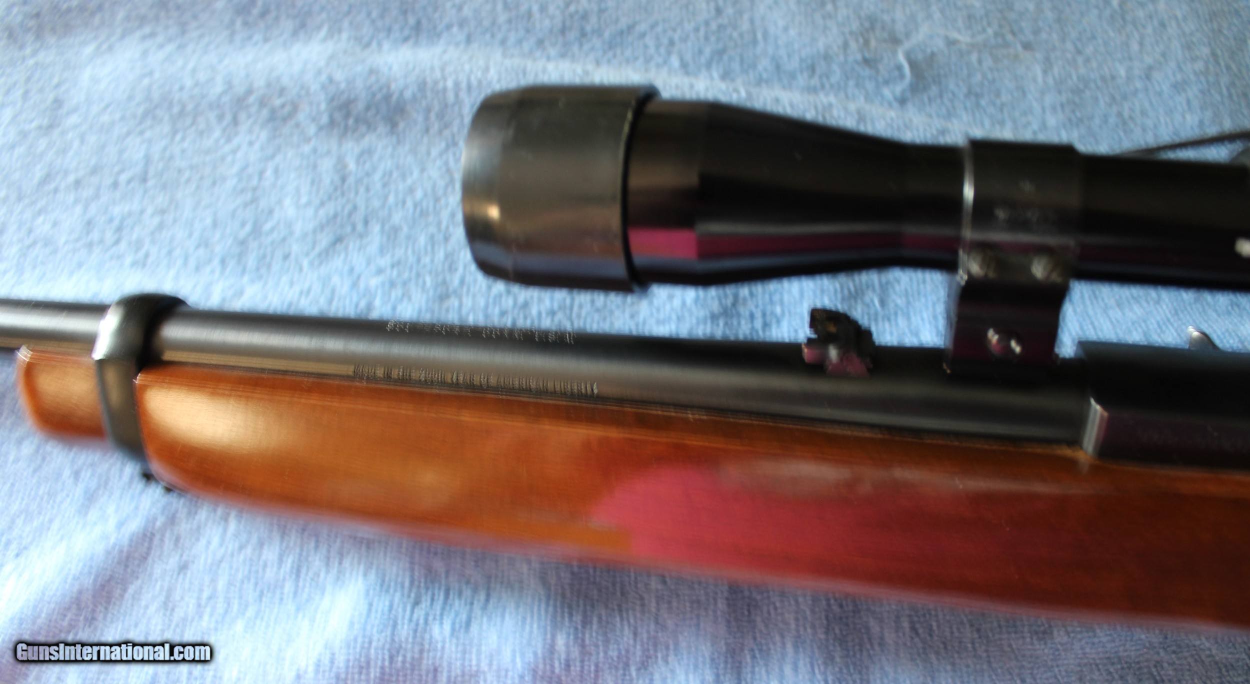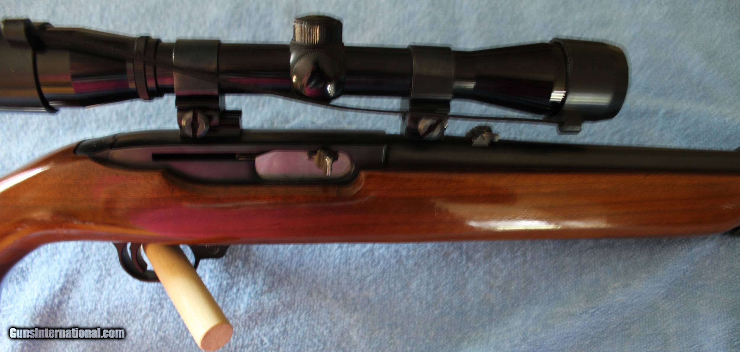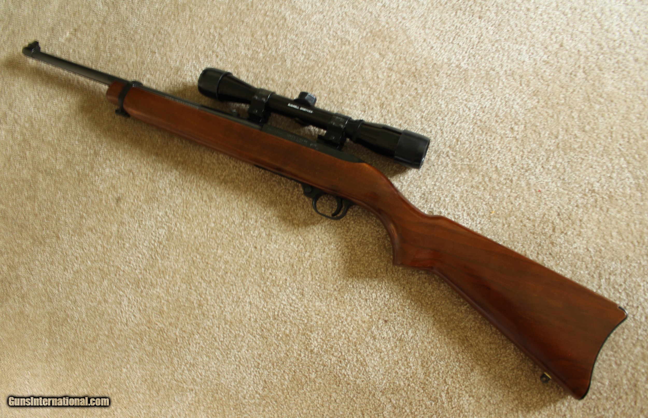 Description: Ruger 44 Magnum Caliber with 18" blued barrel and receiver, factory sling studs included in excellent condition factory walnut varnished stock. Stock shows nice grain and figure. Bushnell Sportview 4 power scope attached with Weaver style rings. Rifle was made in 1976 and is stamped on the barrel "Made in the 200th year of American Liberty'. Blueing is 99% and stock shows a few small handling marks. Bore is excellent. Gun appears to have not been used much and I would rate it excellent to mint condition. Ship to FFL only. Ship to lower 48 only. Buyer pays $40.00 Shipping & Insurance. Cashiers check only. SOLD |