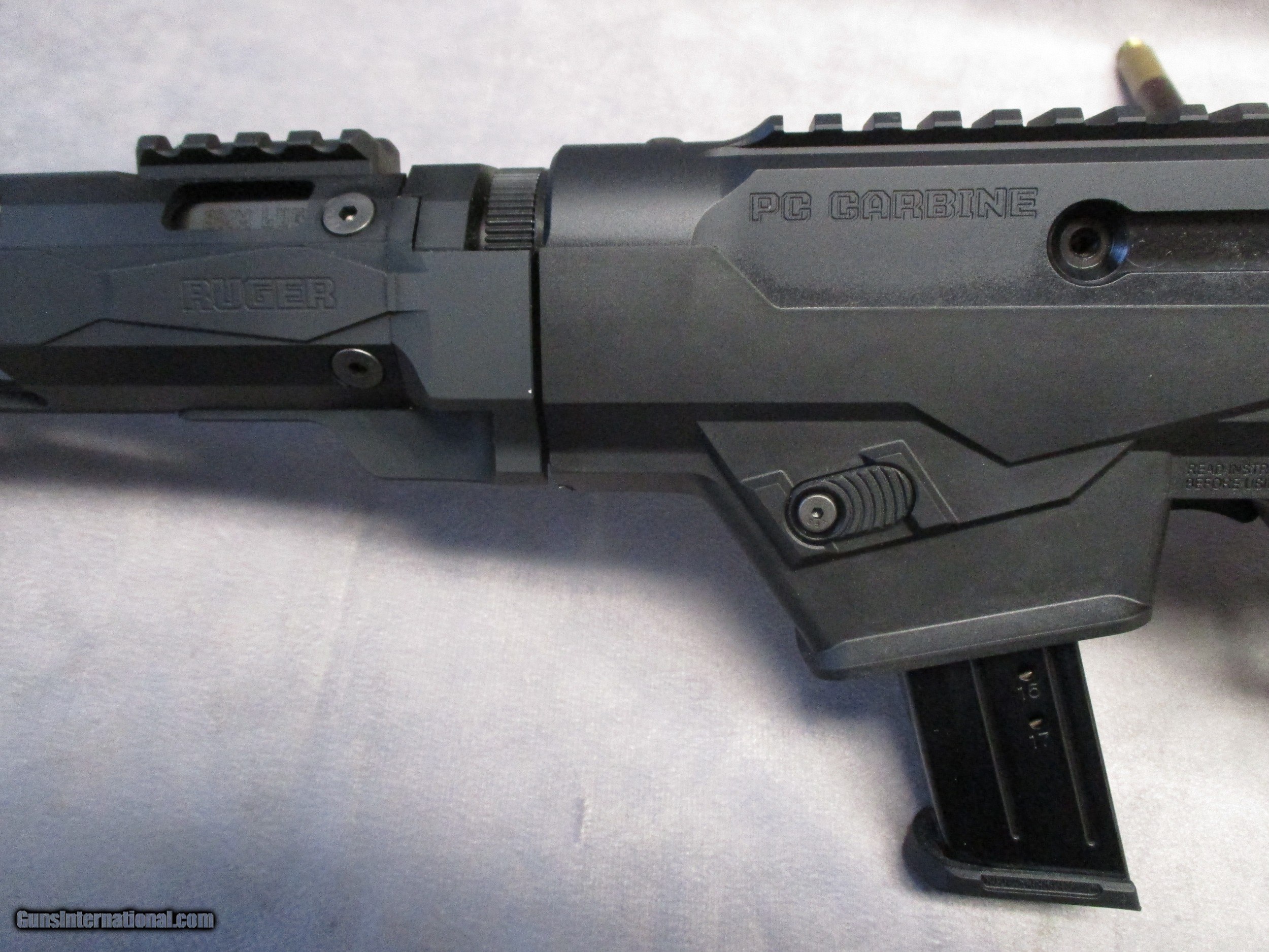 Description: The Ruger PC-9 was introduced originally in 1996 and produced until 2006, when production ceased due, according to Ruger, low product demand. In retrospect, this was a huge mistake as pistol-caliber carbines were just beginning to gain wide acceptance. After 11 years of growing interest in pistol-caliber carbines and the nearly unopposed success of the Kelt-Tec Sub 2000, Ruger finally re-entered the market with a much improved version of the PC-9. The newer PC Carbine features a takedown barrel and, depending on the version, a fixed synthetic stock with conventional fore end, a fixed stock and M-Lok hand guard, or an AR-style collapsing stock and M-Lok hand guard. The example shown here is the latter of course. One interesting feature is the fore-mounted picatinny rail. This is intended for mounting an optic. Since this is a takedown rifle, mounting an optic here makes sense as it will ensure that the rifle’s barrel in combination with the optic maintains basic zero even if rifle is temporarily separated into two components for transportation. One of the PC Carbines most famous features is the ability to switch out its current magazine well, designed for factory Ruger mags, to another for use with Glock magazines. This makes the PC Carbine and Glock pistol combination possible for use by civilians as well as law enforcement. The purpose of this is to simplify the logistics for both ammunition and magazines. Another advanced feature of the PC Carbine is the ability to reverse both the magazine release and the charging handle to suit left hand shooters or people who desire one-handed control manipulation while maintaining a prop firing grip. The PC-9 shown here is brand new in the box and ready to go. SOLD Rifle Caliber: 9x19mm Parabellum (9mm Luger, 9x19mm NATO) Manufacturer: Sturm, Ruger & Co., Inc. Model: PC-9 Serial Number: 912-97579 Bore: Rifled, 1:10" Twist Ejectors: Auto-ejection Condition: New in Box Barrel Type: Fluted Action: Semi-auto, blow back Triggers: 10/22 style trigger Stock: Adjustable, Black Synthetic Chassis Fore End: Aluminum Free-Float Handguard Butt Pad: Rubber LOP: 10.50 – 13.75 inches (266.7 – 349.25 mm) Finish: Type III Hard Coat Anodized Weight: 7.3 lbs. Sights: No iron sights Case: Ruger Box |