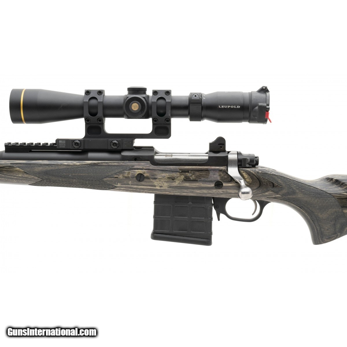Left hand bolt action repeater with detachable box magazine. Overall in good to very good condition. Comes with American Defense scope mount and Leupold VX-R 3-9x scope and sling.