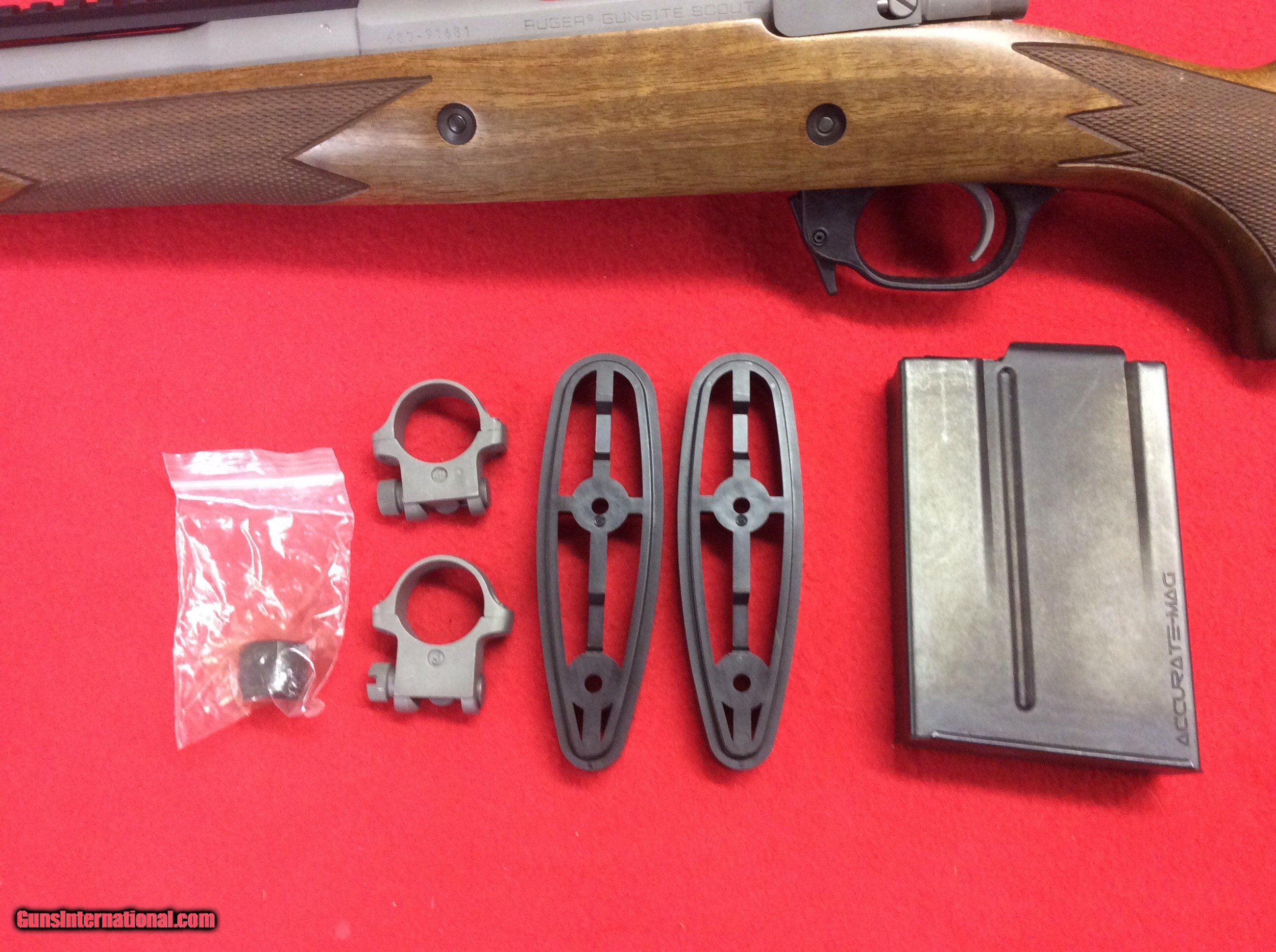 Description: FOR YOUR VIEWING IS A NEW NO BOX RUGER GUNSITE SCOUT IN 308 CL. THE RIFLE IS STAILLESS STEEL WALNUT STOCK WITH A FLASH HIDER. SCOPE RINGS, RECOIL PAD SPACERS, ONE MAGAZINE AND BARREL THREAD PROTECTOR INCLUDED, ALL NEW NEVER FIRED. BARREL LENGTH IS 16" WITH THREAD PROTECTOR, AND 18" WHEN FLASH HIDER IS INSTALLED. CALL OR EMAIL FOR MORE INFO ETC. THANKS FOR LOOKING SOLD |