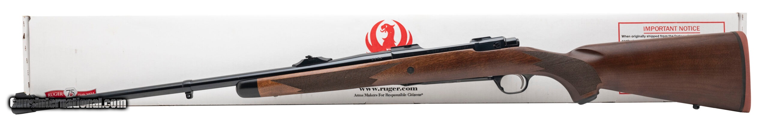 Description: "Ruger M77 Hawkeye .270 Winchester with an 24"" barrel. Gold Bead Front sight and folding rear sight. High polished blue finish and walnut stock. NEW. UPC: 736676571666 (STOCK PHOTO) SOLD |