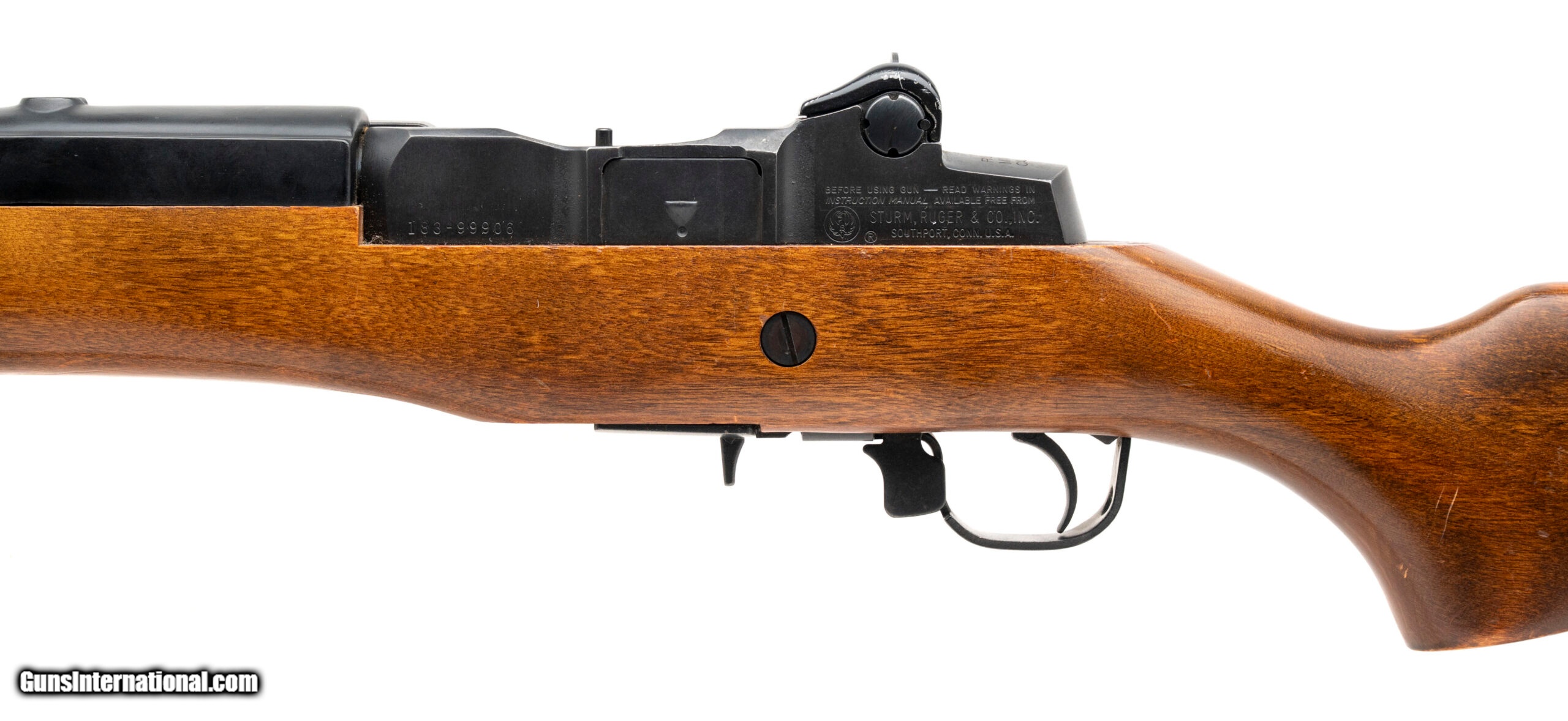 Description: "SN: 183-99906. Made in 1983. .223 REM. with a 18.5"" barrel. Bore is excellent. Semi-auto rifle with bladed front sight & aperture rear sight, blued finish, and wood stock. There are 3 white marks painted to front sight, finish shows minor loss notably to the receiver and rear sight, and the stock shows marks throughout. Includes sling. Overall condition is very good. SOLD |