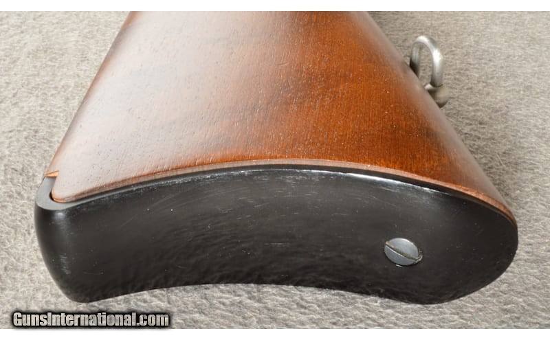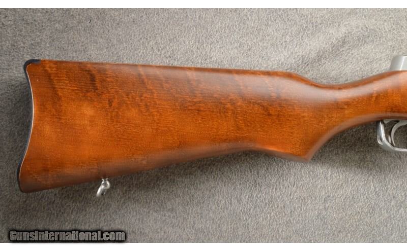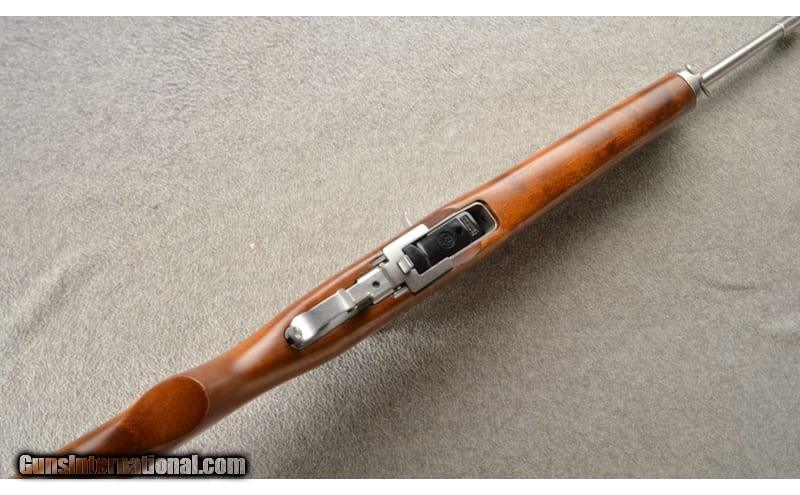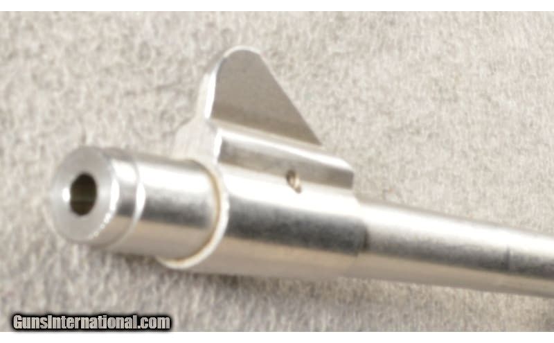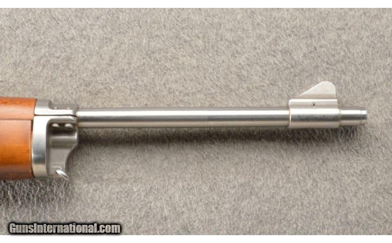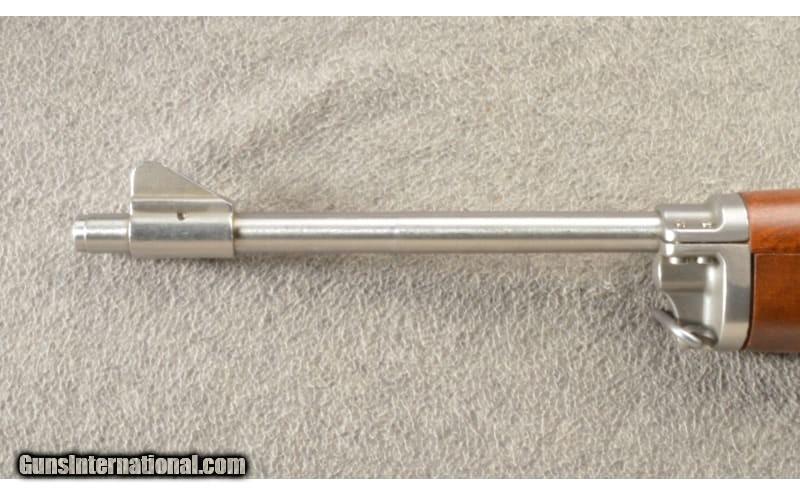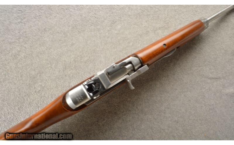 Description: 1980 stainless Ruger Mini 14 rifle chambered for 223 Cal. This example is a 182 series with an 18.5" barrel, a serrated ramped front blade, and a rear adjustable peep sight. The stock is a 2 piece wood stock with a straight comb, metal but plate, semi pistol grip and smooth forend, 2 slings studs, 1 in the belly of the buttstock and one attached to the forend nose cap. Over all this gun is in lightly condition. Comes with one five round Ruger magazine. .223 Remington SOLD Chambers: Semi auto. Metal Condition: Excellent 99% metal surface condition. Wood Condition: "A couple light marks, but still rates about 99%. Bore Condition: Bright strong bore. Barrels: 18.5" barrel. Triggers: Single trigger. Stock Dimensions: LOP 12 5/8". Fore End: Smooth wood. Butt Pad: Curved plastic. Sights: Fixed front with an adjustable rear. Item Location: Owatonna, MN |