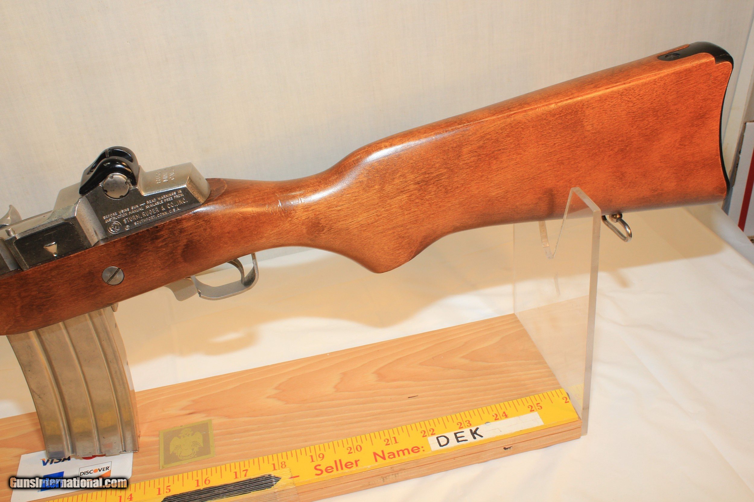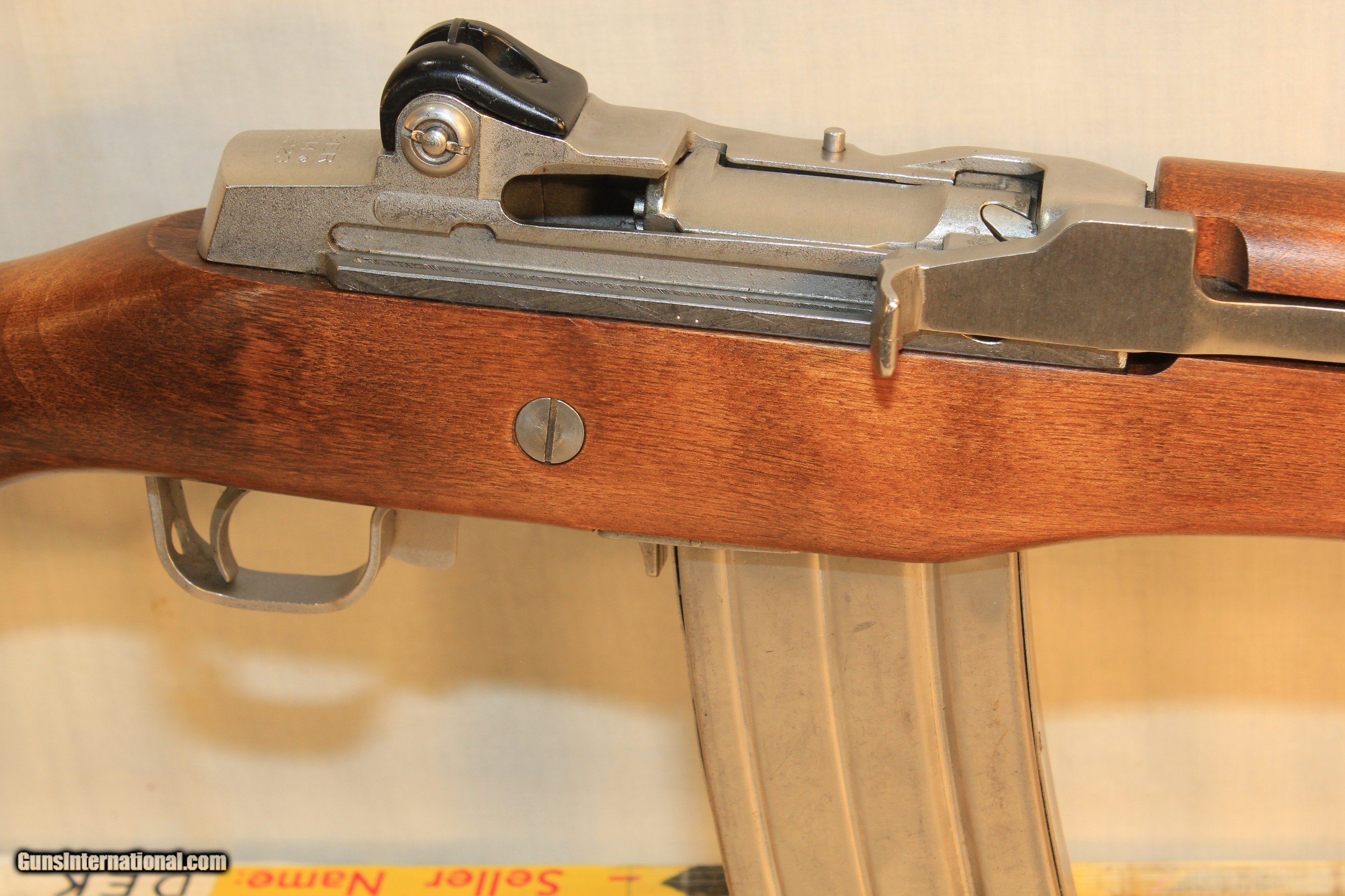 Description: Ruger Stainless Mini 14 with an excellent bore. The stainless steel surfaces rate excellent and have a few light handling marks. There is a small amount od what appears to be light pitting on the left side of the front sight and on the added flash hider. The hardwood buttstock and hand guard rate excellent and have a few light dings. The original sights remain intact and included is a single 30 round after market magazine. An overall excellent example of a 1981 made sporting carbine. This model has a wood upper handguard. $50.00 Shipping via Priority Mail. SOLD |