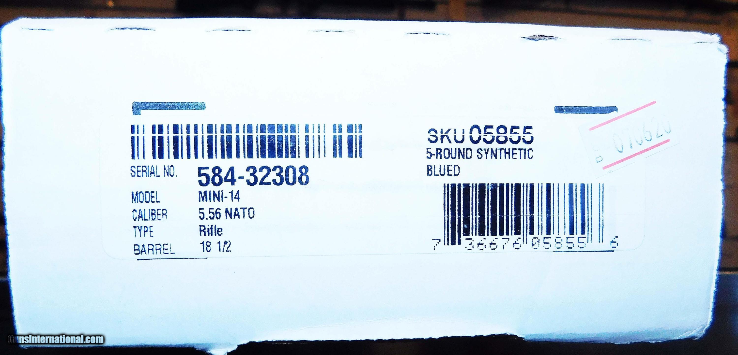 Description: RUGER MINI 14 IN .223 CAL., WITH 18 .5" BARREL. COLOR BLUE. CONDITION 98% LIKE NEW UNFIRED. SERIAL NUMBER 584-32308. RUGER MODEL MINI 14 IN .223 CALIBER, ADJUSTABLE REAR PEEP SIGHT WITH DOG EARED FRONT, COMES WITH ALL WEATHER BLACK SYNTHETIC STOCK AND FOR ARM, ONE FACTORY MAGAZINE, BOX AND PAPERS, 98% LIKE NEW UNFIRED OVERALL CONDITION, OUR STOCK # D3312 SOLD |