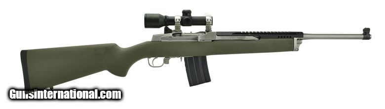 Ruger Ranch Rifle 6.8 Special caliber carbine. Stainless carbine with green synthetic stock. Has a Barska scope. Excellent condition.