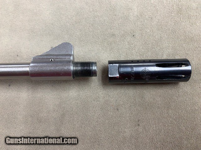 Description: An excellent condition Ruger Stainless Mini 14 complete with custom threaded barrel as shown. Cost to move front sight to the rear and thread barrel is about $200, and you get it for free. SOLD Rifle Caliber: 5.56x45mm NATO |
