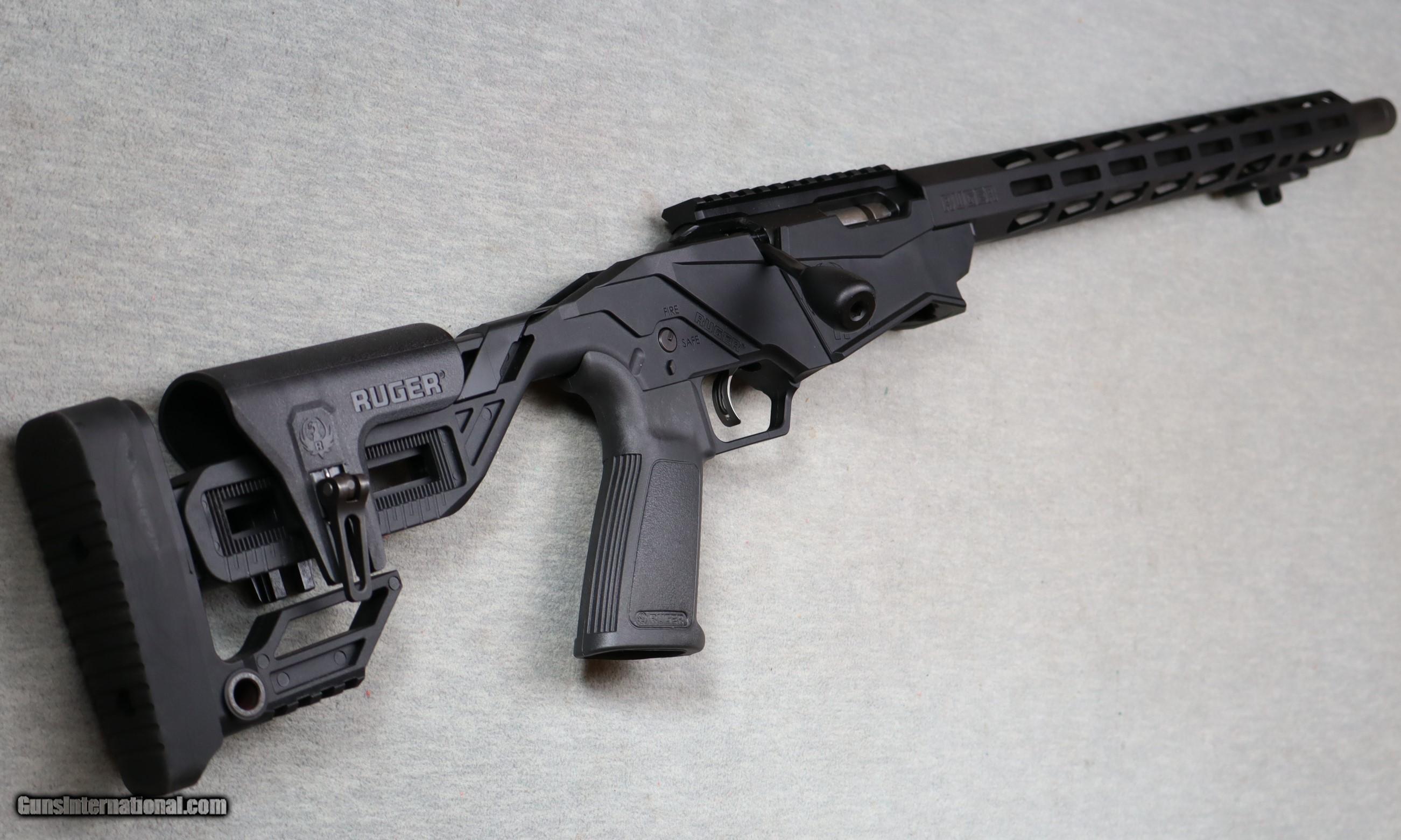 Description: Excellent condition, light finish wear, few small scratches, comes with one mag. Bolt action rimfire rifle, 18" threaded heavy barrel, factory black finish, smooth action with large bolt knob, crisp trigger, AR15 type safety lever, aluminum free float rail with MLOK mounting slots, textured pistol grip, adjustable cheek rest and Ruger factory recoil pad. .17 HMR SOLD Chambers: Bolt action Metal Condition: Excellent Bore Condition: Bright Barrels: 18 Triggers: Factory trigger Stock Dimensions: 12" LOP Fore End: Aluminum rail with MLOK mounting slots Butt Pad: Ruger pad Sights: Receiver rail for scope mounting Item Location: La Vista, NE |