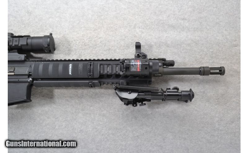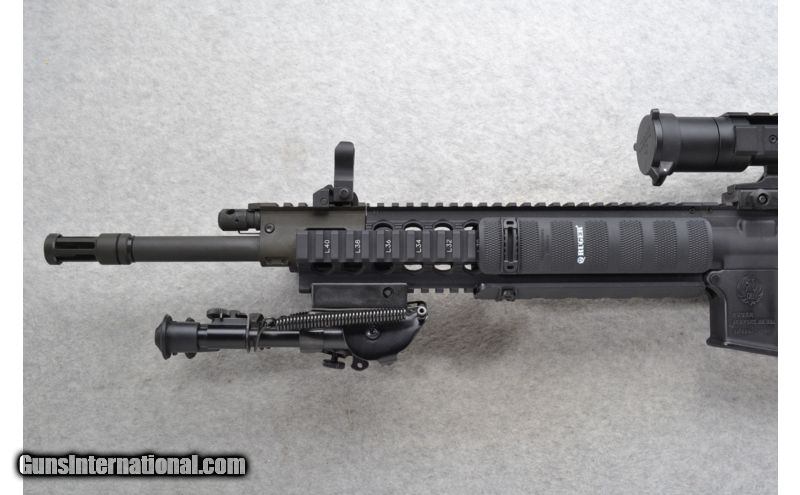 Description: This Ruger Model SR-556 semi-automatic rifle comes in 5.56 NATO with a 1-9 twist barrel. Included with this rifle is a Burris AR-332 Scope, Insight side light with red laser, folding adjustable bi-pod, 3 hand shields and Ruger folding adjustable front and rear sights. An excellent addition to anyone looking for an AR style rifle. SOLD Caliber Info: 5.56 NATO Chambers: Detachable Magazine. Metal Condition: Excellent. Bore Condition: Excellent. Barrels: 18 inch matte black with the muzzle break. 1-9 twist. Stock: Telescoping / Adjustable Buttstock. Textured black rubber full pistol grip with finger grooves.. Stock Dimensions: LOP 13 7/8 inches. Fore End: Four side vented matte black tube. Four side Picatinny rails. Bi-pod. Light. Hand shields. Butt Pad: Textured black rubber. Weight: 10 lbs. 2 oz. with scope, bi-pod and light attached. Sights: Burris AR-332 3X prism scope. Adjustable folding sights front and rear. Laser sight. Extras: Soft Case Item Location: Richfield, WI |