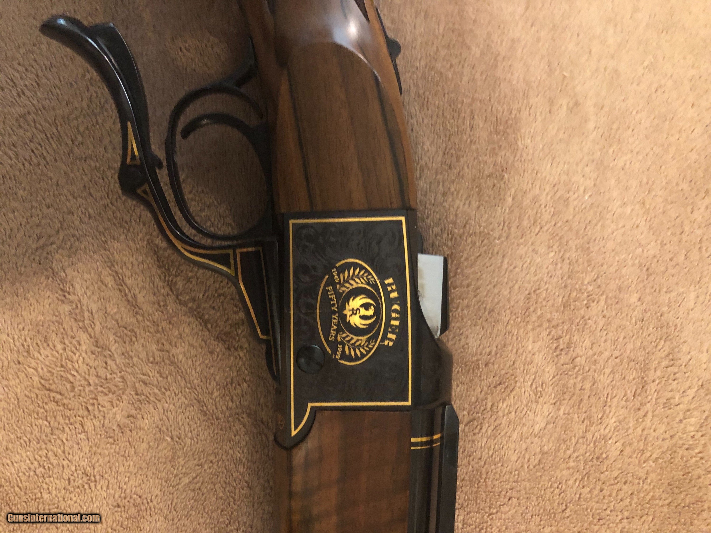 Description: SOLD! A single-shot, lever-action, center-fired rifle, the Ruger No.1 is built around a compact and simple, yet strong, falling-block breech mechanism with artillery-style breechblock. The sculpted receiver is robust and sturdy, offering rigid support for the barrel, stock, and sliding breech block, while the Ruger’s patented Scope Mounting System ensures scope bases never get loose. The sliding tang safety is easily accessible and visible. Available in a number of different calibers and barrel lengths, as well as with a black laminate or walnut stock, the No. 1 is also made with a sporting-style recoil pad, grip cap, and sling swivel studs. The 50th Anniversary edition features floral scroll and punch dot engraving on the receiver with a gold inlaid border on the sides gold Ruger commemorative logo and gold signature of William Ruger on the bottom. The sides of the lever are bordered with gold inlay and there are thin, wide gold bands around the muzzle and breech ends of the barrel. Ramped beaded blade front sight and adjustable single folding leaf rear sight mounted on the quarter rib. Alexander Henry-style forearm and Ruger recoil pad and sling swivel studs. This rifle comes with the original box. We are always buying guns and militaria. Contact us about your estate or if wanting to buy, sell, or trade. NO PAYPAL! PAYMENT: -Payment must be recieved within 10 days of purchase. SHIPPING & HANDLING: -$30 for handguns and $45 for long guns SHIPPING FIREARMS: -Firearms shipped to FFL dealer only -We will ship upon receipt of payment and signed legible copy of dealer's FFL via Fax, Mail or E-mail. SALES TAX: -Florida residents add 7.5% sales tax. PRODUCT: -We operate a gun shop which means that every item is for sale in our store and it may have already been sold when you contact us. NEW GUNS: -On new Firearms we may use file photos instead of the actual gun. CONTACT: -Contact me with any and all questions. We want you to be happy with your purchase. PHONE #: (904) 271-5270 STORE HOURS: Mon-Fri: 11p-6pm Sat: 9a-3p BUYER: -It is Buyer's responsibility to ensure that the weapon is LEGAL to own in your city/state. SOLD Rifle Caliber: .45-70 Government Manufacturer: Ruger Model: #1 50 Year Commemorative Condition: LNIB |