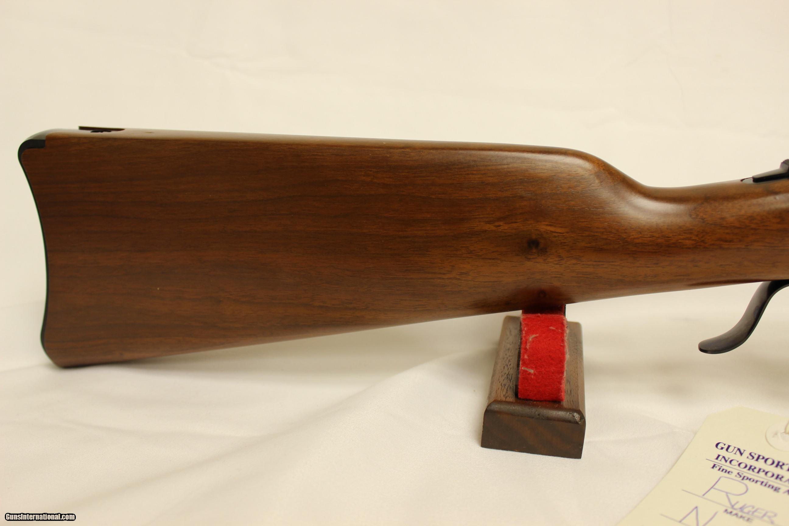 Description: This Ruger .223 Remington has a 22" bright excellent bore. The metal surfaces retain 98-99% original blue finish with some light scuff marks on bottom butt plate. the walnut stock rates excellent overall displaying a few handling marks. The carbine is sited with standard Ruger open sights and there are four factory drilled holes on the barrel. An original box that is relabeled with the gun's serial number and manual are included. SOLD |