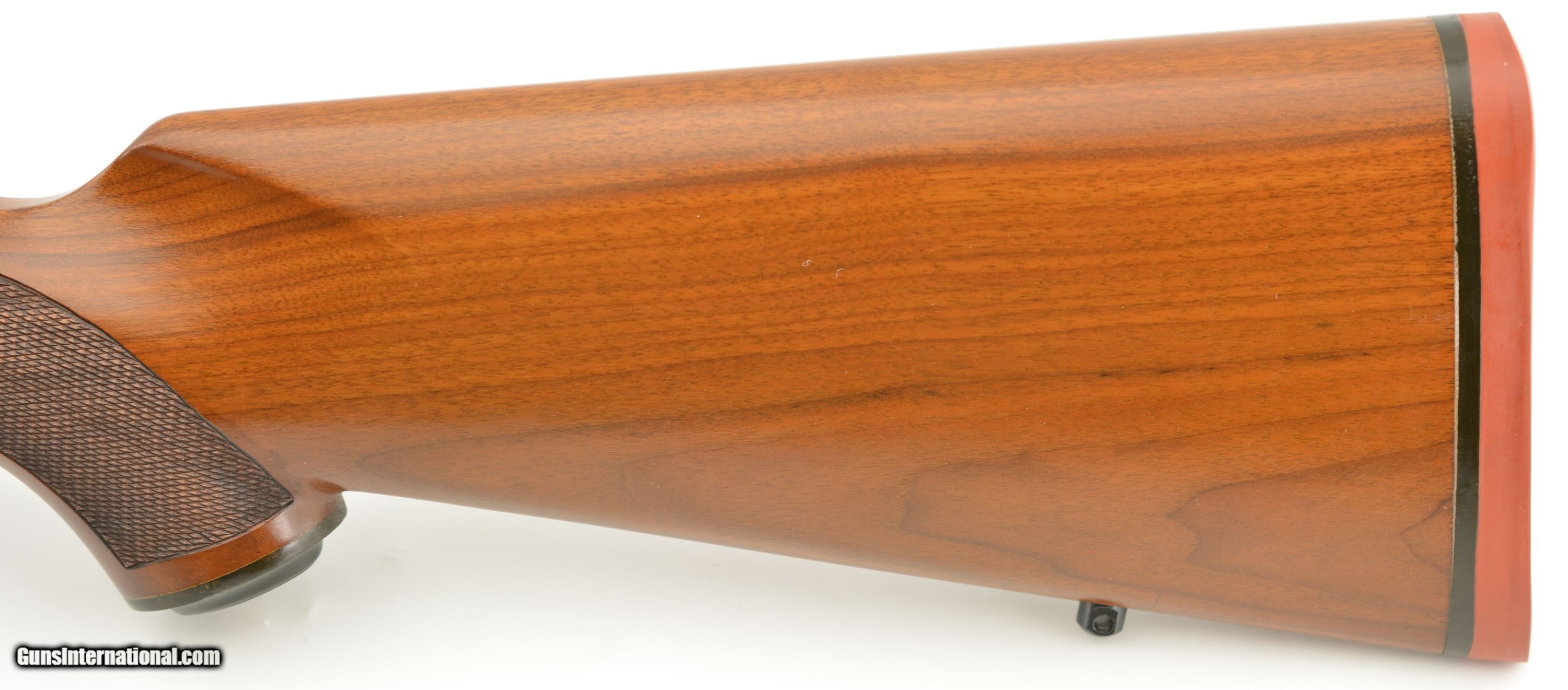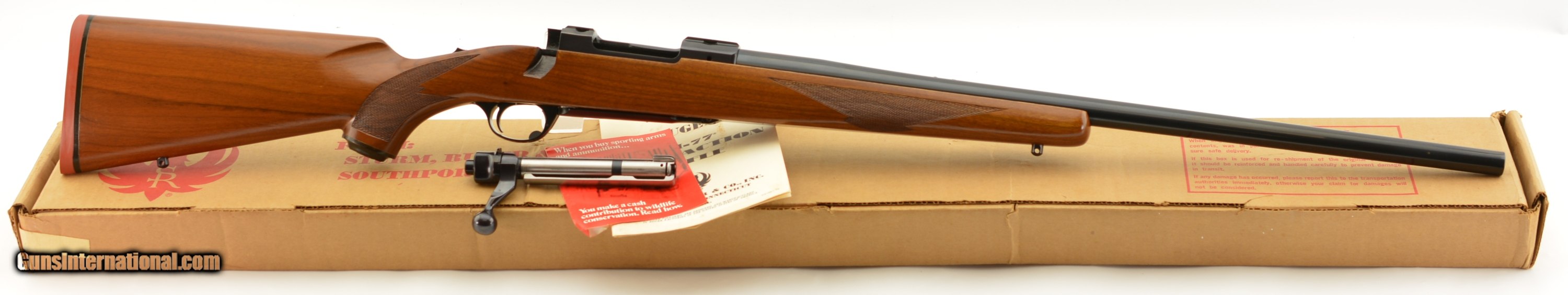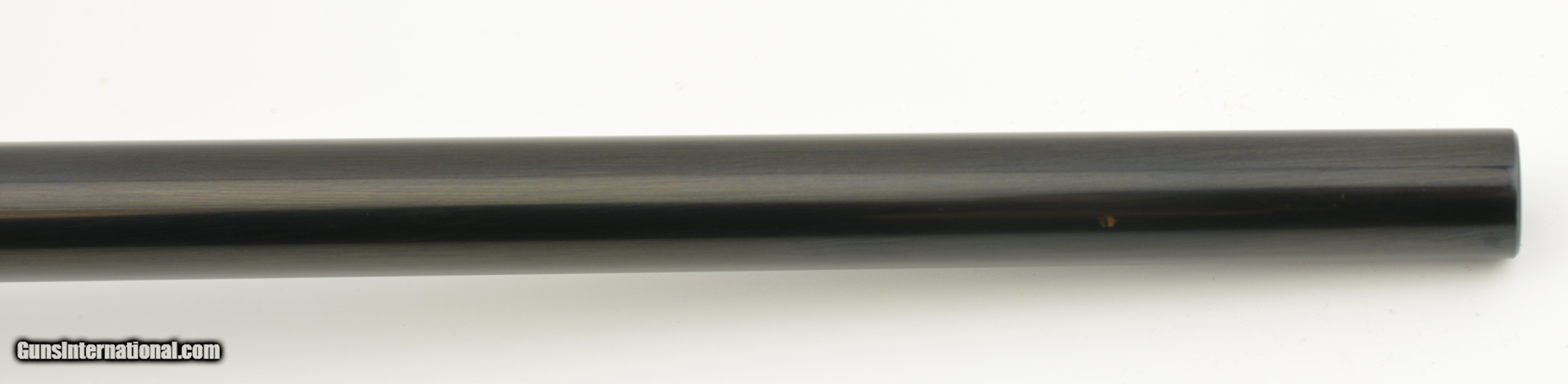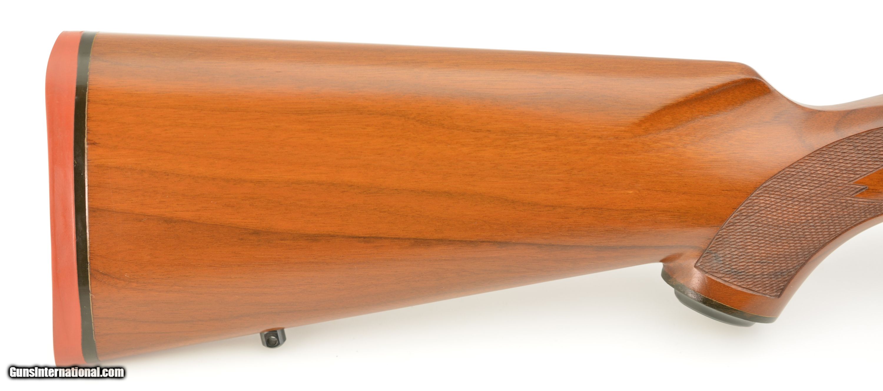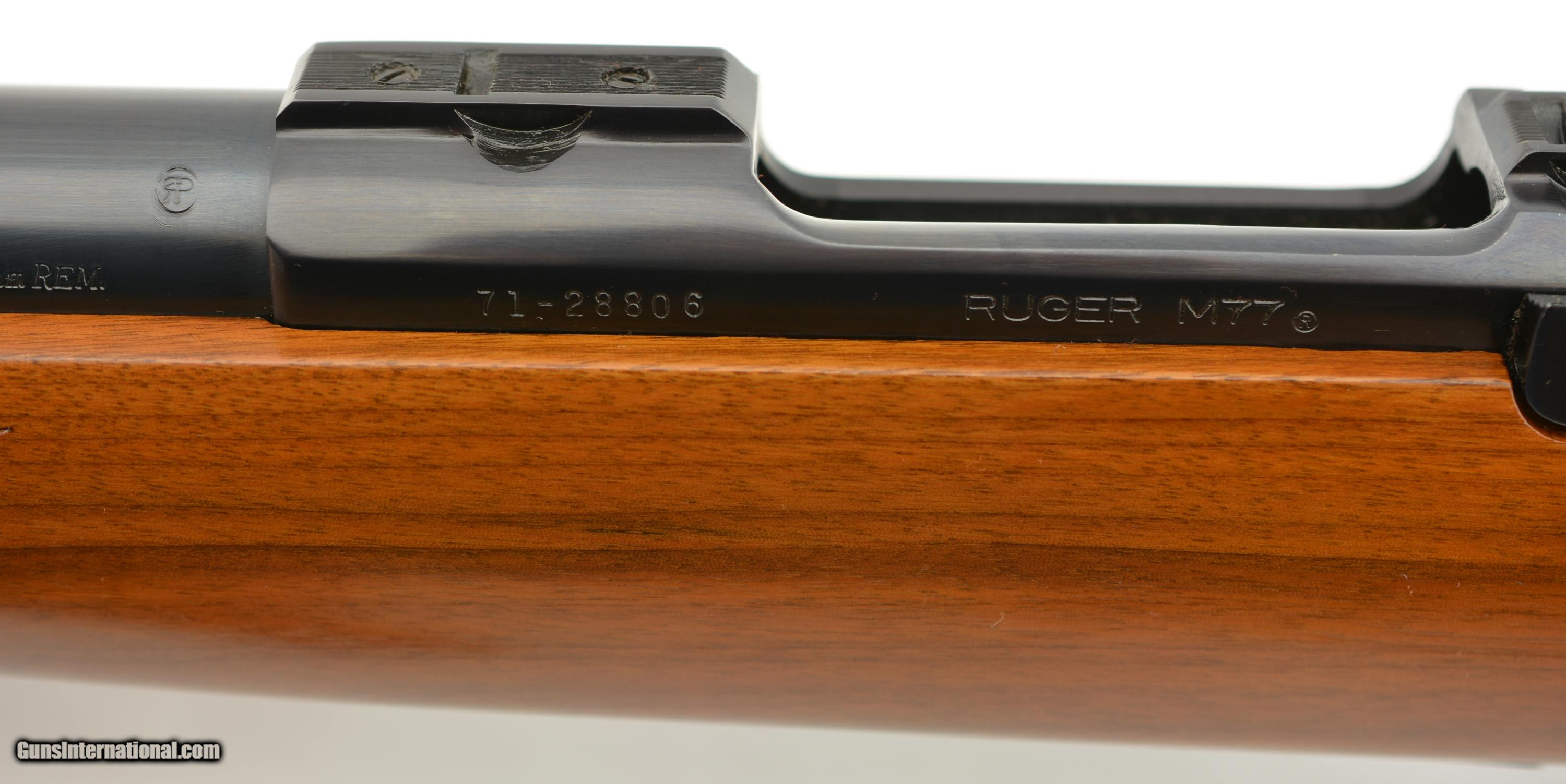 Description: Serial #71-28806, 6mm Rem., 24" heavy barrel with an excellent, bright bore. This is a ca. 1975 manufactured rifle that has no iron sights, and features the integral scope bases, is drilled and tapped for scope blocks, and has a tang safety. The former collector protected the metal by leaving a film of grease which you can see the residue of in some of the photos. It did it's job! The metal retains practically all of the original blue finish with only a single small speck of flaking on the right side near the muzzle. The checkered walnut stock has virtually no wear or handling marks, and is outfitted with a red Ruger recoil pad. The rifle is housed in the original, numbered Ruger cardboard shipping box with original manual (no rings). This is a very nearly new-in-box, early Model 77, chambered in a great light game/varmint caliber. FFL SOLD Manufacturer: Ruger Model: 77 Caliber Info: 6mm Rem Gauge Info: 6mm Rem |