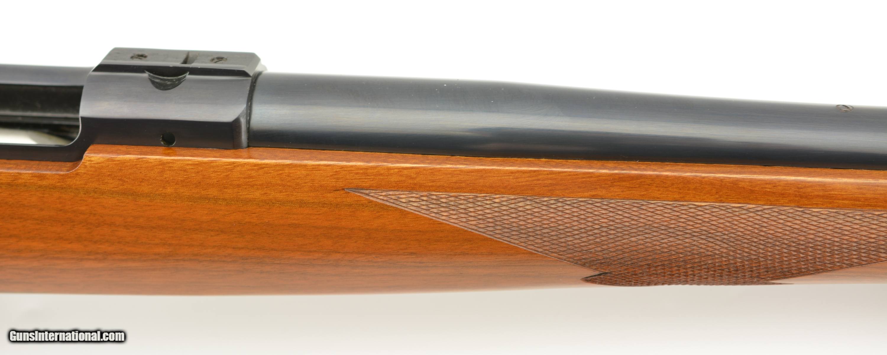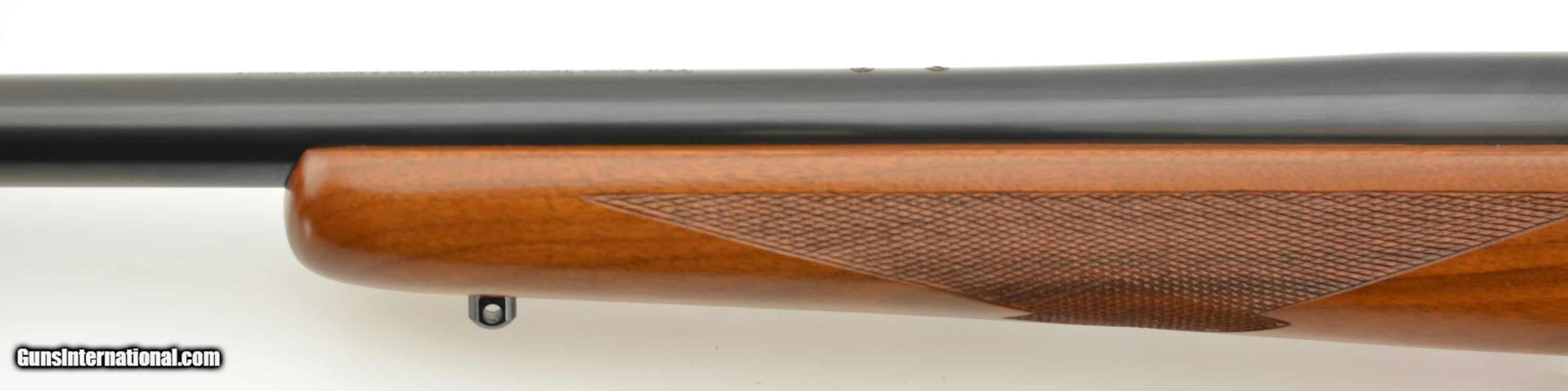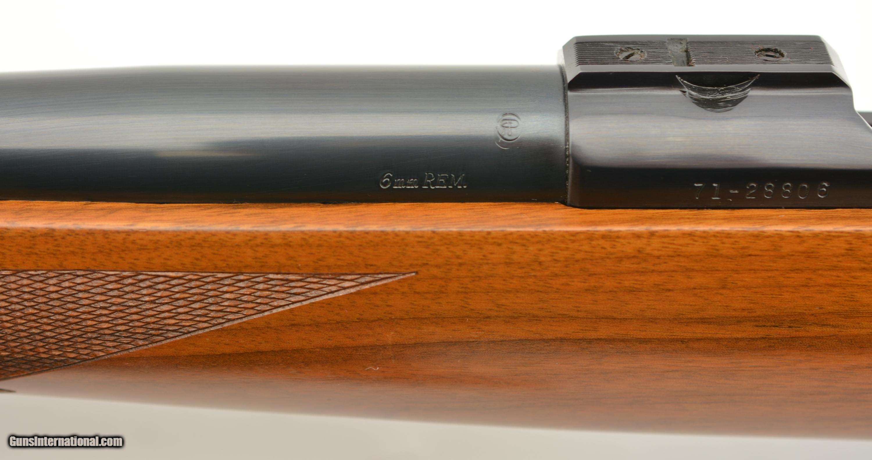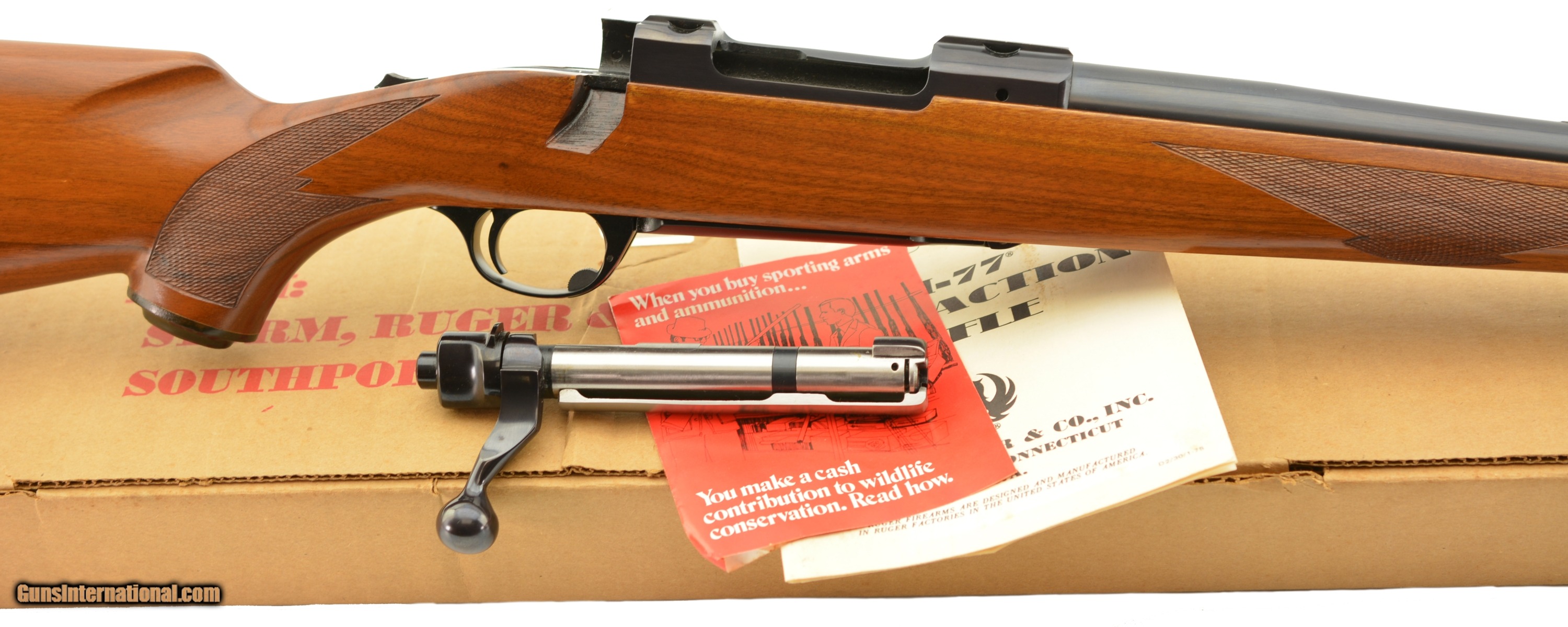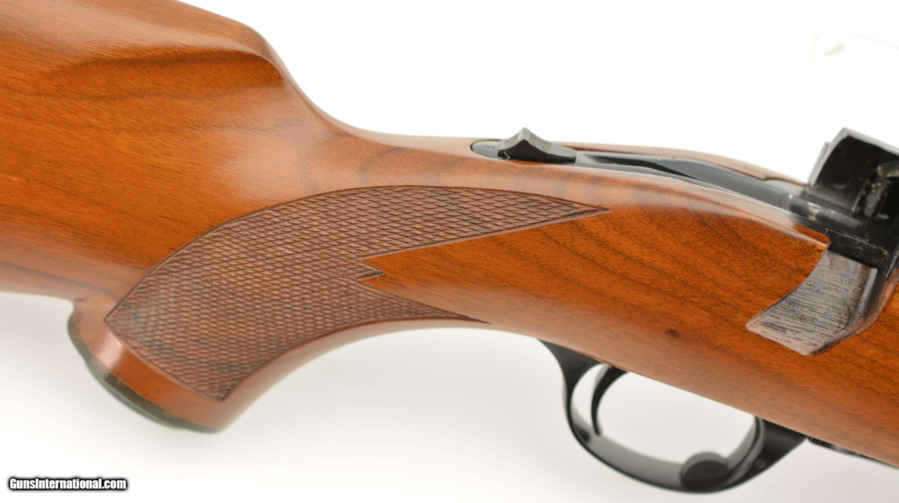Description: Serial #71-28806, 6mm Rem., 24" heavy barrel with an excellent, bright bore. This is a ca. 1975 manufactured rifle that has no iron sights, and features the integral scope bases, is drilled and tapped for scope blocks, and has a tang safety. The former collector protected the metal by leaving a film of grease which you can see the residue of in some of the photos. It did it's job! The metal retains practically all of the original blue finish with only a single small speck of flaking on the right side near the muzzle. The checkered walnut stock has virtually no wear or handling marks, and is outfitted with a red Ruger recoil pad. The rifle is housed in the original, numbered Ruger cardboard shipping box with original manual (no rings). This is a very nearly new-in-box, early Model 77, chambered in a great light game/varmint caliber. FFL SOLD Manufacturer: Ruger Model: 77 Caliber Info: 6mm Rem Gauge Info: 6mm Rem |