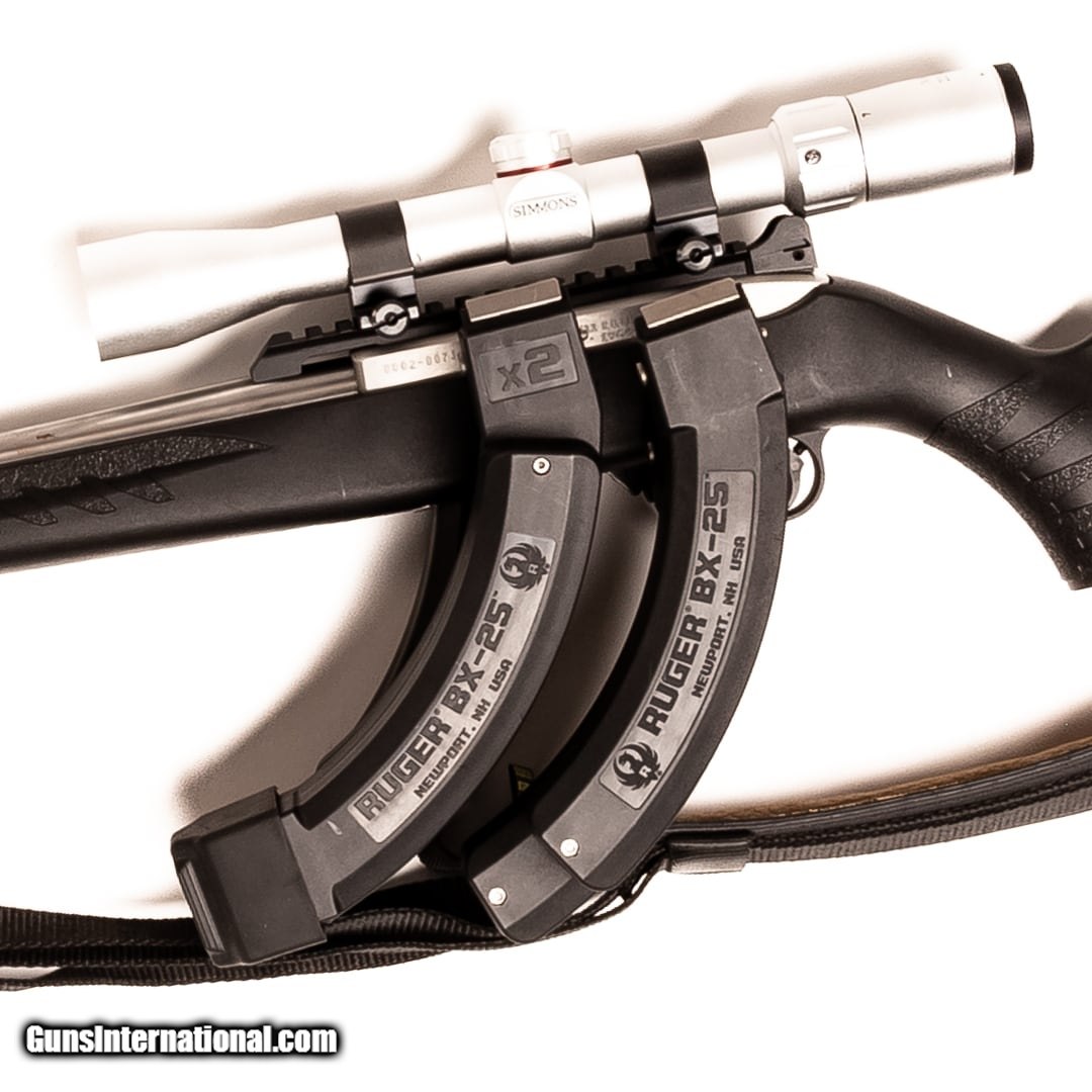 Description: Guns Listing ID: 657867 With a staggering 5 million sales since its introduction, the Ruger 10/22 is, by far, one of the most popular rifles in the US. There are countless options for aftermarket upgrades on the affordably-priced 10/22. If you are in the market for a 22-caliber rifle, this Ruger 10/22 is, by all accounts, one of the best options. This 10/22 features a Simmons 3-9x32 scope and an Outdoor Connection sling. Five 25-round magazines are included. SOLD Manufacturer: RUGER Model: 10/22 Caliber Info: .22 LR Condition: Used - Certified Barrels: 18 barrel Finish: BLACK/STAINLESS |