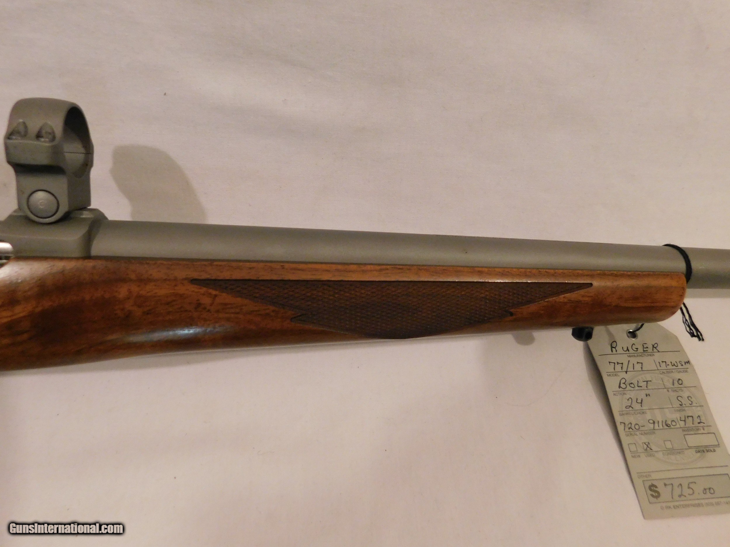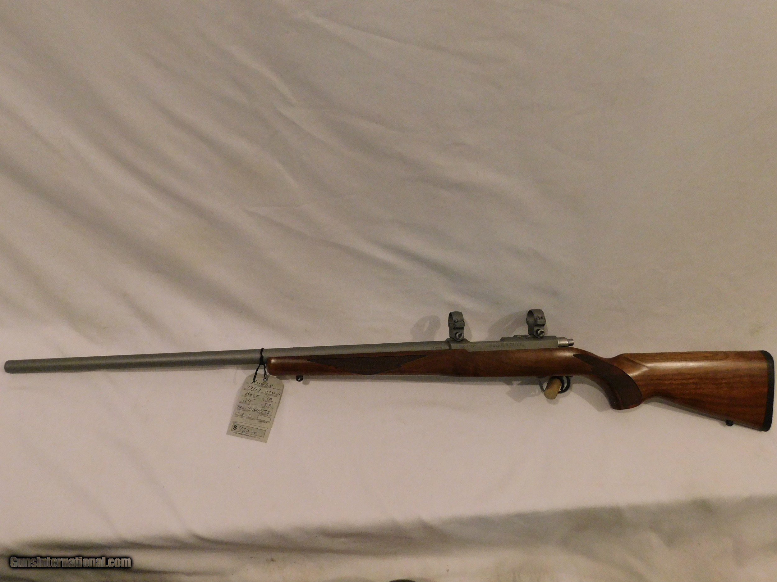 Description: This is a very nice Ruger 77/17 17 WSM bolt action rifle It is a 10 shot with a 24" stainless steel barrel SN 720-91160 SOLD Manufacturer: Ruger Model: 77/17 Serial Number: 720-911160 Caliber Info: 17 WSM Condition: Very good Metal Condition: very good Wood Condition: Very good Bore Condition: Very good Barrels: 22 Action: Bolt Triggers: Standard Stock: Checkered walnut with sling studs Butt Pad: Rubber Finish: stainless steel Sights: bases and rings |