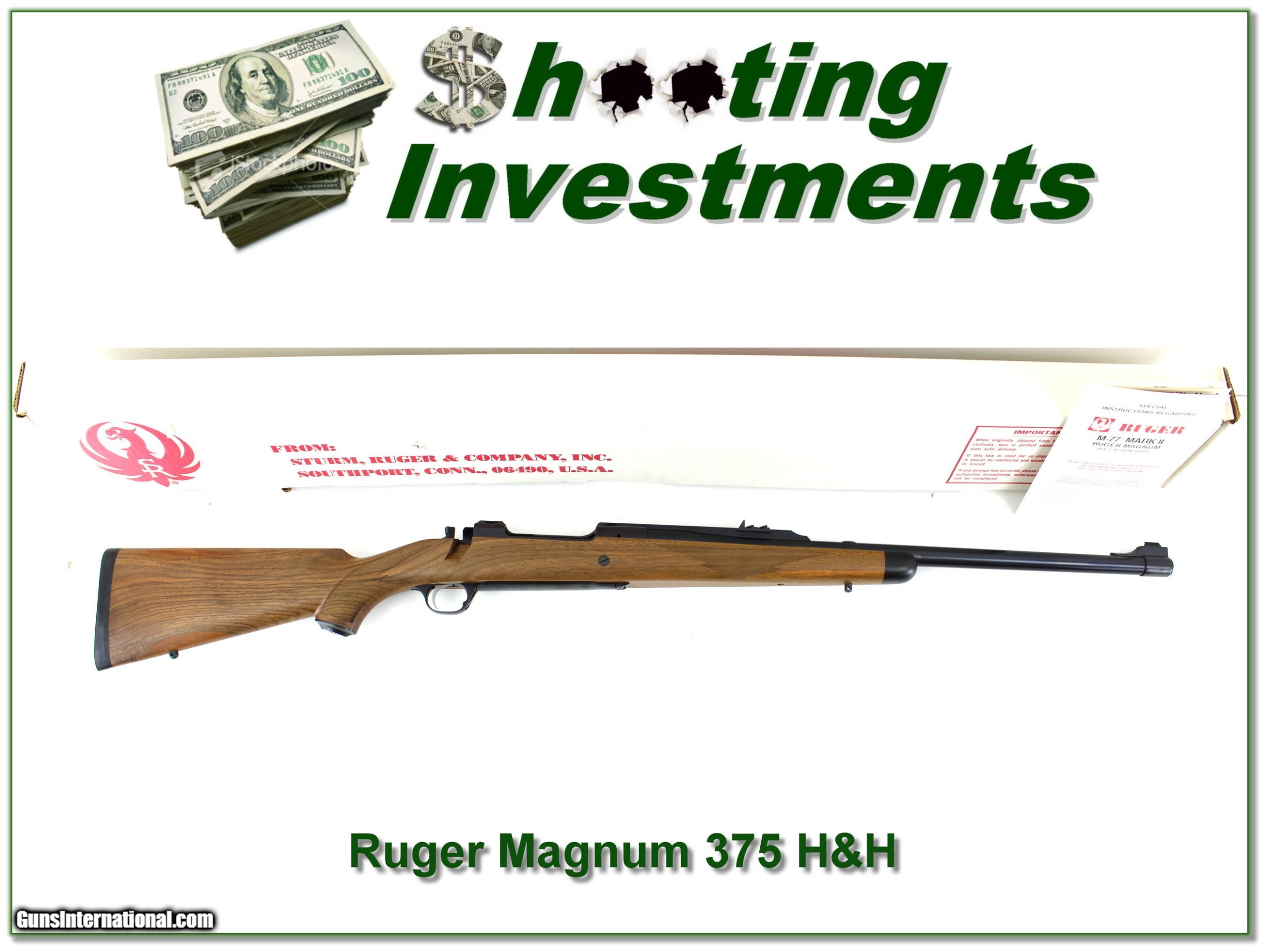 Description: Collectors, this is your chance to own a Ruger 77 Magnum that looks to unfired sine leaving the factory. It has beautiful Cartesian Walnut and a 22in medium heavy barrel with Safari express sights. It comes as seen in factory bow with papers and factory rings still unopened. Shipping and insurance is $39. Please email me with any questions or larger pictures. (Consign your quality firearms with Shooting Investments for only 12%! Let me know if you have any you would like to sell!) 20-0364 Payment: Payment is by Money Order, Cashiers Check or Personal Check. I can now also accept Credit Cards (MasterCard, Visa, Discover & American Express) with a 3% convenience fee. Shipping: The shipping charge will be listed in each description. It is $39 for most firearms. Some heavy guns or those insured for over $2000 will be higher. Shipments to Alaska and Hawaii are higher because air shipment is required. Most firearms are shipped on Tuesday and Thursday and usually in 5 days of receipt of payment. We package all shipments carefully and insure them. Optics are shipped Priority Mail and most other non-firearm shipments are shipped First Class. Returns: Our return policy is simple. If for any reason you are not pleased with your purchase, you may return your item for a full refund of purchase price. Ammunition cannot be returned. It is important to us that you are happy. Guns cannot be fired or dissembled before returning them and they must be returned in the same condition as received. Notification of a return must occur with-in 3 days of receipt at your dealer. Shipping, convenience and dealer fees are not refundable and are the responsibility of the buyer. Lay-a-way: If needed, we offer a 60 day lay-a-way option on most firearms. It is 1/3 now, 1/3 in 30 days and 1/3 in 60 days. Lay-a-way firearm sales are final and if not completed the first payment cannot be returned. Consigning your firearms with Shooting Investments: We will help you get top dollar for your firearms. While most local guns shops charge 20% or more, our fee is only 12% with a minimum of $75. At your local gun shop it might take months to sell. Selling on-line provides instant access to thousands of interested buyers. You won’t find any other on-line dealer willing to sell your firearms for only 12% or listing every gun on 3 separate s. Selling through an House typically costs the seller 15% and the buyer an addition 15% (so 30%) and you have to wait several months to sell and longer to receive funds. If properly priced, we will sell your firearms in a few weeks. Send us an email or give us a call and we’ll explain how easy it is for you to get top dollar. Trading: Trading for use is really just buying your gun to re-sell. If you have a gun you want to trade, please email a picture and we will let you know what we can give or it. You will always get more if we sell it for you on consignment. Help for California Buyers: We are happy to ship to California. It is the buyer’s responsibility to make sure any item you buy is legal in your state. We are also happy to help with your purchase of a firearm from someone other than us. If you see a gun you would like to buy but the seller can’t or won’t ship to California they can ship to use and we’ll then ship it to your California dealer. The cost for this service is only $30 + shipping. Let us know if we can help! SOLD |