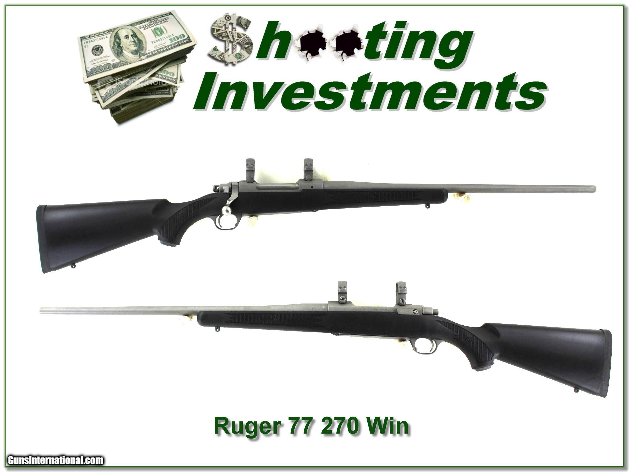 Description: All-Weather hunters this is an excellent condition Stainless All-Weather Ruger 77 in 270 Winchester. It has 22in barrel and comes with factory rings as seen. It’s about new and I’m sure not many rounds fired! Shipping with insurance is $49. Please email me with any questions or larger pictures. (Consign your quality firearms with Shooting Investments for only 12%! Let me know if you have any you would like to sell!) 24-0229 Payment: Payment is by Money Order, Cashier’s Check or Personal Check. I can now also accept Credit Cards (MasterCard, Visa, Discover & American Express) with a 3% convenience fee. Shipping: The shipping charge will be listed in each description. It is $49 for most firearms. Some heavy guns or those insured for over $2000 will be higher. Shipments to Alaska and Hawaii are higher because air shipment is required. Most firearms are shipped on Tuesday and Thursday and usually in 5 days of receipt of payment. We package all shipments carefully and insure them. Optics are shipped Priority Mail and most other non-firearm shipments are shipped First Class. Returns: Our return policy is simple. If for any reason you are not pleased with your purchase, you may return your item for a full refund of purchase price. Ammunition cannot be returned. It is important to us that you are happy. Guns cannot be fired or dissembled before returning them and they must be returned in the same condition as received. Notification of a return must occur within 3 days of receipt at your dealer. Shipping, convenience and dealer fees are not refundable and are the responsibility of the buyer. Lay-a-way: If needed, we offer a 60 day lay-a-way option on most firearms. It is 1/3 now, 1/3 in 30 days and 1/3 in 60 days. Lay-a-way firearm sales are final and cannot be returned. If a lay-a-way is not completed the first payment cannot be refunded. Consigning your firearms with Shooting Investments: We will help you get top dollar for your firearms. While most local guns shops charge 20% or more, our fee is only 12% with a minimum of $75. At your local gun shop it might take months to sell. Selling on-line provides instant access to thousands of interested buyers. You won’t find any other on-line dealer willing to sell your firearms for only 12% or listing every gun on 3 separate s. Selling through an House typically costs the seller 15% and the buyer an addition 15% (so 30%) and you have to wait several months to sell and longer to receive funds. If properly priced, we will sell your firearms within a few weeks. Send us an email or give us a call and we’ll explain how easy it is for you to get top dollar. Trading: Trading for us is really just buying your gun to re-sell. If you have a gun you want to trade, please email a picture and we will let you know what we can give for it. You will always get more if we sell it for you on consignment. SOLD |