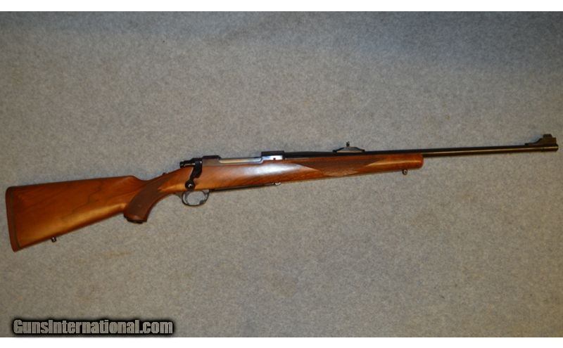 Description: Ruger M77 chambered in 30-06 springfield .30-06 Springfield SOLD Chambers: Hinged floorplate. Metal Condition: Excellent. Wood Condition: Excellent with some very light handling marks. Barrels: 22". Triggers: Single. Stock Dimensions: 14" LOP. Fore End: Checkered Walnut. Butt Pad: Red Rubber. Sights: Ramp Blade Front / Adjustable Target Rear. Item Location: Berlin |