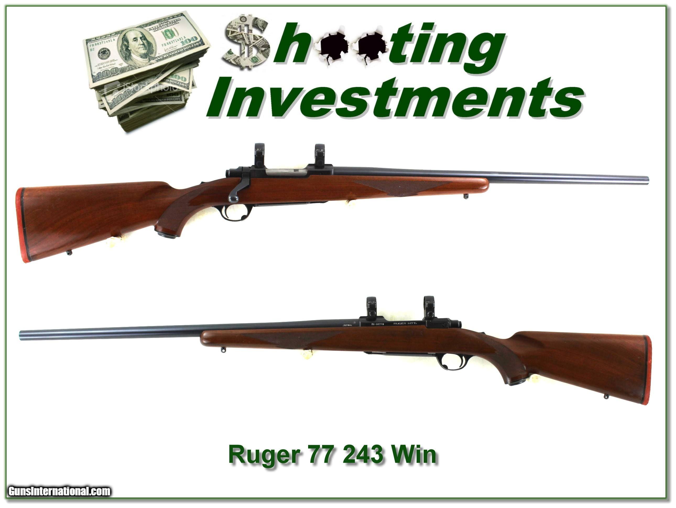 Description: Collectors and hunters, this is a first model Ruger M77 “Flat Bolt” in the very hard to find 243 Winchester with the 24in heavy varmint barrel! The metal is about excellent with a bright shiny bore. The wood has a few marks mostly on the left side under the receiver. It will make a classic field gun or be a fine addition to your collection! It is a real Shooting Investment! Shipping and insurance is $49. Please email me with any questions or larger pictures. (Consign your quality firearms with Shooting Investments for only 12%! Let me know if you have any you would like to sell!) 24-1084 Payment: Payment is by Money Order, Cashier’s Check or Personal Check. I can now also accept Credit Cards (MasterCard, Visa, Discover & American Express) with a 3% convenience fee. Shipping: The shipping charge will be listed in each description. It is $49 for most firearms. Some heavy guns or those insured for over $2000 will be higher. Shipments to Alaska and Hawaii are higher because air shipment is required. Most firearms are shipped on Tuesday and Thursday and usually in 5 days of receipt of payment. We package all shipments carefully and insure them. Optics are shipped Priority Mail and most other non-firearm shipments are shipped First Class. Returns: Our return policy is simple. If for any reason you are not pleased with your purchase, you may return your item for a full refund of purchase price. Ammunition cannot be returned. It is important to us that you are happy. Guns cannot be fired or dissembled before returning them and they must be returned in the same condition as received. Notification of a return must occur within 3 days of receipt at your dealer. Shipping, convenience and dealer fees are not refundable and are the responsibility of the buyer. Lay-a-way: If needed, we offer a 60 day lay-a-way option on most firearms. It is 1/3 now, 1/3 in 30 days and 1/3 in 60 days. Lay-a-way firearm sales are final and cannot be returned. If a lay-a-way is not completed the first payment cannot be refunded. Consigning your firearms with Shooting Investments: We will help you get top dollar for your firearms. While most local guns shops charge 20% or more, our fee is only 12% with a minimum of $75. At your local gun shop it might take months to sell. Selling on-line provides instant access to thousands of interested buyers. You won’t find any other on-line dealer willing to sell your firearms for only 12% or listing every gun on 3 separate s. Selling through an House typically costs the seller 15% and the buyer an addition 15% (so 30%) and you have to wait several months to sell and longer to receive funds. If properly priced, we will sell your firearms within a few weeks. Send us an email or give us a call and we’ll explain how easy it is for you to get top dollar. Trading: Trading for us is really just buying your gun to re-sell. If you have a gun you want to trade, please email a picture and we will let you know what we can give for it. You will always get more if we sell it for you on consignment. SOLD |