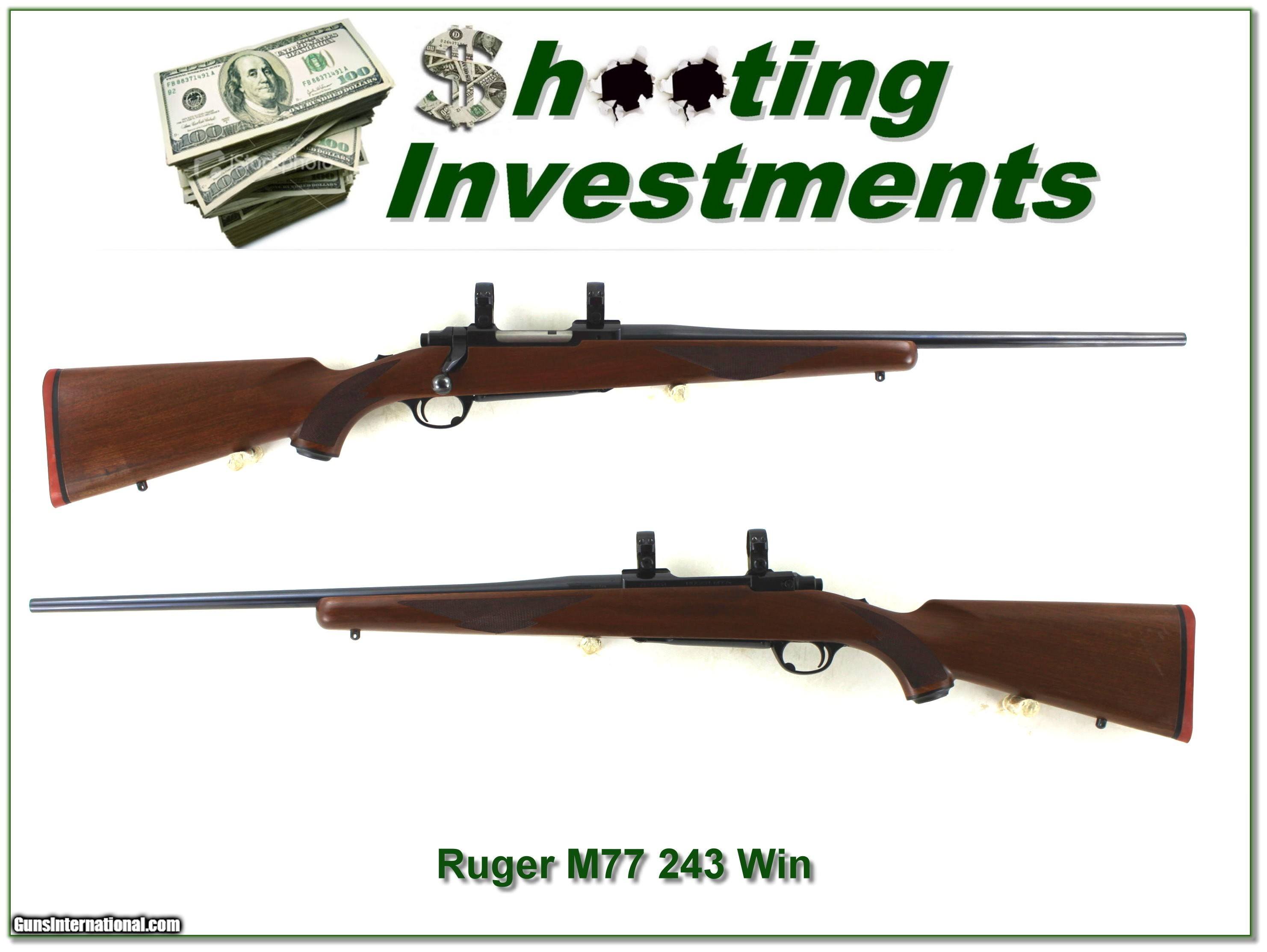 Description: Collectors and hunters, this is an excellent condition earlier Ruger M77 in 243 Winchester. It has the Red Pad and Tang Safety. The barrel is 22in and it comes with factory rings as seen. The blue is excellent with no marks I see except a small on the floor plate. From the bolt I’m sure only a couple rounds fired. I find just a few marks on the walnut. It will make a classic hunting gun! Shipping and insurance is $49. Please email me with any questions or larger pictures. (Consign your quality firearms with Shooting Investments for only 12%! Let me know if you have any you would like to sell!) 25-0321 Payment: Payment is by Money Order, Cashier’s Check or Personal Check. I can now also accept Credit Cards (MasterCard, Visa, Discover & American Express) with a 3% convenience fee. Shipping: The shipping charge will be listed in each description. It is $49 for most firearms. Some heavy guns or those insured for over $2000 will be higher. Shipments to Alaska and Hawaii are higher because air shipment is required. Most firearms are shipped on Tuesday and Thursday and usually in 5 days of receipt of payment. We package all shipments carefully and insure them. Optics are shipped Priority Mail and most other non-firearm shipments are shipped First Class. Returns: Our return policy is simple. If for any reason you are not pleased with your purchase, you may return your item for a full refund of purchase price. Ammunition cannot be returned. It is important to us that you are happy. Guns cannot be fired or dissembled before returning them and they must be returned in the same condition as received. Notification of a return must occur within 3 days of receipt at your dealer. Shipping, convenience and dealer fees are not refundable and are the responsibility of the buyer. Lay-a-way: If needed, we offer a 60 day lay-a-way option on most firearms. It is 1/3 now, 1/3 in 30 days and 1/3 in 60 days. Lay-a-way firearm sales are final and cannot be returned. If a lay-a-way is not completed the first payment cannot be refunded. Consigning your firearms with Shooting Investments: We will help you get top dollar for your firearms. While most local guns shops charge 20% or more, our fee is only 12% with a minimum of $100. At your local gun shop it might take months to sell. Selling on-line provides instant access to thousands of interested buyers. You won’t find any other on-line dealer willing to sell your firearms for only 12% or listing every gun on 3 separate s. Selling through an House typically costs the seller 15% and the buyer an addition 15% (so 30%) and you have to wait several months to sell and longer to receive funds. If properly priced, we will sell your firearms within a few weeks. Send us an email or give us a call and we’ll explain how easy it is for you to get top dollar. Trading: Trading for us is really just buying your gun to re-sell. If you have a gun you want to trade, please email a picture and we will let you know what we can give for it. You will always get more if we sell it for you on consignment. SOLD |