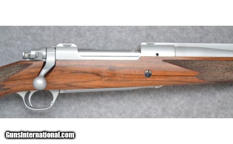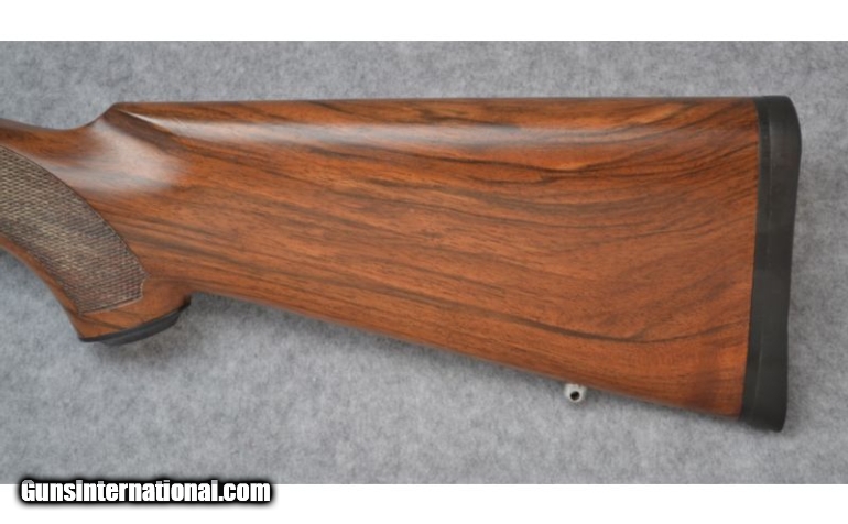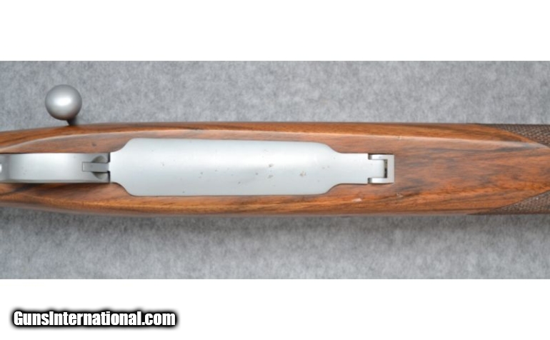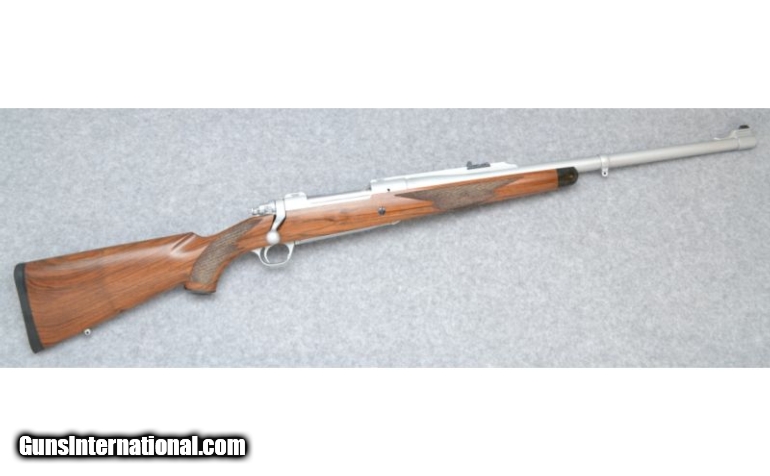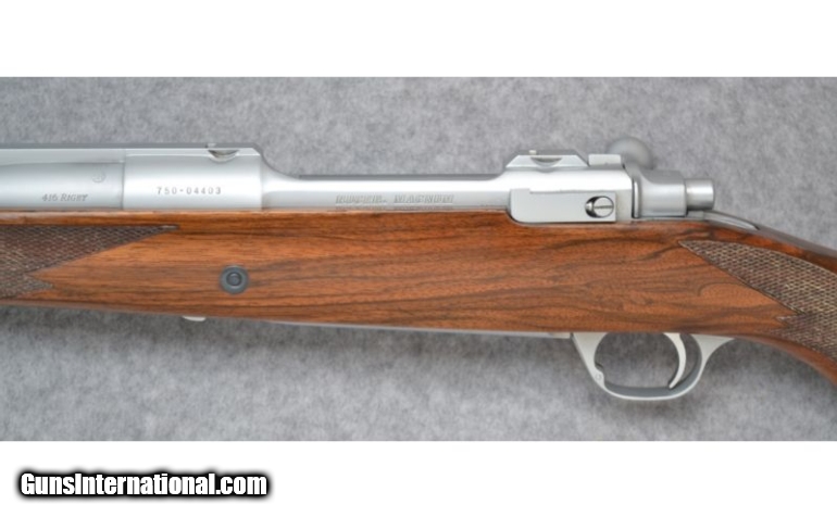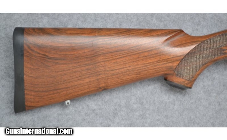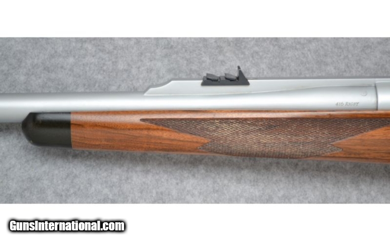 Description: SOLD Manufacturer: SN: 750-04XXX Caliber Info: .416 Rigby Metal Condition: Good with normal handling marks Wood Condition: Shows some nicks and dings Bore Condition: Sharp grooves and bright lands Barrels: 23 Stock: Checkered hardwood Stock Dimensions: LOP: 13 1/2 Fore End: Checkered hardwood Butt Pad: Ruger black rubber pad Weight: 9 lbs., 10 oz. Sights: Front blade with brass bead, rear notch with two flip up notches to adjust elevation Item Location: Christiana, DE |