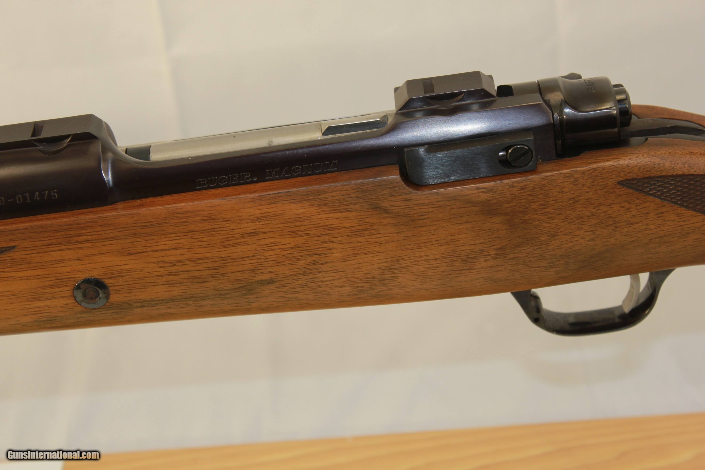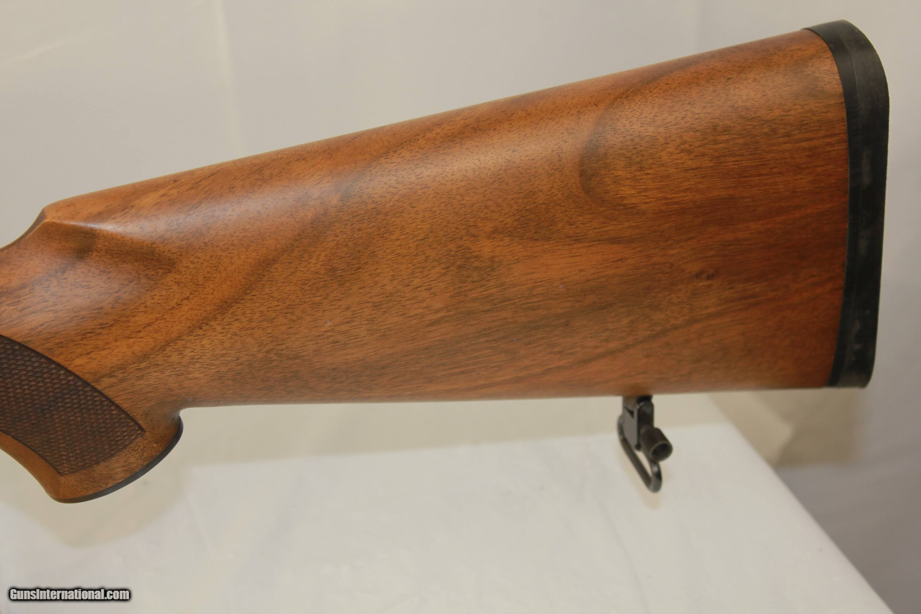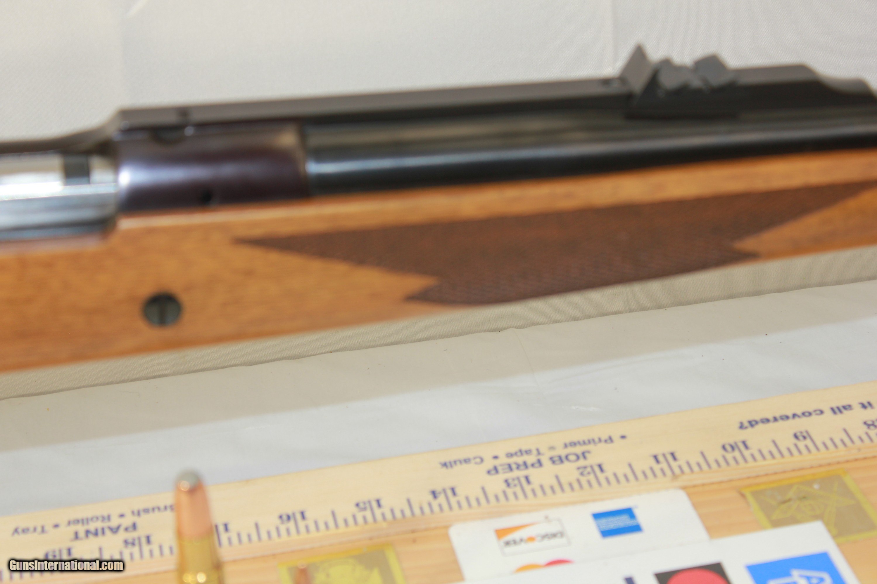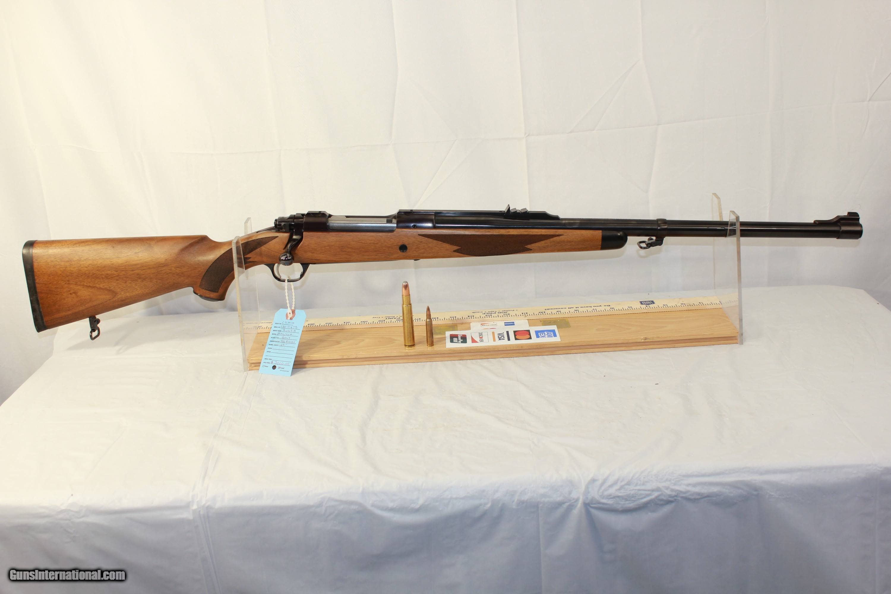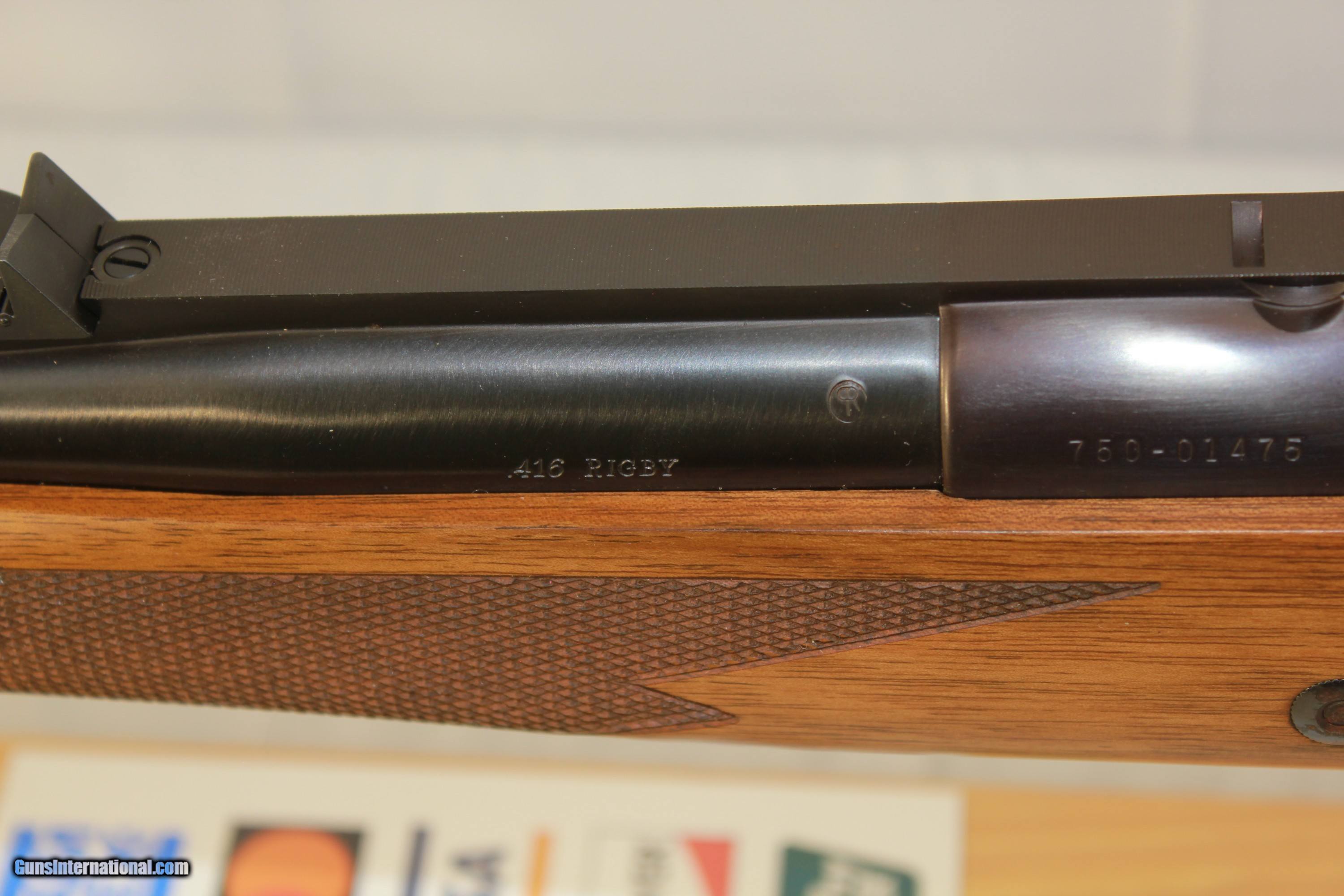 Description: This is a Ruger Magnum action rifle in .416 Rigy caliber. The Model 77 Magnum is an enlarged action made for full length magnum calibers and was made for a few years in the 90's. These fine guns may never be made again. It has a 3 leaf rear sight with one standing. The 24 inch barrel has a bright, shiny bore. It comes with the quick detachable sling swivels. It is in excellent condition with the minimum of dings and scratches. This is a rifle that can handle any game world wide. The cartridges are .416 Riby left and 5.56mm on the right $80.00 shipping via Priority Mail SOLD |