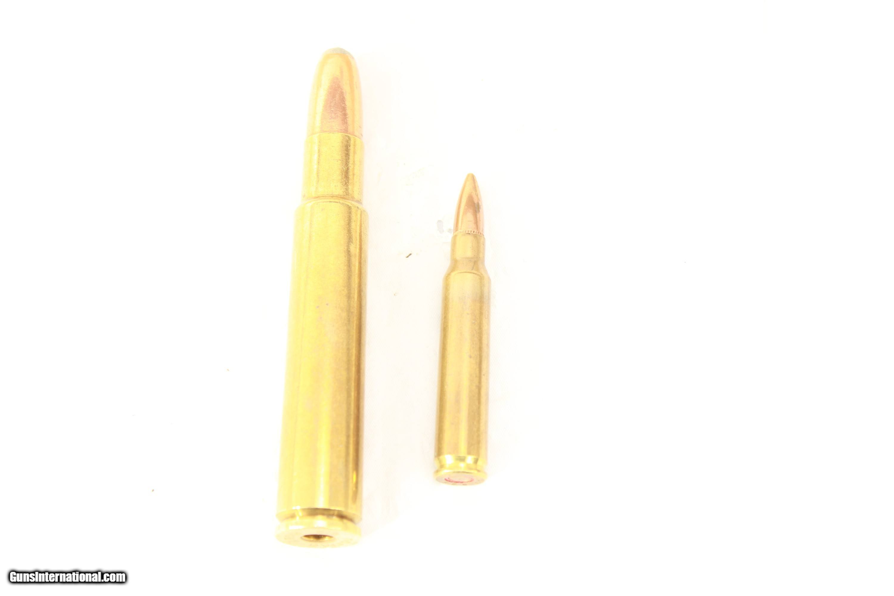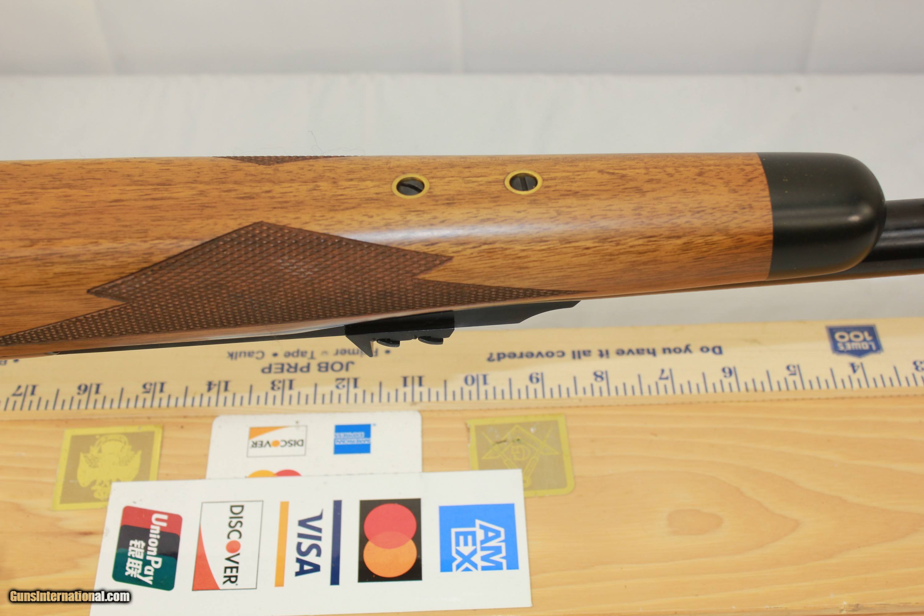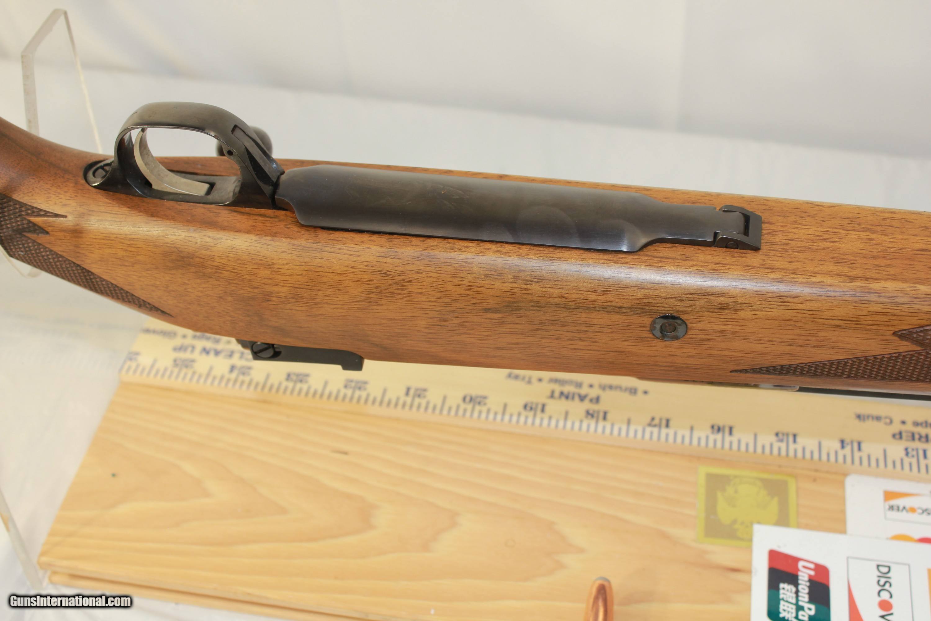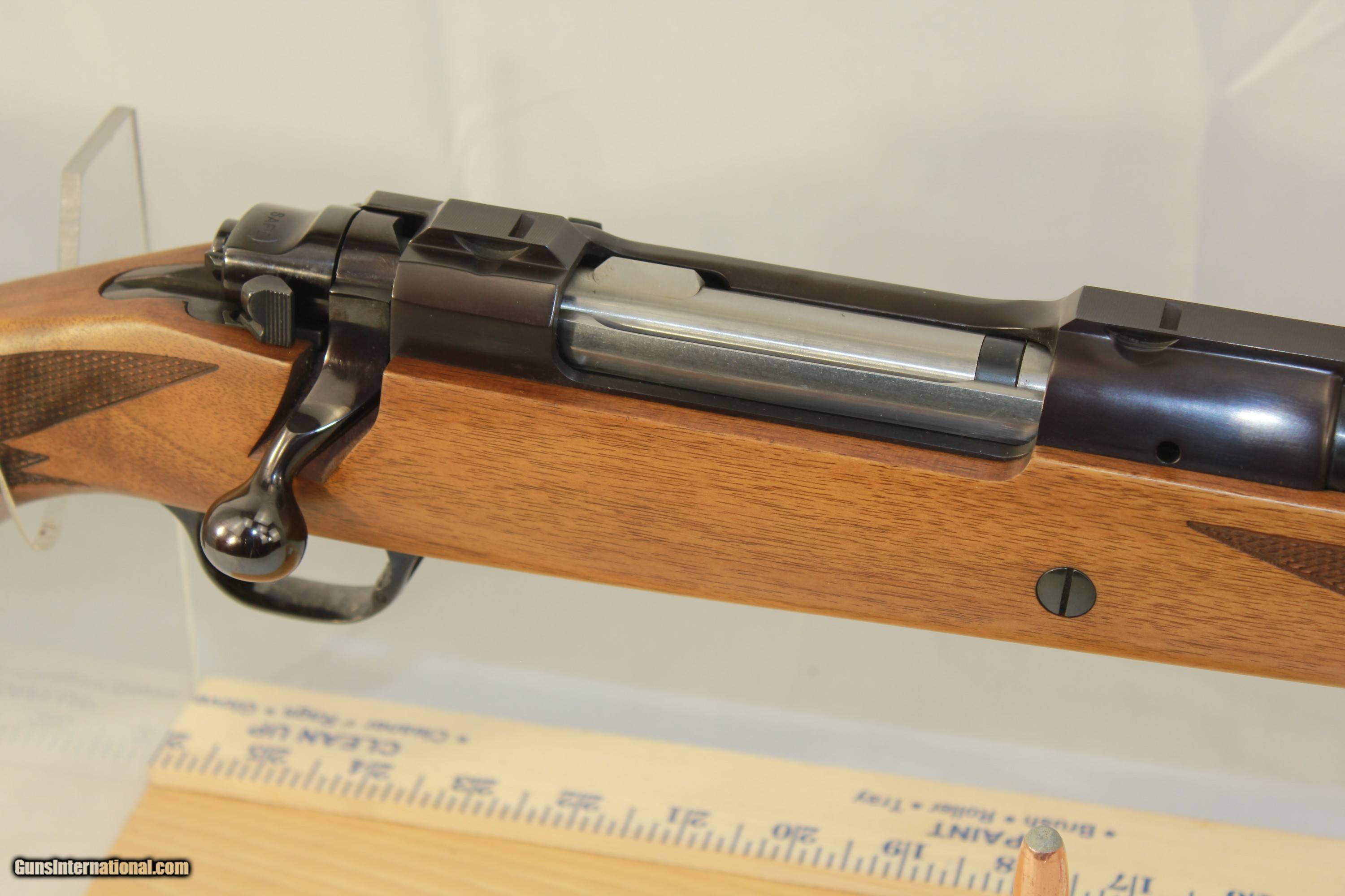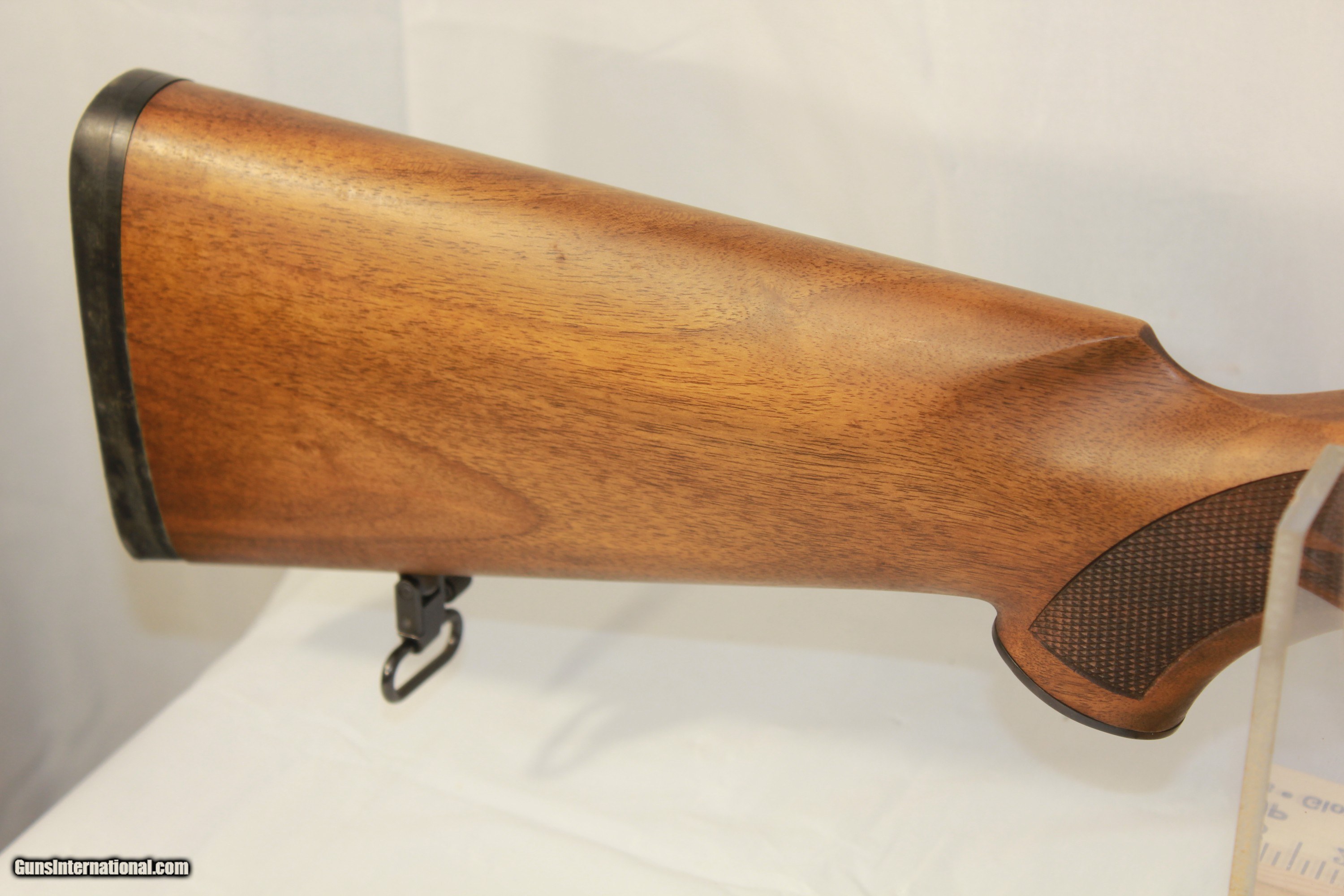 Description: This is a Ruger Magnum action rifle in .416 Rigy caliber. The Model 77 Magnum is an enlarged action made for full length magnum calibers and was made for a few years in the 90's. These fine guns may never be made again. It has a 3 leaf rear sight with one standing. The 24 inch barrel has a bright, shiny bore. It comes with the quick detachable sling swivels. It is in excellent condition with the minimum of dings and scratches. This is a rifle that can handle any game world wide. The cartridges are .416 Riby left and 5.56mm on the right $80.00 shipping via Priority Mail SOLD |
