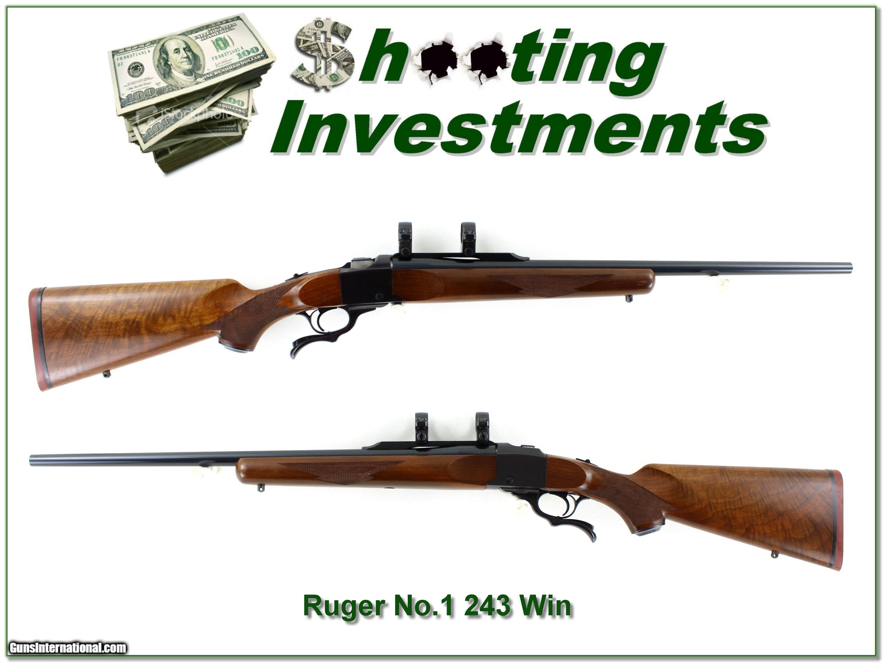 Description: Ruger No. 1 Rifle in .243 Win with 24” barrel, manufactured in 1978. This rifle is in excellent collector condition with no marks of note. Features classic falling block action, extra nice walnut stock, and sought-after red recoil pad. Known for exceptional accuracy and craftsmanship. Excellent condition with clean bore and smooth operation. A vintage Ruger perfect for hunters and collectors alike. Shipping and insurance is $49. Please email me with any questions or larger pictures. (Consign your quality firearms with Shooting Investments for only 12%! Let me know if you have any you would like to sell!) 25-1049 Payment: Payment is by Money Order, Cashier’s Check or Personal Check. I can now also accept Credit Cards (MasterCard, Visa, Discover & American Express) with a 3% convenience fee. Shipping: The shipping charge will be listed in each description. It is $49 for most firearms. Some heavy guns or those insured for over $2000 will be higher. Shipments to Alaska and Hawaii are higher because air shipment is required. Most firearms are shipped on Tuesday and Thursday and usually in 5 days of receipt of payment. We package all shipments carefully and insure them. Optics are shipped Priority Mail and most other non-firearm shipments are shipped First Class. Returns: Our return policy is simple. If for any reason you are not pleased with your purchase, you may return your item for a full refund of purchase price. Ammunition cannot be returned. It is important to us that you are happy. Guns cannot be fired or dissembled before returning them and they must be returned in the same condition as received. Notification of a return must occur within 3 days of receipt at your dealer. Shipping, convenience and dealer fees are not refundable and are the responsibility of the buyer. Lay-a-way: If needed, we offer a 60 day lay-a-way option on most firearms. It is 1/3 now, 1/3 in 30 days and 1/3 in 60 days. Lay-a-way firearm sales are final and cannot be returned. If a lay-a-way is not completed the first payment cannot be refunded. Consigning your firearms with Shooting Investments: We will help you get top dollar for your firearms. While most local guns shops charge 20% or more, our fee is only 12% with a minimum of $100. At your local gun shop it might take months to sell. Selling on-line provides instant access to thousands of interested buyers. You won’t find any other on-line dealer willing to sell your firearms for only 12% or listing every gun on 3 separate s. Selling through an House typically costs the seller 15% and the buyer an addition 15% (so 30%) and you have to wait several months to sell and longer to receive funds. If properly priced, we will sell your firearms within a few weeks. Send us an email or give us a call and we’ll explain how easy it is for you to get top dollar. Trading: Trading for us is really just buying your gun to re-sell. If you have a gun you want to trade, please email a picture and we will let you know what we can give for it. You will always get more if we sell it for you on consignment. SOLD |