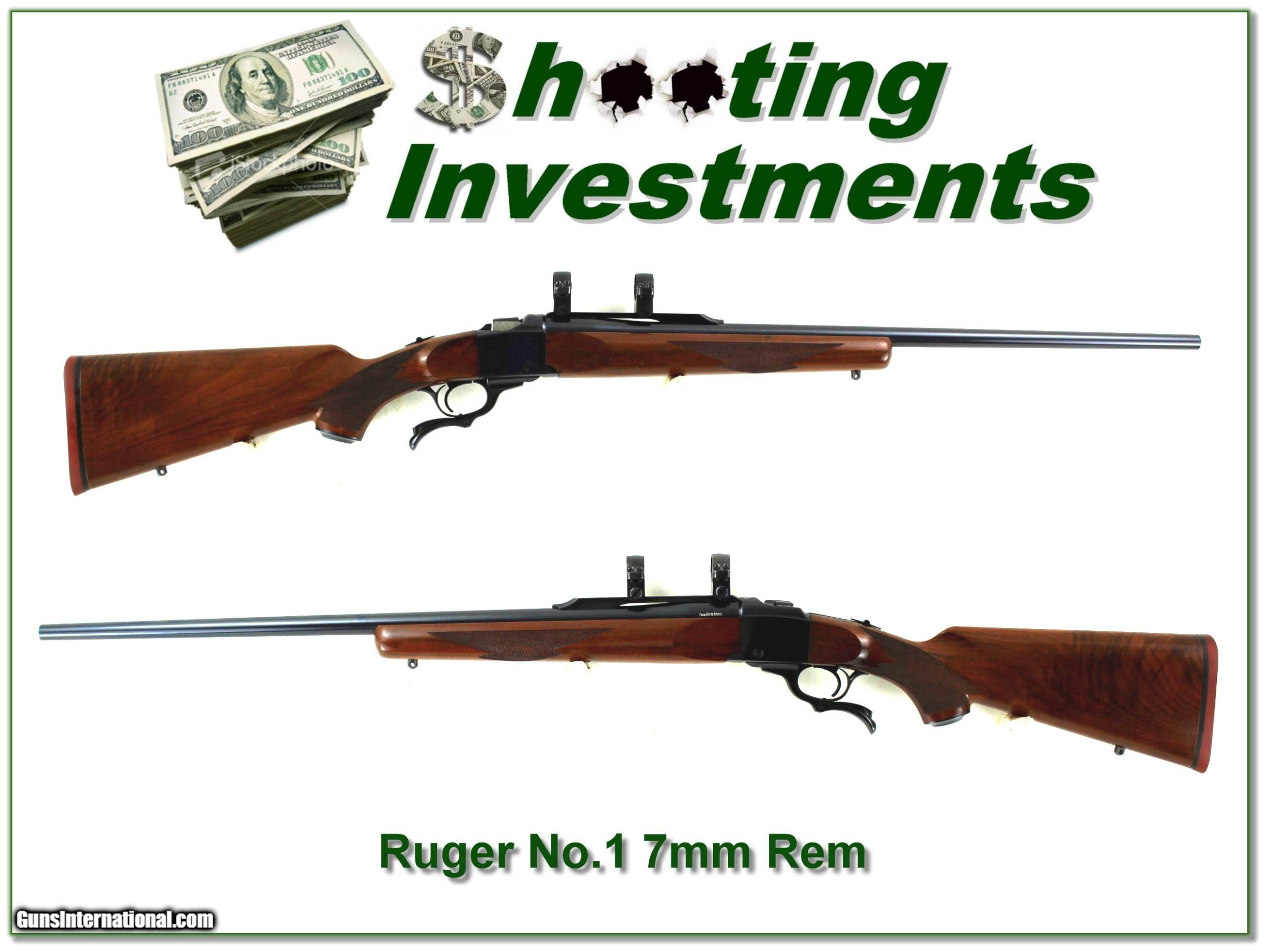 Description: Collectors, shooters and hunters, this is an early Ruger No.1 B in 7mm Remington Magnum. It is a pre-warning Red Pad with beautiful walnut! The have 26in barrels and this one includes factory rings as seen. I find no marks or wear on the metal, and I only find a few insignificant marks on the wood. It will make a fine addition to your collection and it is a real Shooting investment for sure! Shipping and insurance is $49. Please email me with any questions or larger pictures. (Consign your quality firearms with Shooting Investments for only 12%! Let me know if you have any you would like to sell!) 22-0902 Payment: Payment is by Money Order, Cashiers Check or Personal Check. I can now also accept Credit Cards (MasterCard, Visa, Discover & American Express) with a 3% convenience fee. Shipping: The shipping charge will be listed in each description. It is $49 for most long guns. Some heavy guns, over 48in boxes or those insured for over $2000 will be higher. Shipments to Alaska and Hawaii are higher because air shipment is required. Most firearms are shipped on Tuesday and Thursday and usually in 5 days of receipt of payment. We package all shipments carefully and insure them. Optics are shipped Priority Mail and most other non-firearm shipments are shipped First Class. Returns: Our return policy is simple. If for any reason you are not pleased with your purchase, you may return your item for a full refund of purchase price. Ammunition cannot be returned. It is important to us that you are happy. Guns cannot be fired or dissembled before returning them and they must be returned in the same condition as received. Notification of a return must occur with-in 3 days of receipt at your dealer. Shipping, convenience and dealer fees are not refundable and are the responsibility of the buyer. Lay-a-way: If needed, we offer a 60 day lay-a-way option on most firearms. It is 1/3 now, 1/3 in 30 days and 1/3 in 60 days. Lay-a-way firearm sales are final and if not completed the first payment cannot be returned. Consigning your firearms with Shooting Investments: We will help you get top dollar for your firearms. While most local guns shops charge 20% or more, our fee is only 12% with a minimum of $75. At your local gun shop it might take months to sell. Selling on-line provides instant access to thousands of interested buyers. You won’t find any other on-line dealer willing to sell your firearms for only 12% or listing every gun on 3 separate s. Selling through an House typically costs the seller 15% and the buyer an addition 15% (so 30%) and you have to wait several months to sell and longer to receive funds. If properly priced, we will sell your firearms in a few weeks. Send us an email or give us a call and we’ll explain how easy it is for you to get top dollar. Trading: Trading for use is really just buying your gun to re-sell. If you have a gun you want to trade, please email a picture and we will let you know what we can give or it. You will always get more if we sell it for you on consignment. Help for California Buyers: We are happy to ship to California. It is the buyer’s responsibility to make sure any item you buy is legal in your state. We are also happy to help with your purchase of a firearm from someone other than us. If you see a gun you would like to buy but the seller can’t or won’t ship to California they can ship to use and we’ll then ship it to your California dealer. The cost for this service is only $30 + shipping. Let us know if we can help! SOLD |