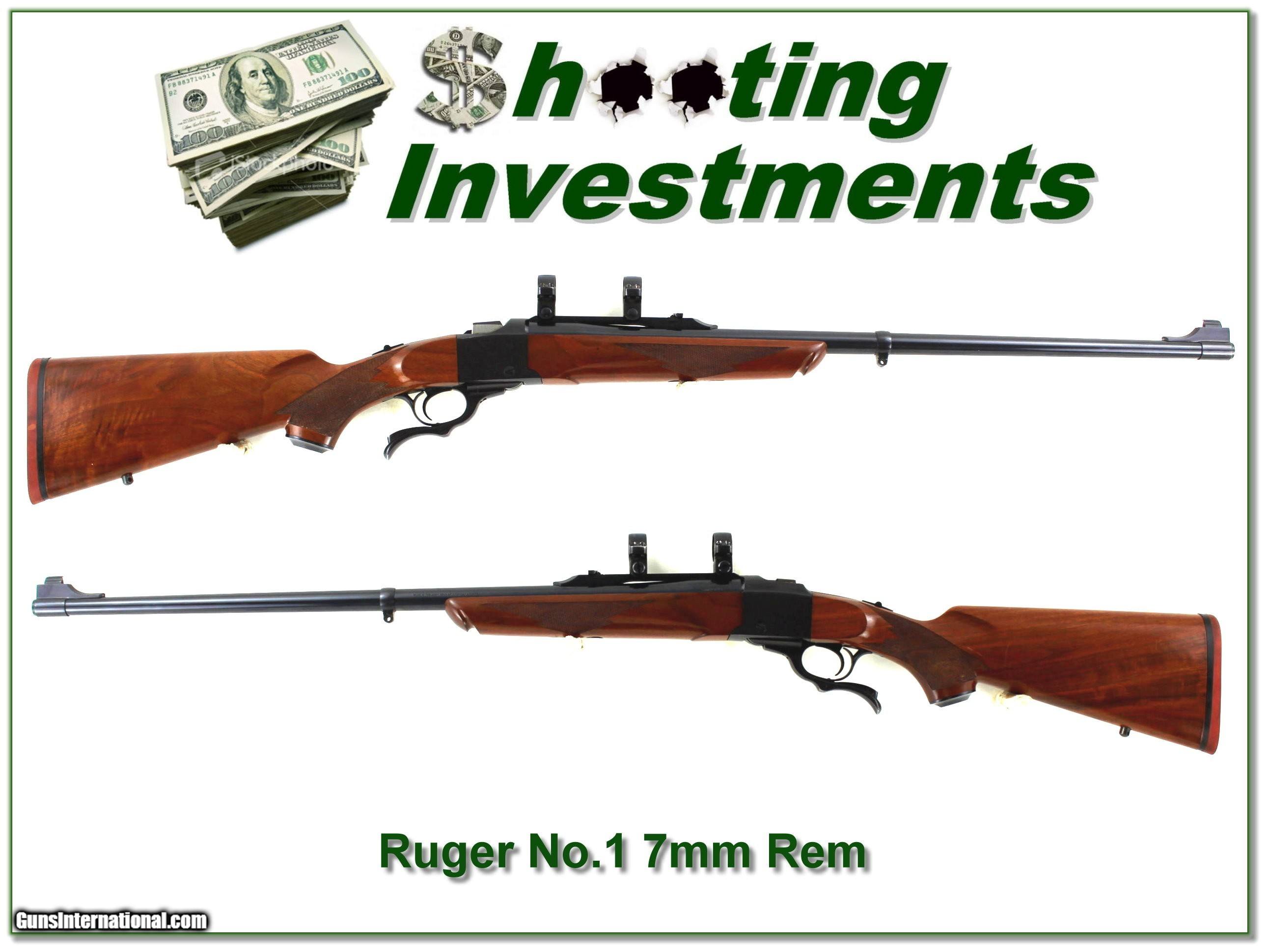 Description: Collectors and long range hunters, this is an excellent condition 1976 made Liberty Ruger No.1 Sporter in 7mm Remington Magnum. It is a Red Pad and pre-warning Ruger! The metal is excellent, and it has a 26in barrel with open sights and comes with factory rings as seen. The walnut has only a few minor handing marks. It will make a classic hunting gun or be a fine addition to your collection! Either way it’s a real Shooting Investment for sure! Shipping and insurance is $49. Please email me with any questions or larger pictures. (Consign your quality firearms with Shooting Investments for only 12%! Let me know if you have any you would like to sell!) 23-0679 Payment: Payment is by Money Order, Cashier’s Check or Personal Check. I can now also accept Credit Cards (MasterCard, Visa, Discover & American Express) with a 3% convenience fee. Shipping: The shipping charge will be listed in each description. It is $49 for most firearms. Some heavy guns or those insured for over $2000 will be higher. Shipments to Alaska and Hawaii are higher because air shipment is required. Most firearms are shipped on Tuesday and Thursday and usually in 5 days of receipt of payment. We package all shipments carefully and insure them. Optics are shipped Priority Mail and most other non-firearm shipments are shipped First Class. Returns: Our return policy is simple. If for any reason you are not pleased with your purchase, you may return your item for a full refund of purchase price. Ammunition cannot be returned. It is important to us that you are happy. Guns cannot be fired or dissembled before returning them and they must be returned in the same condition as received. Notification of a return must occur within 3 days of receipt at your dealer. Shipping, convenience and dealer fees are not refundable and are the responsibility of the buyer. Lay-a-way: If needed, we offer a 60 day lay-a-way option on most firearms. It is 1/3 now, 1/3 in 30 days and 1/3 in 60 days. Lay-a-way firearm sales are final and cannot be returned. If a lay-a-way is not completed the first payment cannot be refunded. Consigning your firearms with Shooting Investments: We will help you get top dollar for your firearms. While most local guns shops charge 20% or more, our fee is only 12% with a minimum of $75. At your local gun shop it might take months to sell. Selling on-line provides instant access to thousands of interested buyers. You won’t find any other on-line dealer willing to sell your firearms for only 12% or listing every gun on 3 separate s. Selling through an House typically costs the seller 15% and the buyer an addition 15% (so 30%) and you have to wait several months to sell and longer to receive funds. If properly priced, we will sell your firearms within a few weeks. Send us an email or give us a call and we’ll explain how easy it is for you to get top dollar. Trading: Trading for us is really just buying your gun to re-sell. If you have a gun you want to trade, please email a picture and we will let you know what we can give for it. You will always get more if we sell it for you on consignment. SOLD |
