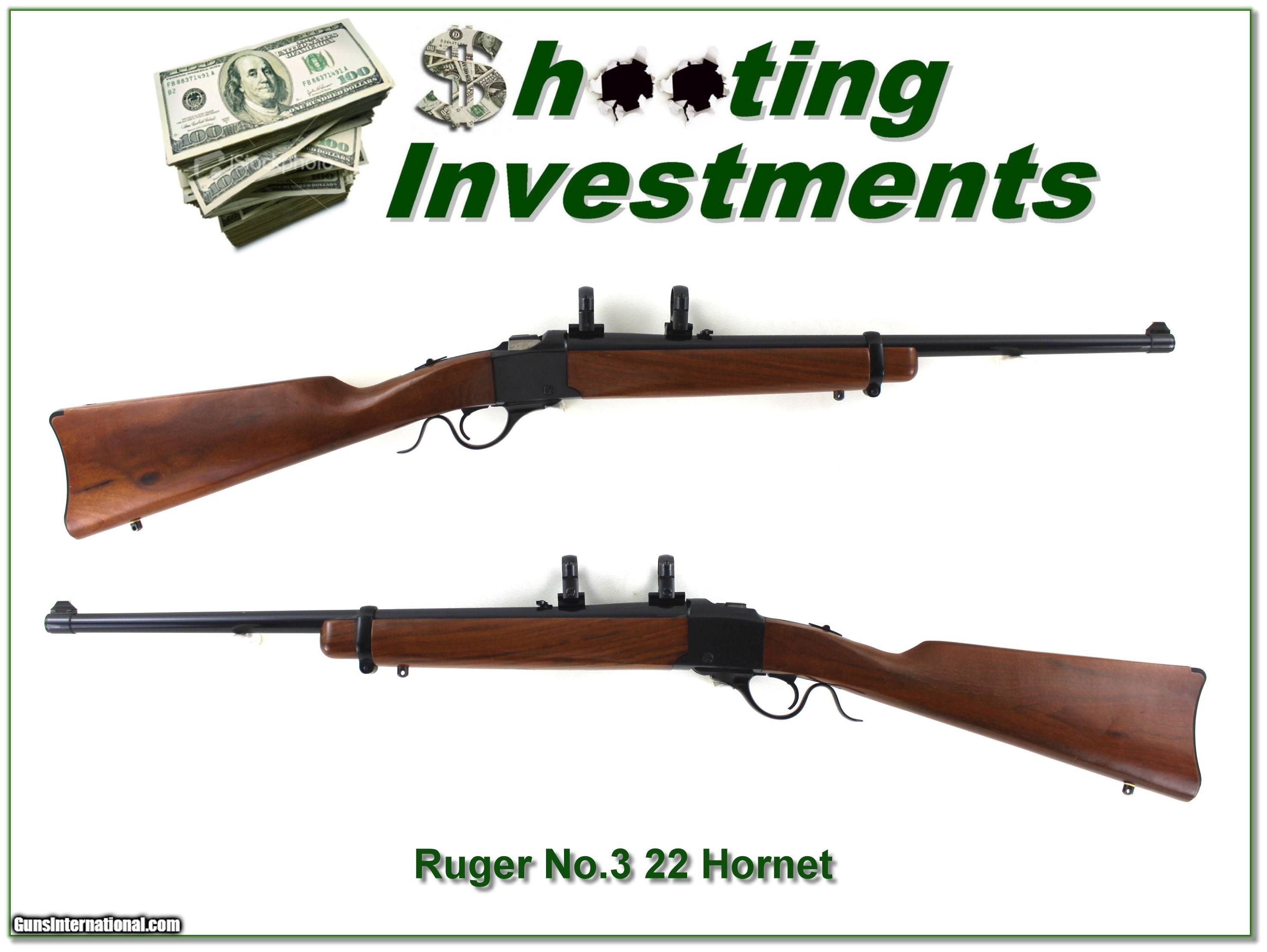 Description: Shooters and collectors, this is a very nice Ruger No.3 in 22 Hornet. It is an early pre-warning Ruger. The metal is excellent with no marks I see. It has a 22in barrel and comes with bases and rings as seen. The wood has just a few minor marks. It will make a fine addition to your collection! Shipping and insurance is $49. Please email me with any questions or larger pictures. (Consign your quality firearms with Shooting Investments for only 12%! Let me know if you have any you would like to sell!) 25-0564 Payment: Payment is by Money Order, Cashier’s Check or Personal Check. I can now also accept Credit Cards (MasterCard, Visa, Discover & American Express) with a 3% convenience fee. Shipping: The shipping charge will be listed in each description. It is $49 for most firearms. Some heavy guns or those insured for over $2000 will be higher. Shipments to Alaska and Hawaii are higher because air shipment is required. Most firearms are shipped on Tuesday and Thursday and usually in 5 days of receipt of payment. We package all shipments carefully and insure them. Optics are shipped Priority Mail and most other non-firearm shipments are shipped First Class. Returns: Our return policy is simple. If for any reason you are not pleased with your purchase, you may return your item for a full refund of purchase price. Ammunition cannot be returned. It is important to us that you are happy. Guns cannot be fired or dissembled before returning them and they must be returned in the same condition as received. Notification of a return must occur within 3 days of receipt at your dealer. Shipping, convenience and dealer fees are not refundable and are the responsibility of the buyer. Lay-a-way: If needed, we offer a 60 day lay-a-way option on most firearms. It is 1/3 now, 1/3 in 30 days and 1/3 in 60 days. Lay-a-way firearm sales are final and cannot be returned. If a lay-a-way is not completed the first payment cannot be refunded. Consigning your firearms with Shooting Investments: We will help you get top dollar for your firearms. While most local guns shops charge 20% or more, our fee is only 12% with a minimum of $100. At your local gun shop it might take months to sell. Selling on-line provides instant access to thousands of interested buyers. You won’t find any other on-line dealer willing to sell your firearms for only 12% or listing every gun on 3 separate s. Selling through an House typically costs the seller 15% and the buyer an addition 15% (so 30%) and you have to wait several months to sell and longer to receive funds. If properly priced, we will sell your firearms within a few weeks. Send us an email or give us a call and we’ll explain how easy it is for you to get top dollar. Trading: Trading for us is really just buying your gun to re-sell. If you have a gun you want to trade, please email a picture and we will let you know what we can give for it. You will always get more if we sell it for you on consignment. SOLD |