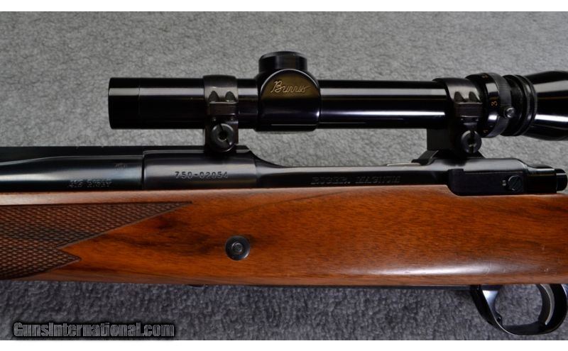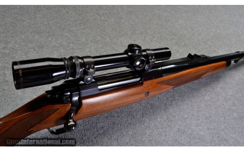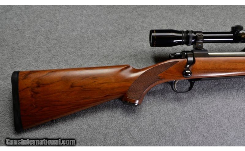 Description: This Ruger Magnum features a Mauser-style controlled feed with hinged floor plate, three leaf express sights with fiber optic front sight and a1-3/4-5X scope. The American walnut stock has a checkered grip and fore end and black fore end cap. This rifle is in very good condition ready for a big game hunt. SOLD Caliber Info: .416 Rigby Metal Condition: Excellent Wood Condition: Very Good. A few slight dings. Bore Condition: Excellent Barrels: 24 inch Triggers: Smooth Stock: American walnut, checkered grip and fore end. Stock Dimensions: 13.5 inch LOP Butt Pad: Black Ruger pad Weight: 10.70 pounds Sights: Three leaf express sights. Fullfield 1-3/4-5X scope. Item Location: Sidney, NE |