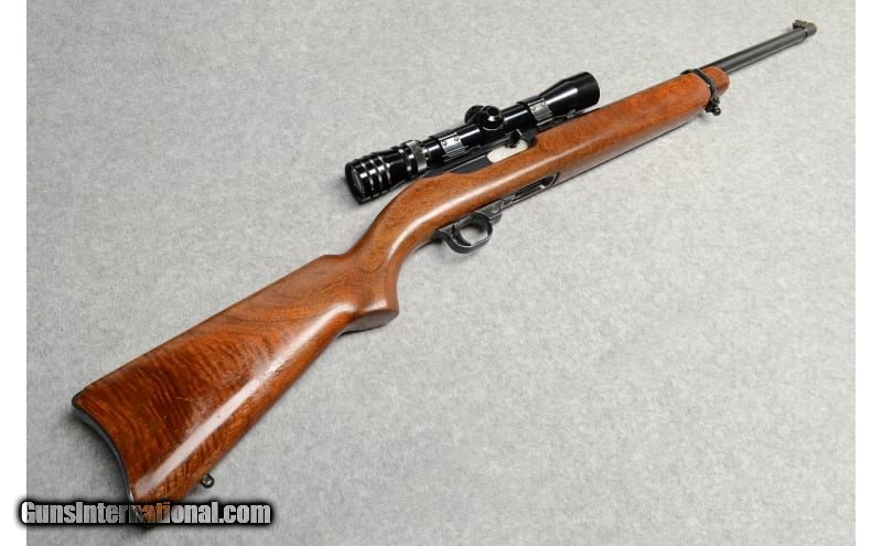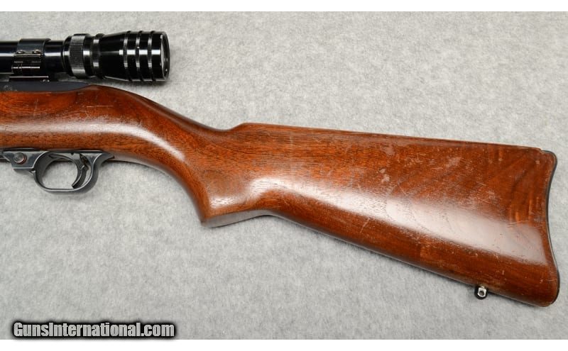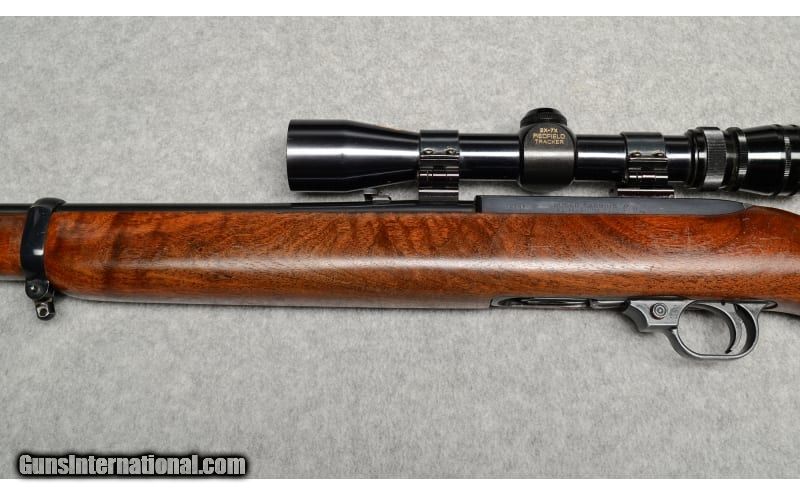 Description: This very desirable classic Ruger 44 Magnum Carbine was acquired through a Cabela's Columbus special acquisition from a gun . This semi-automatic rifle was manufactured in 1962 and features a very unique internal 4 round tubular magazine, Redfield Tracker 2-7x variable scope mounted with Weaver tip-off scope mounts, a varnished walnut stock with alloy butt plate, and sling swivels. Manufactured from was 1961 to 1985 the design of this rifle influenced the smaller and more popular Ruger 10/22 model chambered in .22 LR that would debut in 1964. The blue finish retains 99% of its original finish, with the walnut stock flaking in spots, and normal handling marks, with a patina starting to form from use, and a bore that is excellent with crisp rifling. .44 Magnum SOLD Chambers: .44 Remington Magnum Metal Condition: Very good Wood Condition: Good Bore Condition: Excellent Barrels: 18.5 Triggers: Factory Stock Dimensions: LOP 13.5 Fore End: Smooth walnut fore arm Butt Pad: Smooth black metal butt plate Weight: 7 lbs Sights: "2-7x Redfield Tracker Scope, blade front sight and folding rear irons Item Location: Columbus, OH |