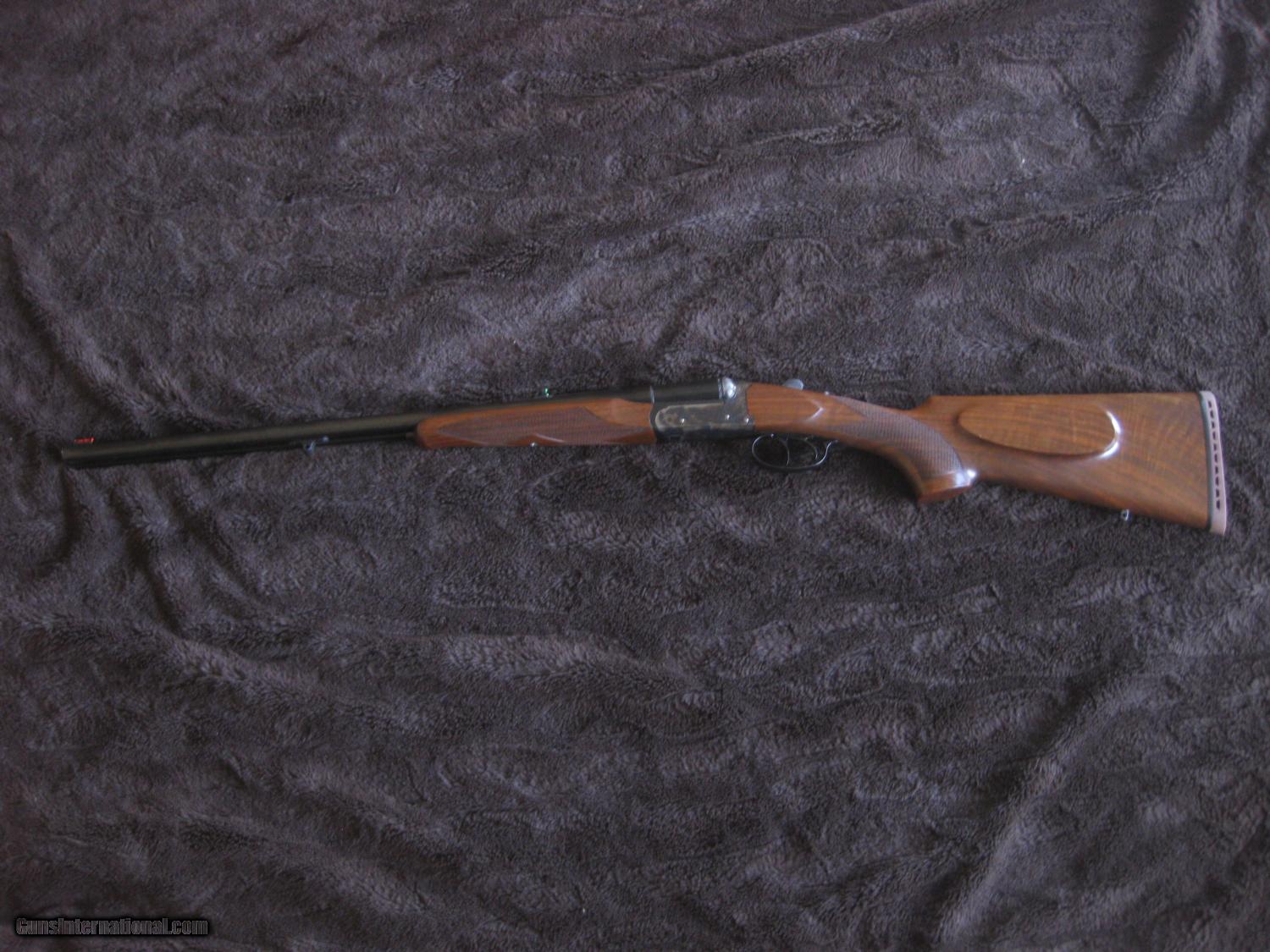 Description: SABATTI AFRICAN .45-70 Gov't. or 9.3x74mm, extractor rifle only, pistol-grip stock with cheekpiece, beavertail fore end, fiber optic sights front and rear, scope base included, case colored receiver with light game-scene engraving, regulated using Hornady ammunition. SOLD Manufacturer: Sabatti Model: African Caliber Info: 45-70 Government Ejectors: Extractor only Condition: New (Unfired ) Barrels: Double Triggers: Double Finish: Walnut oiled Sights: open Manufacture Date: N/A |