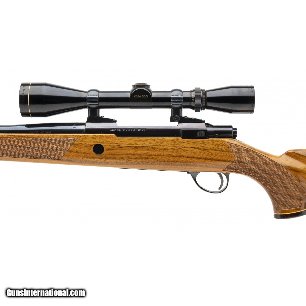 Description: " SN: 92356. Made circa mid 1970's. .270 with a 24.5"" barrel. Bore is bright with strong rifling. Finnish made deluxe Finnbear. Finish is in very good condition with thinning noted near the muzzle. Beechwood stock show light handling wear. Rifle comes with a 3-9X Leupold scope. Overall very good condition. SOLD |
