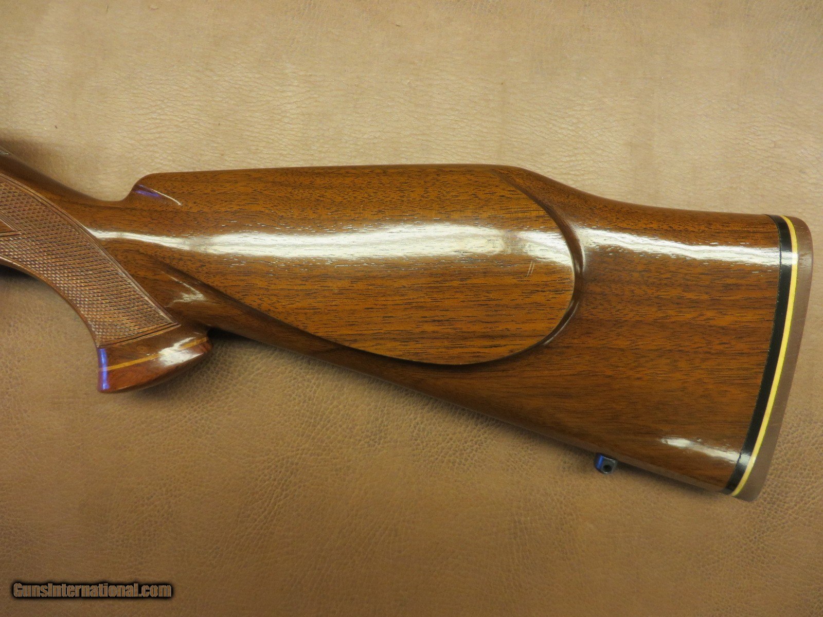 Description: .223 Remington with 20 inch pencil barrel on Sako roundtop action with Redfield base and rings for scope mounting. Serial number 125xxx. Checkered walnut stock has contrasting wood forend tip and pistol grip cap, palm swell, cheekpiece, sling swivel studs, and original rubber butt pad. Blue and wood are both in 99% condition. SOLD Rifle Caliber: .223 Remington |
