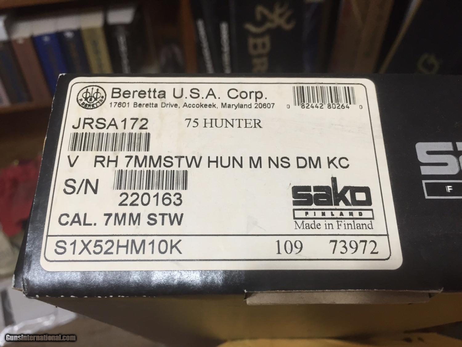 Description: SOLD SOLD SOLD. NIB Sako 75 Hunter in 7mm STW for sale. This rifle has been stored in my safe since purchase and is in immaculate condition. It has a matte finish Monte Carlo stock with hand checkering, a raised cheek piece and palm swell, 24 3/8" hammer forged free floating barrel, separate bolt release button, three lug bolt with 70 degree lift, detachable magazine, and a Leupold 3.5-10x40 Vari X III scope in Warne mounts. Sako rifles are renowned for their workmanship and accuracy. It includes the original box with all paperwork and accessories. Sorry, but I do not have the scope box. SOLD |