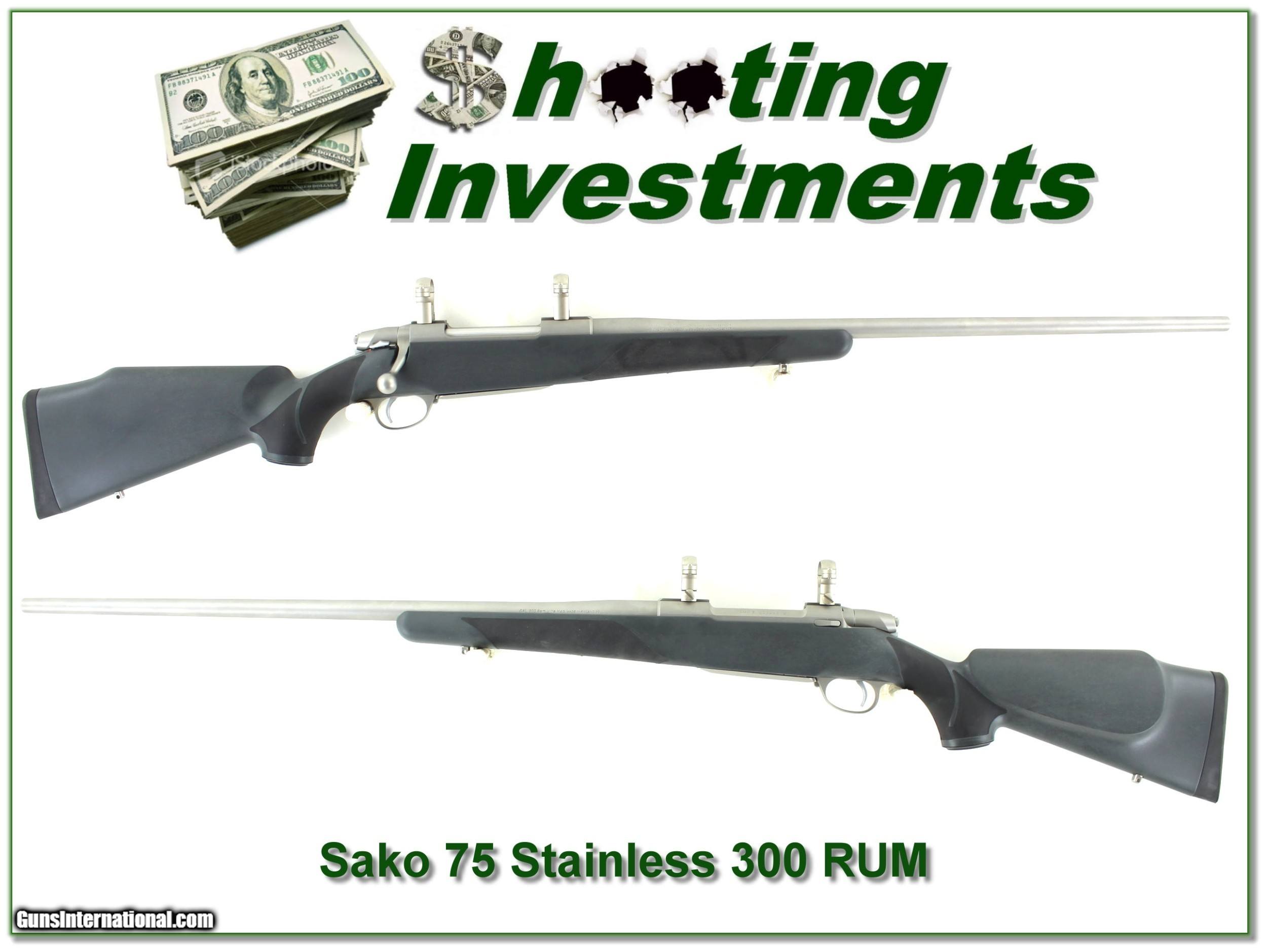 Description: This is a near new condition Sako Stainless 75 in the hard to find 300 RUM. I am sure only a couple rounds fired. It has a 26in barrel and comes with rings as seen. It will make a high-end all-weather long-range big game gun. You will look a while to find another one. Shipping and insurance is $39. Please email me with any questions or larger pictures. (Consign your quality firearms with Shooting Investments for only 12%! Let me know if you have any you would like to sell!) 21-0848 Payment: Payment is by Money Order, Cashier’s Check or Personal Check. I can now also accept Credit Cards (MasterCard, Visa, Discover & American Express) with a 3% convenience fee. Shipping: The shipping charge will be listed in each description. It is $39 for most firearms. Some heavy guns or those insured for over $2000 will be higher. Shipments to Alaska and Hawaii are higher because air shipment is required. Most firearms are shipped on Tuesday and Thursday and usually in 5 days of receipt of payment. We package all shipments carefully and insure them. Optics are shipped Priority Mail and most other non-firearm shipments are shipped First Class. Returns: Our return policy is simple. If for any reason you are not pleased with your purchase, you may return your item for a full refund of purchase price. Ammunition cannot be returned. It is important to us that you are happy. Guns cannot be fired or dissembled before returning them and they must be returned in the same condition as received. Notification of a return must occur within 3 days of receipt at your dealer. Shipping, convenience and dealer fees are not refundable and are the responsibility of the buyer. Lay-a-way: If needed, we offer a 60 day lay-a-way option on most firearms. It is 1/3 now, 1/3 in 30 days and 1/3 in 60 days. Lay-a-way firearm sales are final and cannot be returned. If a lay-a-way is not completed the first payment cannot be refunded. Consigning your firearms with Shooting Investments: We will help you get top dollar for your firearms. While most local guns shops charge 20% or more, our fee is only 12% with a minimum of $75. At your local gun shop it might take months to sell. Selling on-line provides instant access to thousands of interested buyers. You won’t find any other on-line dealer willing to sell your firearms for only 12% or listing every gun on 3 separate s. Selling through an House typically costs the seller 15% and the buyer an addition 15% (so 30%) and you have to wait several months to sell and longer to receive funds. If properly priced, we will sell your firearms within a few weeks. Send us an email or give us a call and we’ll explain how easy it is for you to get top dollar. Trading: Trading for us is really just buying your gun to re-sell. If you have a gun you want to trade, please email a picture and we will let you know what we can give for it. You will always get more if we sell it for you on consignment. Help for California Buyers: We are happy to ship to California. It is the buyer’s responsibility to make sure any item you buy is legal in your state. We are also happy to help with your purchase of a firearm from someone other than us. If you see a gun you would like to buy but the seller can’t or won’t ship to California they can ship to use and we’ll then ship it to your California dealer. The cost for this service is only $30 + shipping. Let us know if we can help! SOLD |