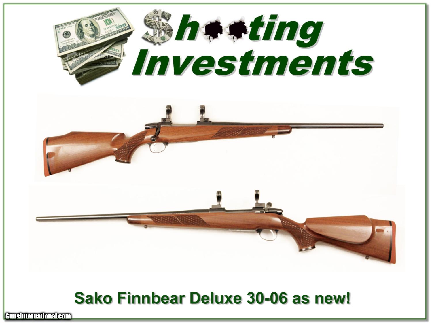 Description: Collectors and hunters this is a like new Sako Deluxe 75 in 30-06. I see no marks anywhere. It comes with Opti-lock bases and rings as shown. It has the 3 lug bolt. You won’t find a nice one! I am selling it on consignment and as such lay-a-way can’t be used. It does of course have the standard 3 day inspection. Shipping and insurance is $30 or $18 more if you want it shipped in a new Plano hard case. Please email me with any questions or larger pictures. (I now consign quality firearms only 10%! Let me know if you have any you would like to sell!) [15-0779] Payment: Payment is by Money Order, Cashiers Check or Personal Check. I can now also accept MasterCard and Visa with a 3% convenience fee. PayPal can be used for some items but never firearms. Please let us know if you would like to pay via PayPal. Shipping: The shipping charge will be listed in each description. It is $30 for most guns. Some heavy guns or those insured for over $2000 may be higher. Shipments to Alaska and Hawaii are higher because air shipment is required. Most firearms are shipped within 5 days of receipt of payment. We prefer shipping at the beginning of the week to avoid firearms in transit over weekends. We package all shipments carefully and insure them for the full purchase price, rounded up to the next $100. In the unlikely event that damage occurs, it is important that you save all packaging material for the claims process. Optics are shipped Priority Mail and most other non-firearm shipments are shipped First Class. Returns: Our return policy is simple. If for any reason you are not pleased with your purchase, you may return your item for a refund. The only exception is ammunition, it cannot be returned. It is important to us that you are happy. Guns cannot be fired or dissembled before returning them and must be returned in the same condition as received. Notification of a return must occur with-in 3 days of receipt at your dealer. Shipping, convenience and dealer fees are not refundable and are the responsibility of the buyer. Lay-a-way: If needed, we offer a 60 day lay-a-way option on most firearms. It is 1/3 now, 1/3 in 30 days and 1/3 in 60 days. Lay-a-way firearm sales are final. Consigning your firearms with Shooting Investments: We will help you get top dollar for your firearms. While most local guns shops charge 20% or more, our fee is only 10% with a minimum of $50. At your local gun shop it might take months to sell. Selling on-line provides instant access to thousands of interested buyers. You won’t find any other on-line dealer willing to sell your firearms for only 10% or listing every gun on 4 separate s. Selling through an House typically costs the seller 15% and the buyer an addition 15% (so 30%) and you have to wait several months to sell and longer to receive funds. If properly priced, we will sell your firearms in a week or two. Send us an email or give us a call and we’ll explain how easy it is for you to get top dollar. Trading: We collect guns and usually just trade for guns we want to add to our collections. We often sell guns for others wanting to purchase one of ours. We find this the most fair to both of us. Our Commission is only 10% and we hold the gun you want until yours sells. Please contact us if you want to sell one of yours to buy one of ours. Help for California Buyers: We are happy to ship to California. It is the buyer’s responsibility to make sure any item you buy is legal in your state. We are also happy to help with your purchase of a firearm from someone other than us. If you see a gun you would like to buy but the seller can’t or won’t ship to California we can help. You buy the gun and have it shipped to us. We’ll then ship it to your California dealer. The cost for this service is only $30 + shipping. Let me know if we can help! SOLD |