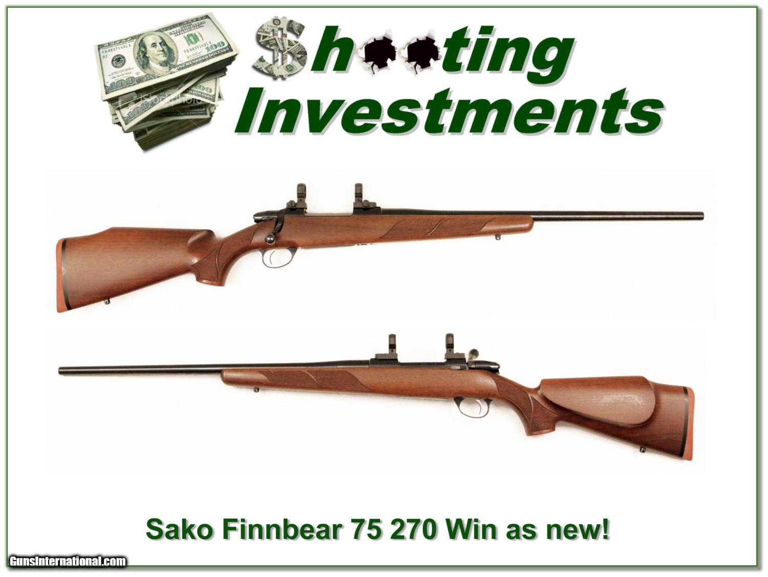 Description: Hunters and shooters this is a new condition Sako 75 in 270 Winchester. I am sure never hunted and if fired not more than a couple rounds! It is that nice. This one has the 3 lug bolt. These are known for superior accuracy and this one will make a high end and impressive hunting gun or addition to your collection. Shipping and insurance is $30 or $18 more if you want it shipped in a new Plano hard case. Please email me with any questions or larger pictures. (I now consign quality firearms only 10%! Let me know if you have any you would like to sell!) [15-0784] Payment: Payment is by Money Order, Cashiers Check or Personal Check. I can now also accept MasterCard and Visa with a 3% convenience fee. PayPal can be used for some items but never firearms. Please let us know if you would like to pay via PayPal. Shipping: The shipping charge will be listed in each description. It is $30 for most guns. Some heavy guns or those insured for over $2000 may be higher. Shipments to Alaska and Hawaii are higher because air shipment is required. Most firearms are shipped within 5 days of receipt of payment. We prefer shipping at the beginning of the week to avoid firearms in transit over weekends. We package all shipments carefully and insure them for the full purchase price, rounded up to the next $100. In the unlikely event that damage occurs, it is important that you save all packaging material for the claims process. Optics are shipped Priority Mail and most other non-firearm shipments are shipped First Class. Returns: Our return policy is simple. If for any reason you are not pleased with your purchase, you may return your item for a refund. The only exception is ammunition, it cannot be returned. It is important to us that you are happy. Guns cannot be fired or dissembled before returning them and must be returned in the same condition as received. Notification of a return must occur with-in 3 days of receipt at your dealer. Shipping, convenience and dealer fees are not refundable and are the responsibility of the buyer. Lay-a-way: If needed, we offer a 60 day lay-a-way option on most firearms. It is 1/3 now, 1/3 in 30 days and 1/3 in 60 days. Lay-a-way firearm sales are final. Consigning your firearms with Shooting Investments: We will help you get top dollar for your firearms. While most local guns shops charge 20% or more, our fee is only 10% with a minimum of $50. At your local gun shop it might take months to sell. Selling on-line provides instant access to thousands of interested buyers. You won’t find any other on-line dealer willing to sell your firearms for only 10% or listing every gun on 4 separate s. Selling through an House typically costs the seller 15% and the buyer an addition 15% (so 30%) and you have to wait several months to sell and longer to receive funds. If properly priced, we will sell your firearms in a week or two. Send us an email or give us a call and we’ll explain how easy it is for you to get top dollar. Trading: We collect guns and usually just trade for guns we want to add to our collections. We often sell guns for others wanting to purchase one of ours. We find this the most fair to both of us. Our Commission is only 10% and we hold the gun you want until yours sells. Please contact us if you want to sell one of yours to buy one of ours. Help for California Buyers: We are happy to ship to California. It is the buyer’s responsibility to make sure any item you buy is legal in your state. We are also happy to help with your purchase of a firearm from someone other than us. If you see a gun you would like to buy but the seller can’t or won’t ship to California we can help. You buy the gun and have it shipped to us. We’ll then ship it to your California dealer. The cost for this service is only $30 + shipping. Let me know if we can help! SOLD |