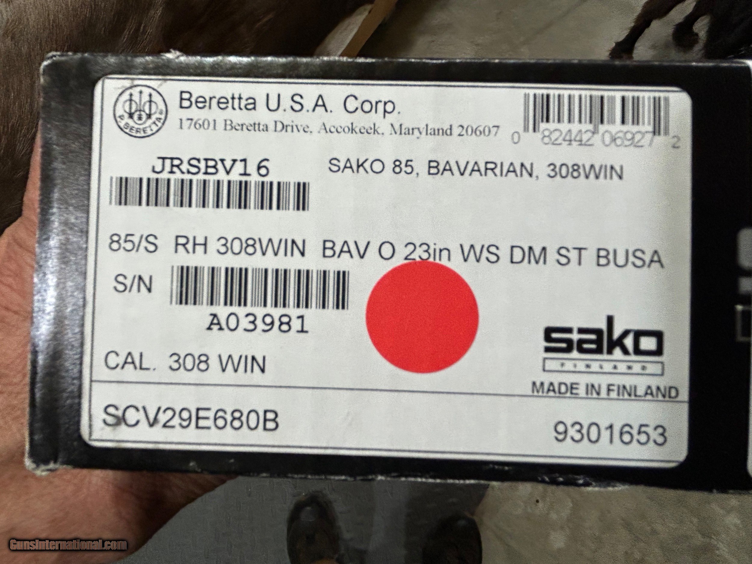 Description: Sako 85 Bavarian in 308. With box & papers. Excellent shape, almost would pass for new but for a few handling marks. Stunning wood, finish & workmanship. Set trigger, open sights. I used to be a dealer of a fairly large shop; selling some of my extra personal guns. This one was a sales rep gun, used to demo a few shots and show customers. No sales to CA, AK or HI. Pay by USPS money order or cashiers check only, MUST ship to an FFL. Will ship from an FFL. Price includes insured shipping. SOLD Rifle Caliber: .308 Winchester Manufacturer: Sako Model: 85 Bavarian Condition: 98%+ |