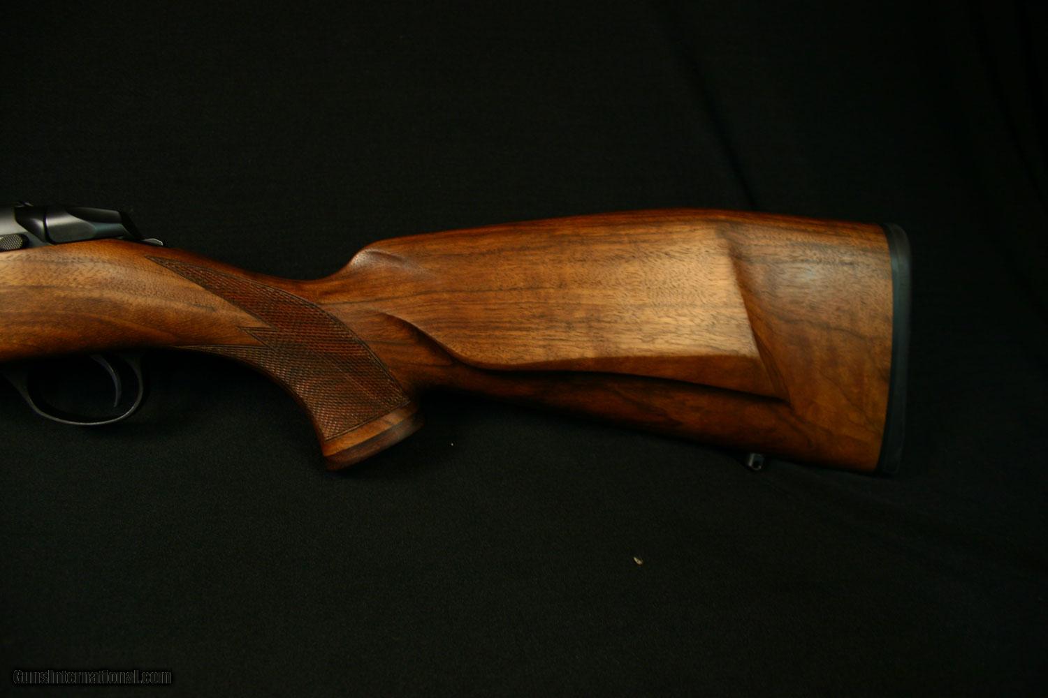 Description: Sako 85 Bavarian Carbine Rifle This full stocked hunting carbine has been developed for hunters who admire the beauty of walnut and black steel combined to a nice carrying, hard shooting hunting weapon. Comes always with adjustable iron sights and single set-trigger. Special Features include a Traditional full-length stock with rosewood snabel. The Bavarian stock design incorporates classic checkering pattern of the Sako 85 Bavarian and provides functionality and traditional looks. Other characteristics of this class model are the Bavarian cheek piece and comb. SPECIFICATIONS: Weapon: SAKO 85 Model: Bavarian Carbine Operation: Sako 85 manually operated bolt action Bolt: 3 locking lugs, control round feed, mechanical ejection Action Size: Medium Caliber: 30-06 Springfield Rate of twist: 11-in-1 Overall weight w/o accessoreis: 3.2 kg (7 lbs) Overall length: 1025 mm (40 3/8") Barrel length: 510 mm (20") Length of pull: 355mm (14") Barrel: Light hunting contour barrel (cold hammer forged) Magazine: Detachable two row staggered steel magazine Magazine capacity: 6 rounds (5 in magazine, 1 in chamber) Sights: Adjustable iron sights Optical sight attachment: Sako 85 Conical dovetail rail Metal parts surface finishing: Matte blued metal parts Stock: Bavarian carbine style matte oil walnut stock with palm swell Trigger mechanism: Single set trigger adjustable 1 to 2kg (2 to 4 lbs) Safety: Two way safety with bolt realease lever Accessories: T25 torx key, Cocking wrench, Manual FREE SHIPPING! No Credit Card Fees! SOLD |