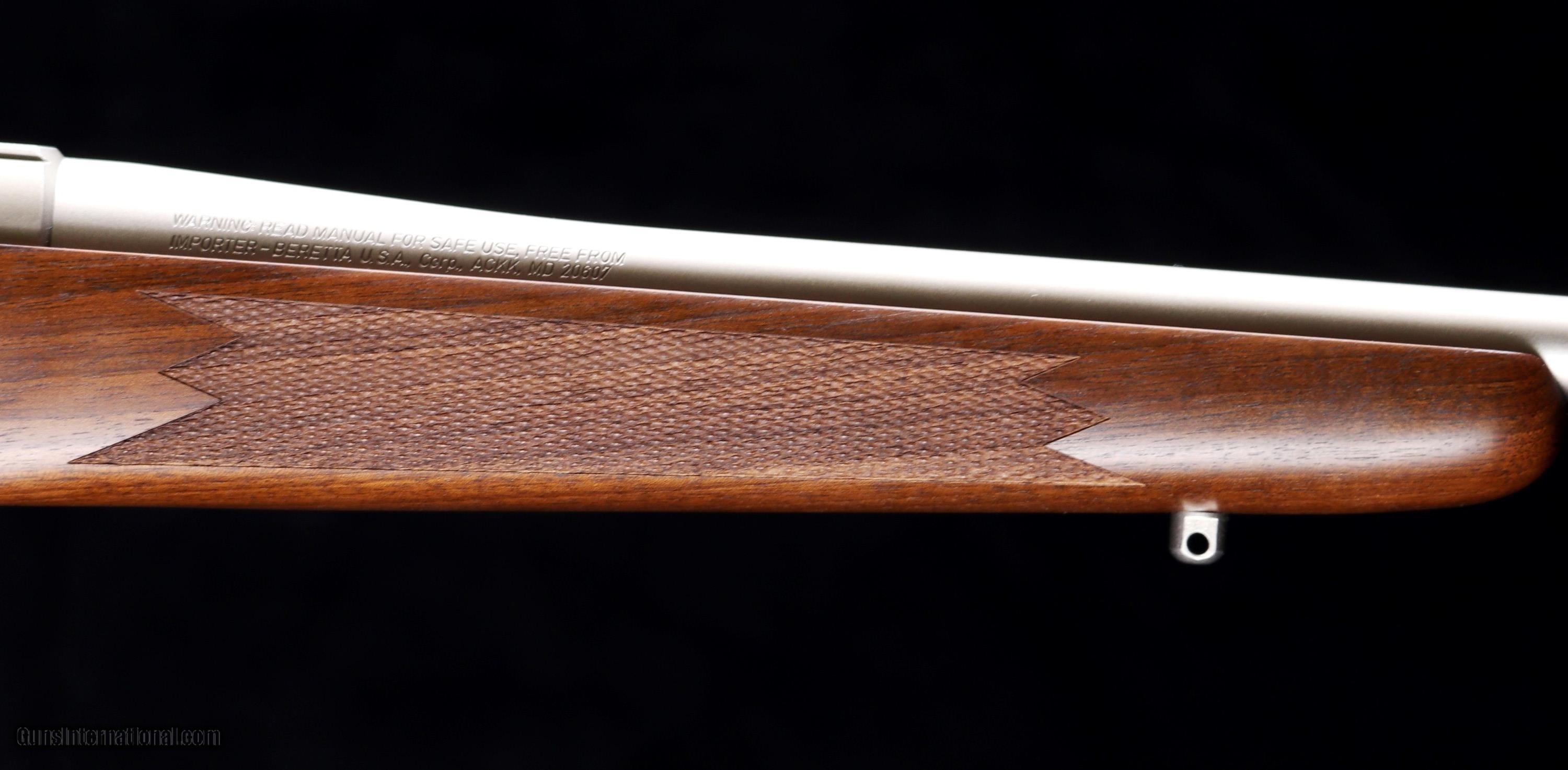 Description: The Sako 85 Hunter rifle is a mix of traditional aesthetics with modern manufacturing techniques and technology. Action Sako 85 actions come in six different sizes, providing reliable function and custom feel for each caliber. Featuring a one piece three lug bolt design and controlled cartridge feed system, the Sako 85 provides a vault like action with consistently jam free feeding. The 60? throw of the bolt handle allows for smooth rapid repeated firing. Every Sako 85 action includes integral tapered scope mounts and an extended recoil lug mounted on the inside of the for-end. The Magazines are locked in place by the Total Control Latch which prevents the magazine from being inadvertently knocked out of the rifle. Barrel Barrel blanks are drilled, honed, cold- hammer forged, and individually inspected by master gunsmiths. Twist rates are chosen for each caliber to optimize accuracy and bullet performance. All Sako 85 Classic barrels are free floated and are topped with a non-reflective finish. Trigger The Sako 85 comes with a single-stage trigger adjustable from 2 to 4 pounds. The trigger weight can easily and quickly be adjusted from within the magazine well. Stock The Sako 85 Hunter is finished with a classy and functional oil-finished walnut stock topped with a rosewood fore-end. The ergonomics of Sako’s 85 walnut stocks are built to promote the optimal shooting posture. The excellent balance of the stock enables fast, straight, and accurate operation of the rifle. For additional information, please call the Beretta Gallery at the Bass Pro Shops Memphis Pyramid. (901) 291-8250. Model: 85 Hunter Stainless Serial Number: N22193 Condition: New Manufacture Date: 2018 General Description