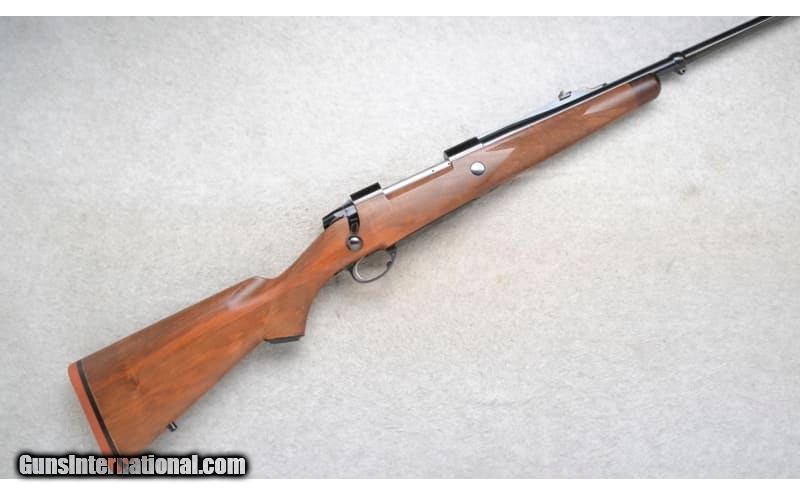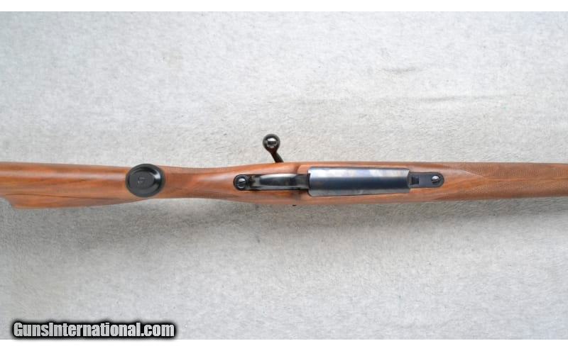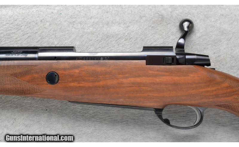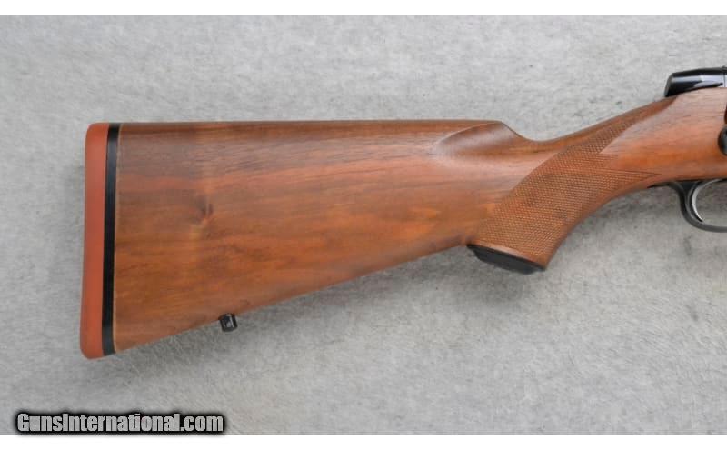 Description: This Sako Model A IV is a right hand bolt action rifle in .375 H&H Magnum Cal. It has a 24 inch barrel. A hooded raised blade front sight and a flip up two position notch middle sight. It has an integral scope mount base. The butt stock is a checkered grip walnut pistol grip with a black cap. The forearm is a checkered grip walnut with a rosewood tip. .375 H&H Magnum SOLD Chambers: Internal magazine with a hinged floorplate. Metal Condition: Excellent. Wood Condition: Excellent. Bore Condition: Excellent. Barrels: 24 inch. Stock Dimensions: LOP 13 1/2 inches. Fore End: Checkered grip walnut with a rosewood tip. Butt Pad: Old English red rubber pad. Weight: 8 lb. 4 oz. Sights: Raised hooded front blade. Flip two position notch middle. Integral scope mount base. Item Location: Richfield, WI |