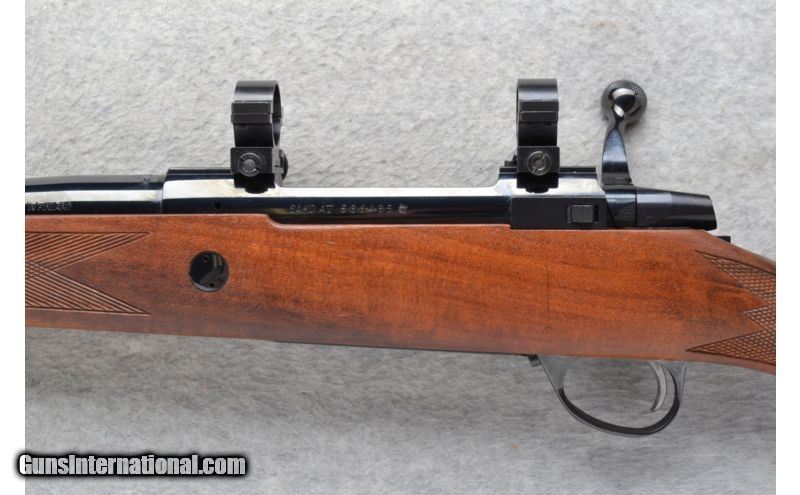 Description: This Sako Model AV is a right hand bolt action rifle in .30-06 Cal. It has a 24 inch barrel. The receiver has an integral scope mount base with rings attached. No iron sights. The stock is a checkered walnut pistol grip with a raised cheekpiece. It has a knurled bolt handle. This excellent caliber makes a very nice big game rifle and is in excellent condition. SOLD Caliber Info: .30-06 Cal. Chambers: Bolt Action 4+1 with a floorplate. Metal Condition: Excellent with a couple of minor handling marks. Wood Condition: Excellent with a couple of minor handling marks. Bore Condition: Excellent. Barrels: 24 inch gloss blue. Triggers: Grooved. Stock: Checkered walnut pistol grip with a raised cheekpiece. Stock Dimensions: LOP 13 3/4 inches. Fore End: Checkered grip walnut. Butt Pad: Sako brown rubber recoil pad. Weight: 8 lbs. 2 oz. Sights: Scope rings attached. No iron sights. Extras: Sling swivel studs. Item Location: East Grand Forks, MN |