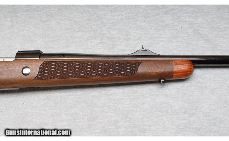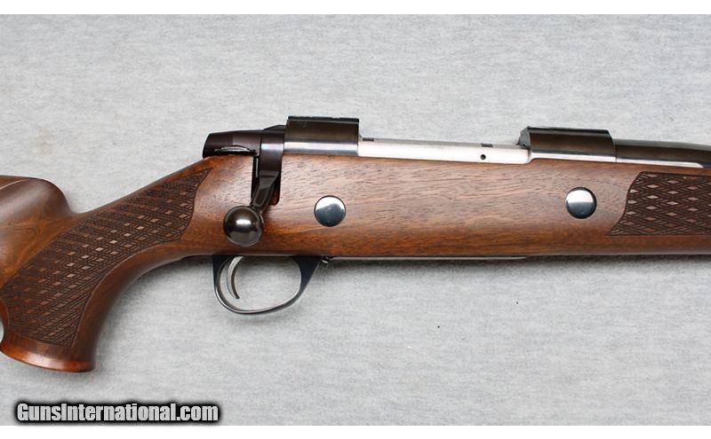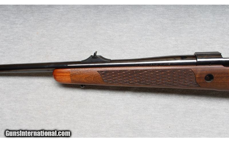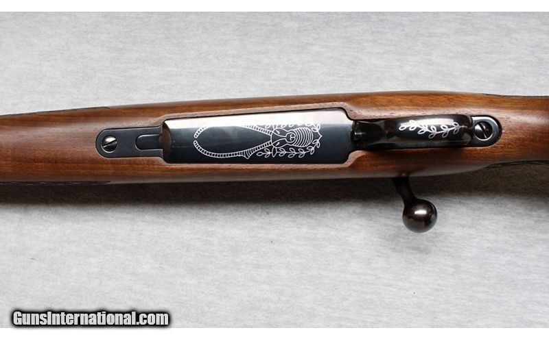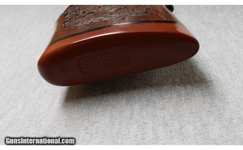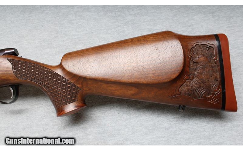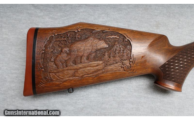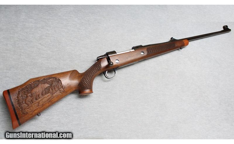 Description: Sako AV Deluxe Bolt Action Rifle in .375 H&H Magnum. This rifle features a silver inlaid antelope on floorplate, silver inlaid floral accent on trigger guard, contrasting grip cap with an inlaid bear's head, and bear scenes carved into both sides of the stock. The .375 H&H Magnum is one of the most useful all-round rifle cartridges, especially in shooting large and dangerous game. .375 H&H Magnum SOLD Metal Condition: Excellent Wood Condition: Excellent Bore Condition: Shiny - Very little wear Barrels: 24 Inches Round Triggers: Factory Stock Dimensions: LOP 14 Inches Fore End: Checkered Walnut Butt Pad: Rubber Pad Sights: Iron sights with milled scope bases Item Location: La Vista, NE |