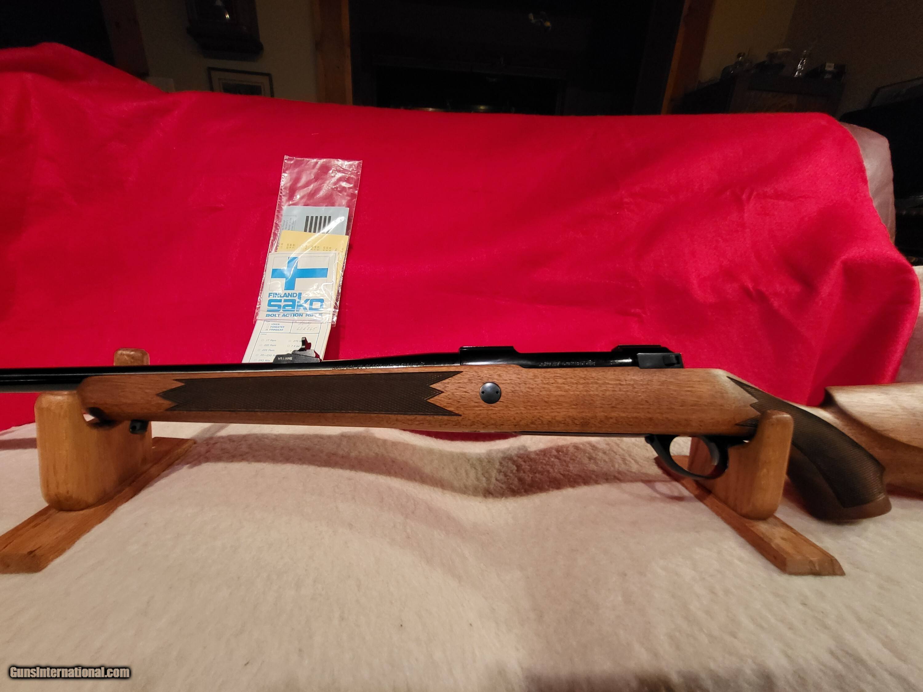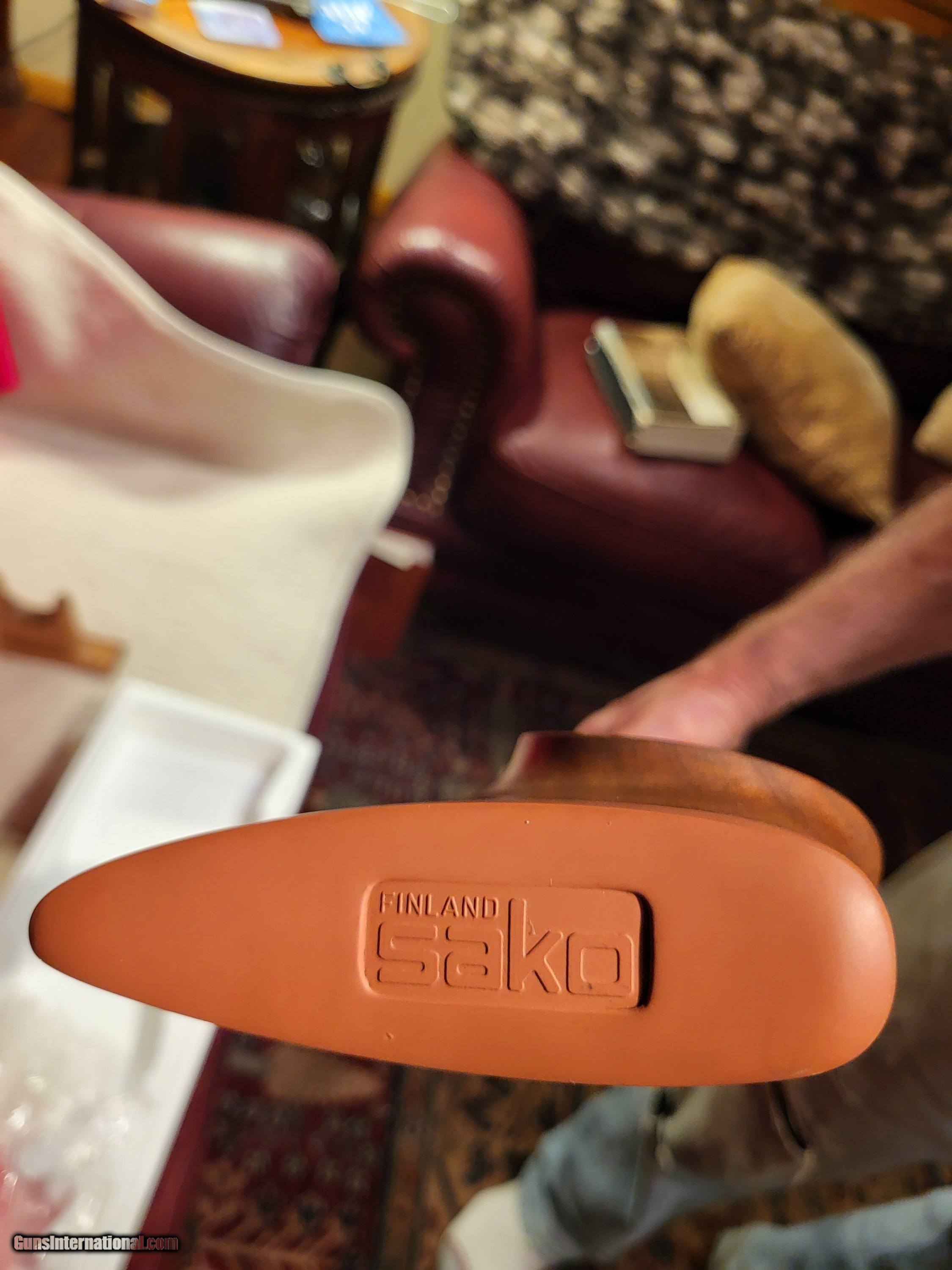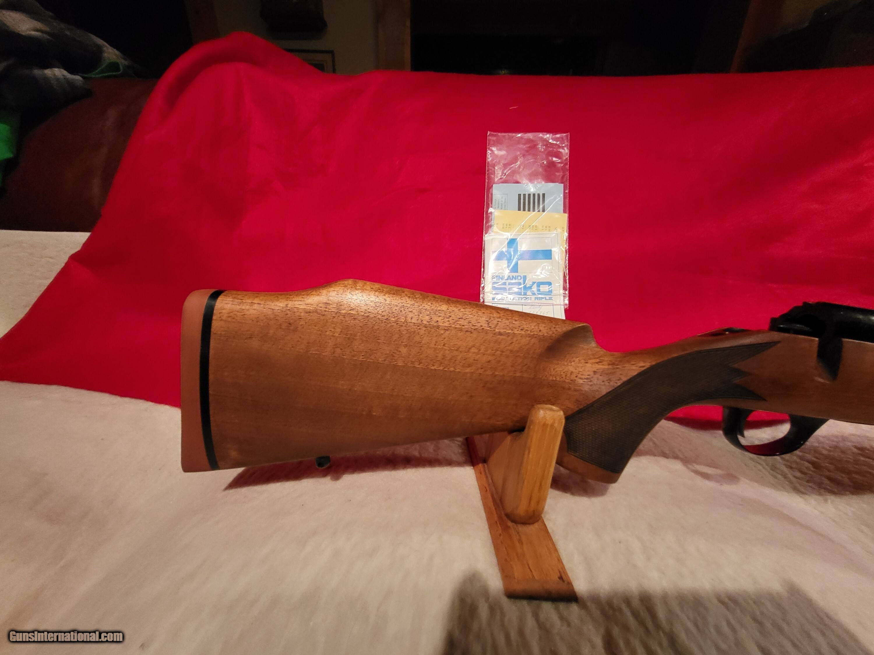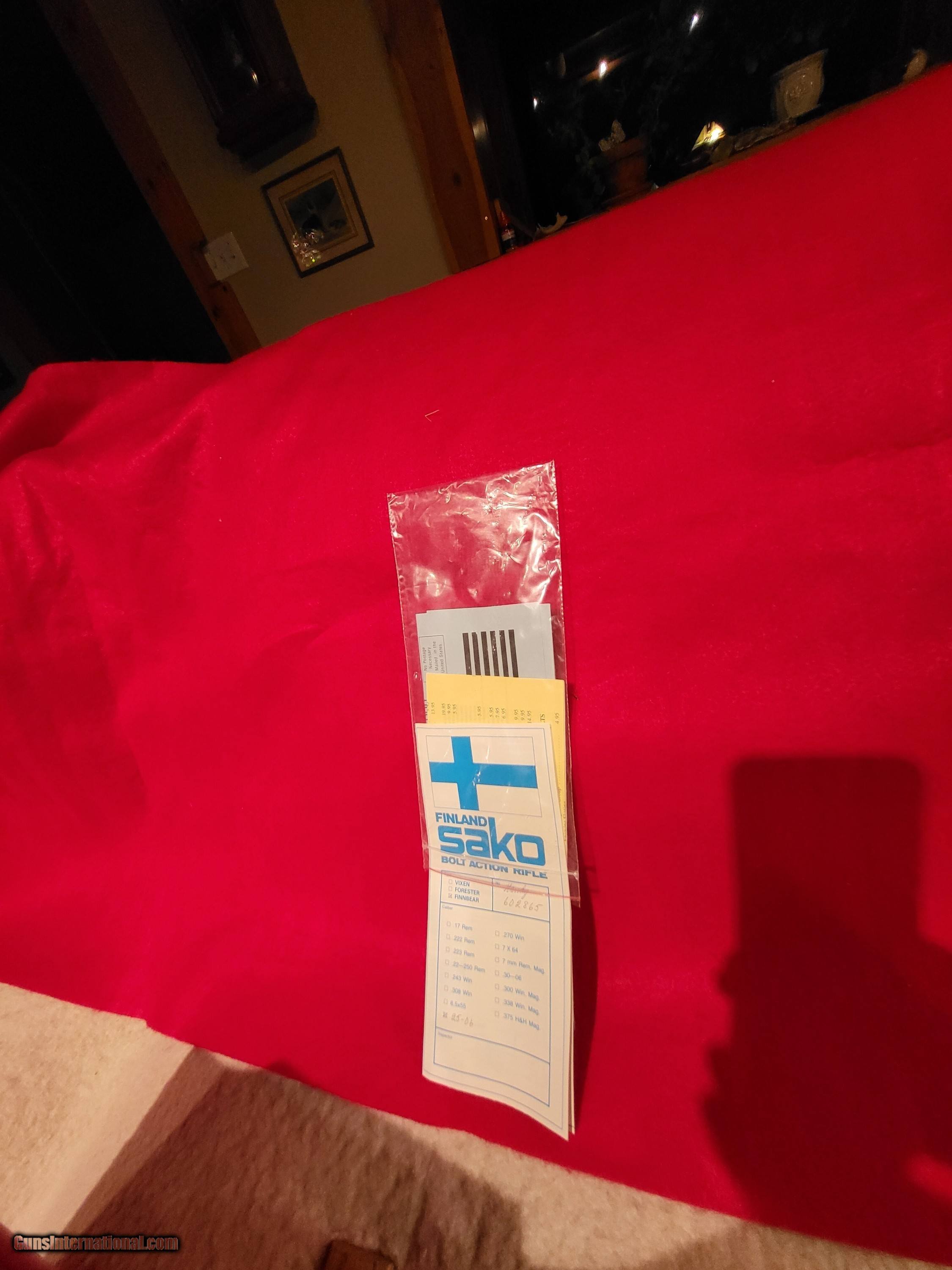 This is as new as it gets for a near 40-year old Sako rifle. These were only offered a few years in the late 80s. Please notice how fresh and clean the recoil pad is. The box is in excellent condition, with the hang tag, box label, and the serial number all matching. Note also the original plastic sleeve with emblem and the original plastic sleeve for the bolt are all in the box.