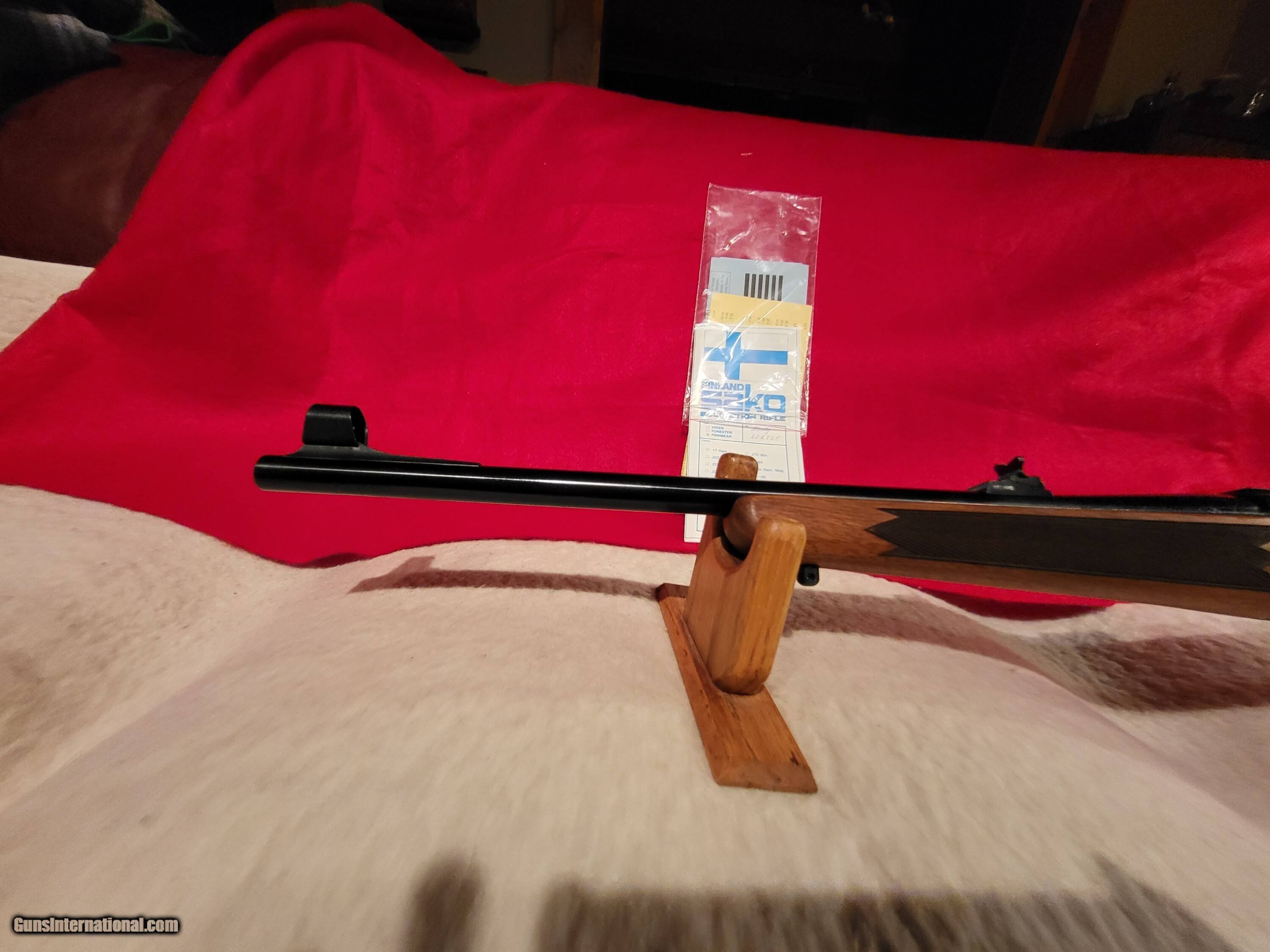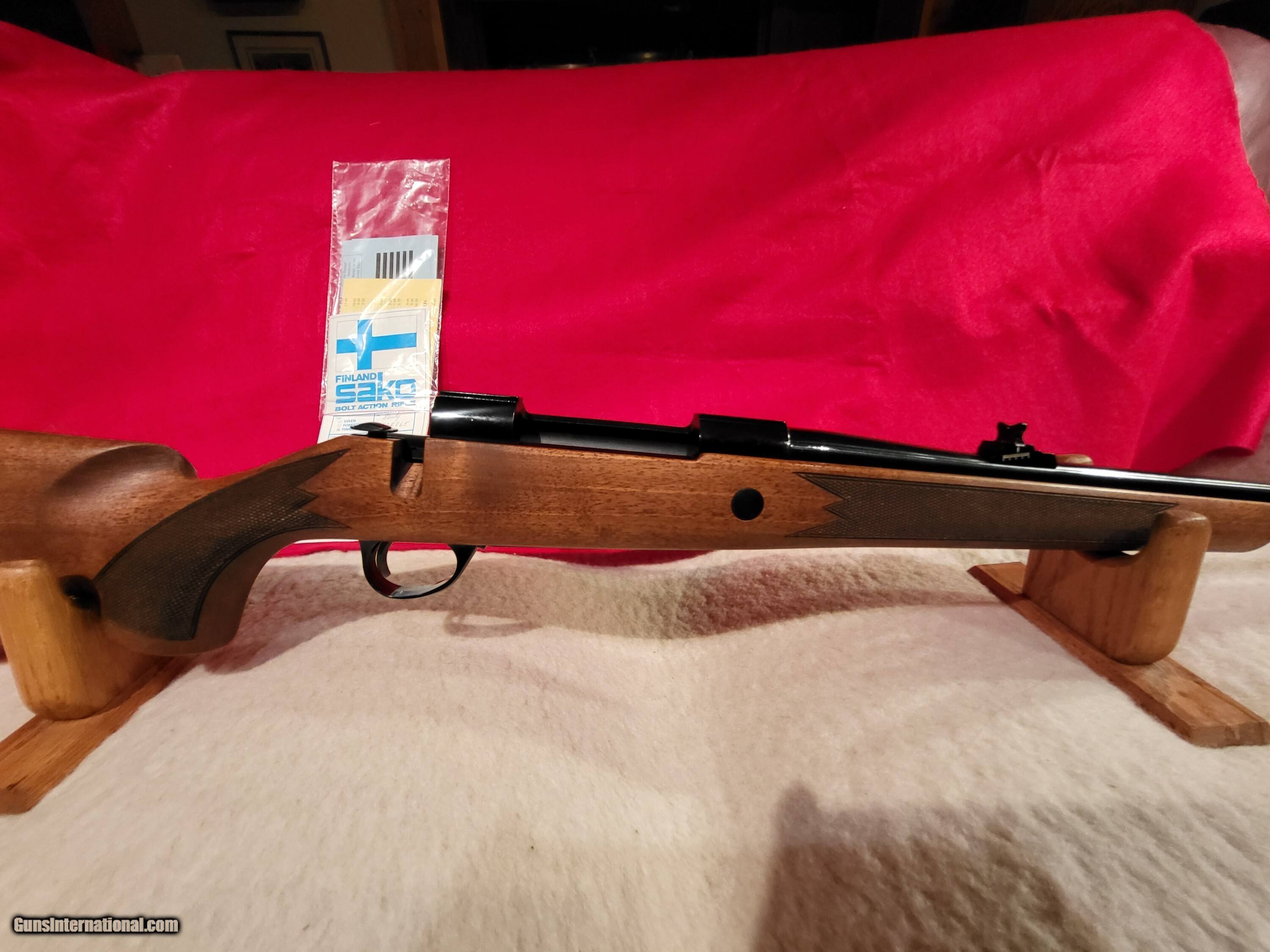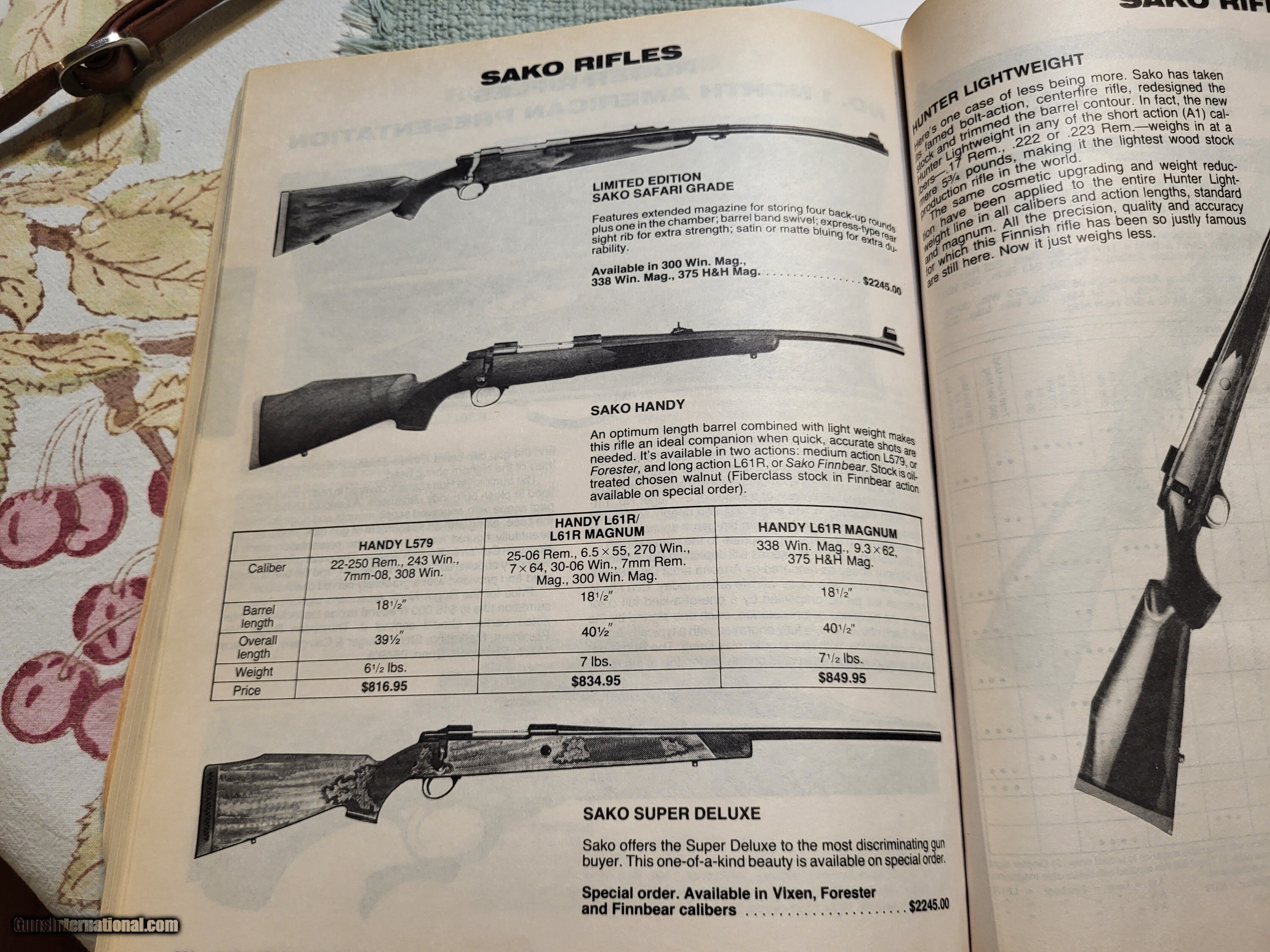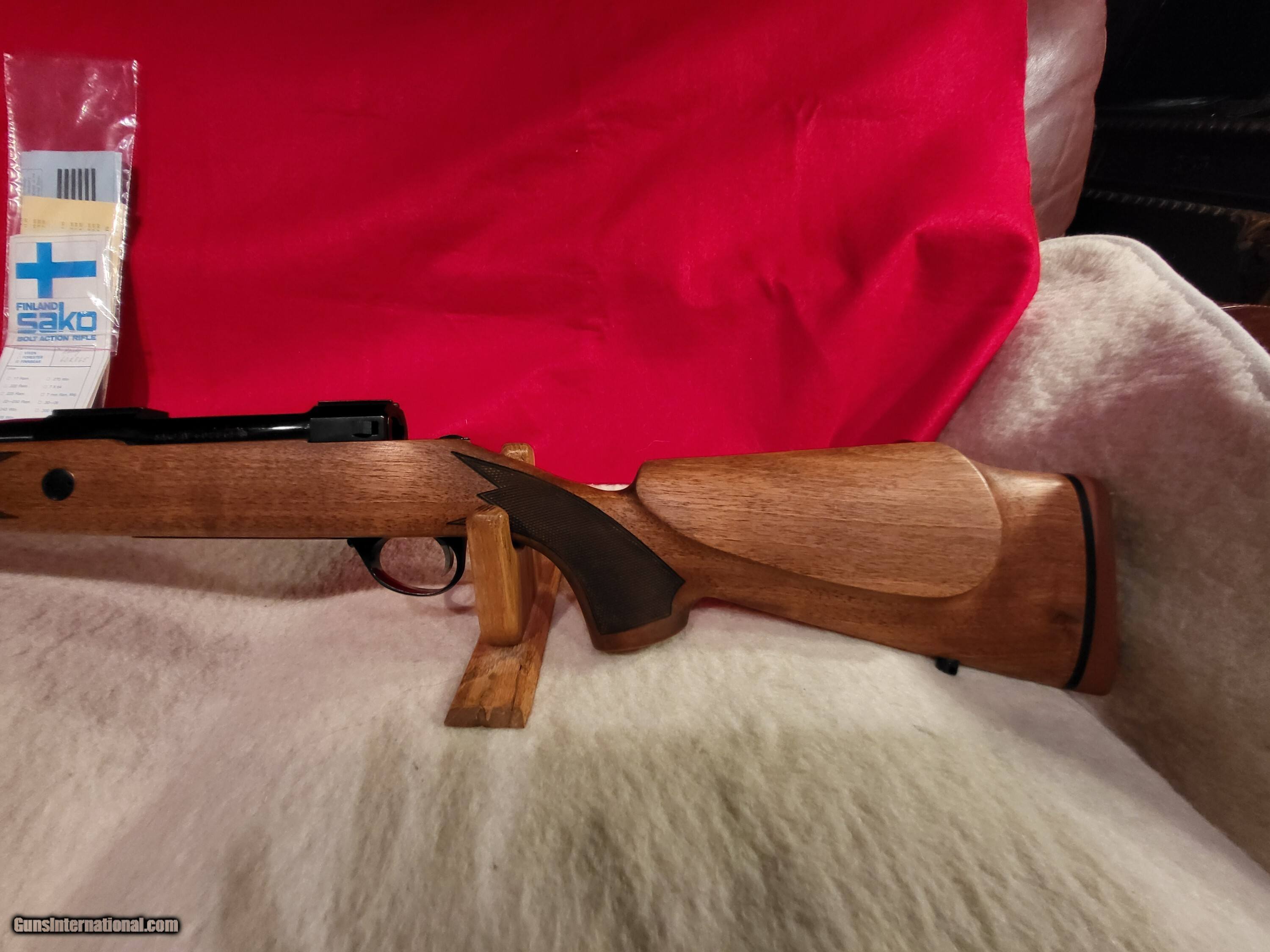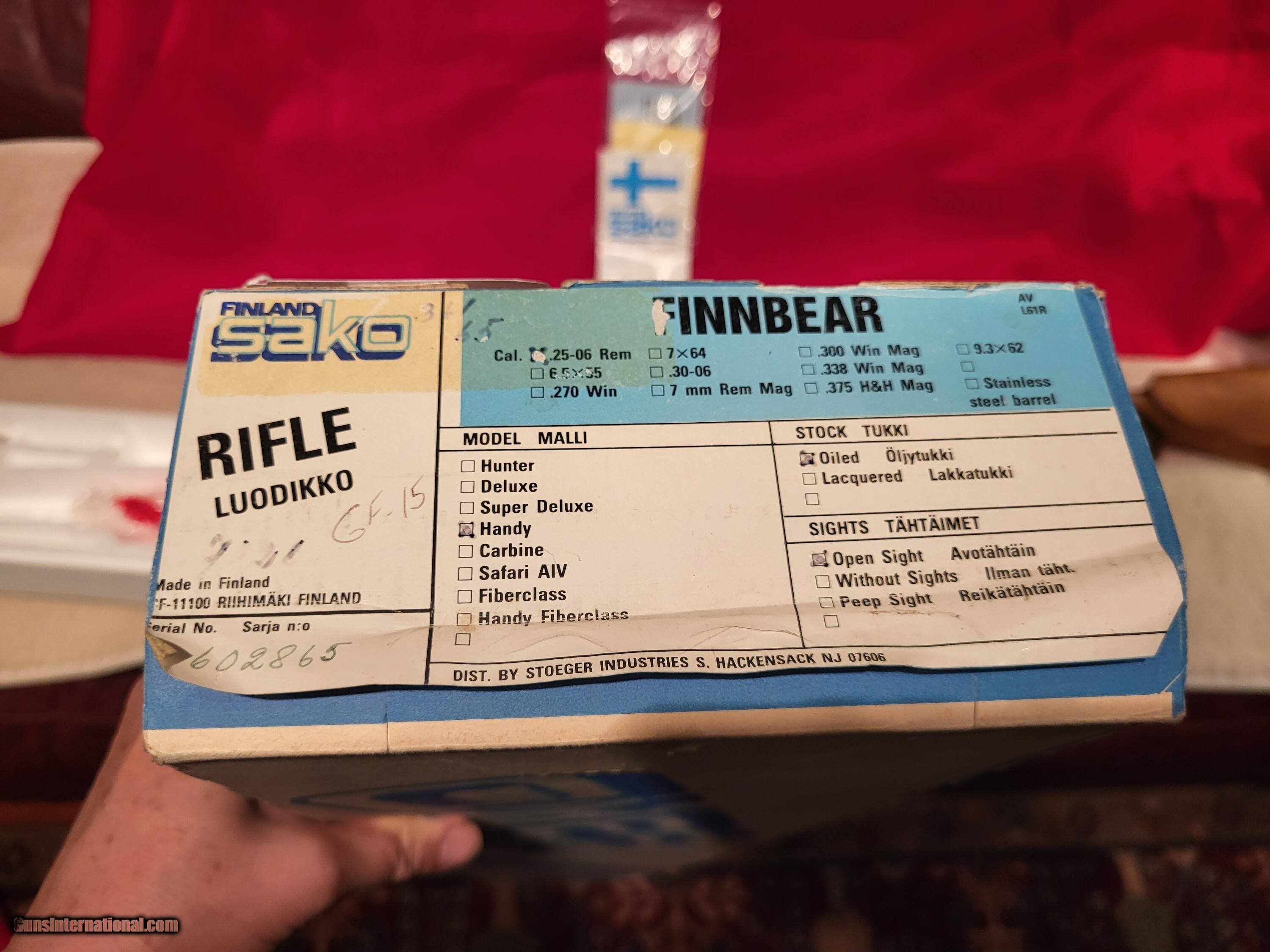 This is as new as it gets for a near 40-year old Sako rifle. These were only offered a few years in the late 80s. Please notice how fresh and clean the recoil pad is. The box is in excellent condition, with the hang tag, box label, and the serial number all matching. Note also the original plastic sleeve with emblem and the original plastic sleeve for the bolt are all in the box.
